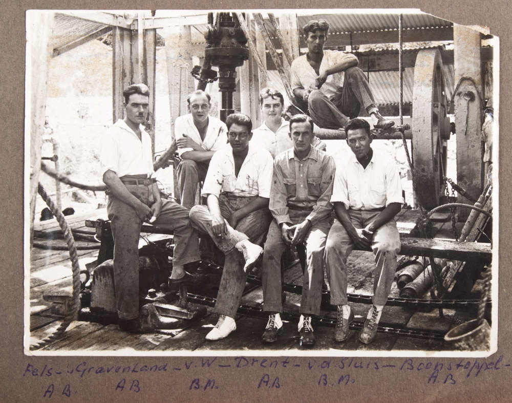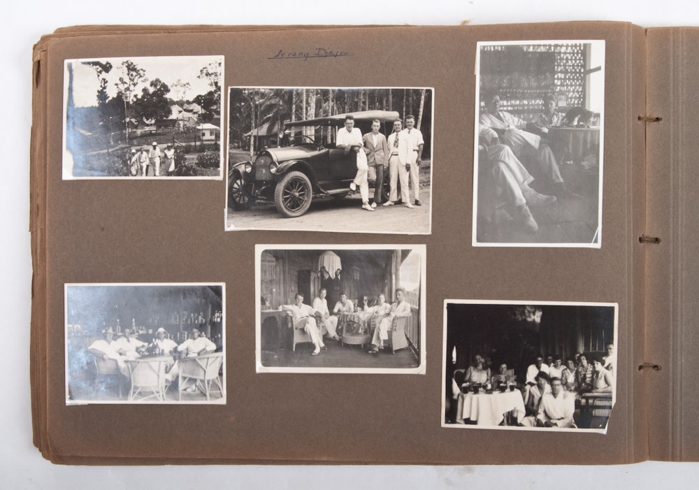 Folio oblong album, 65 p. with ca. 280 photos. From page 15 on all of these are situated in Indonesa. Photos taken in Java, Karo Highlands, Sioengi Sioer, etc. Mostly relating to oil drilling, road construction, bridge construction. Including photos of Bataksen, the Queen's celebration, the new Harley Davidson and Uppenkamp Serang Jaja.