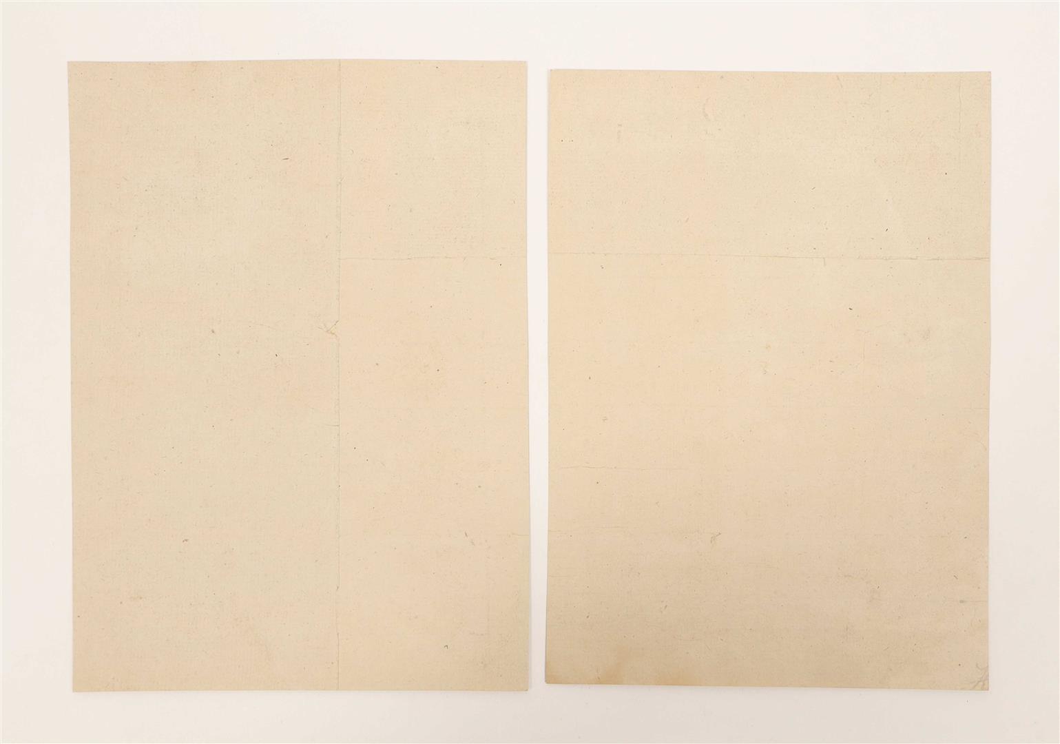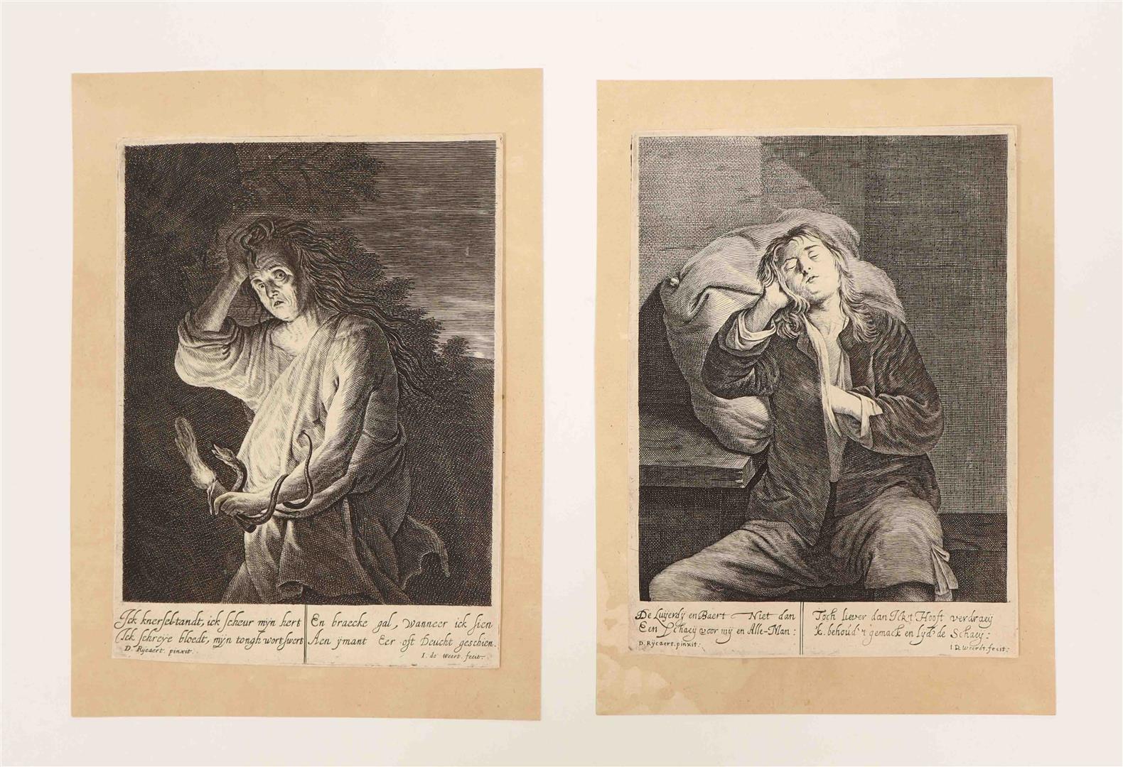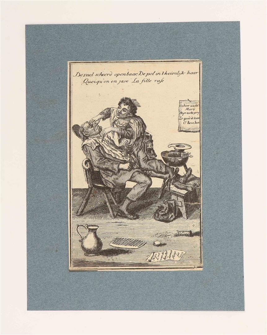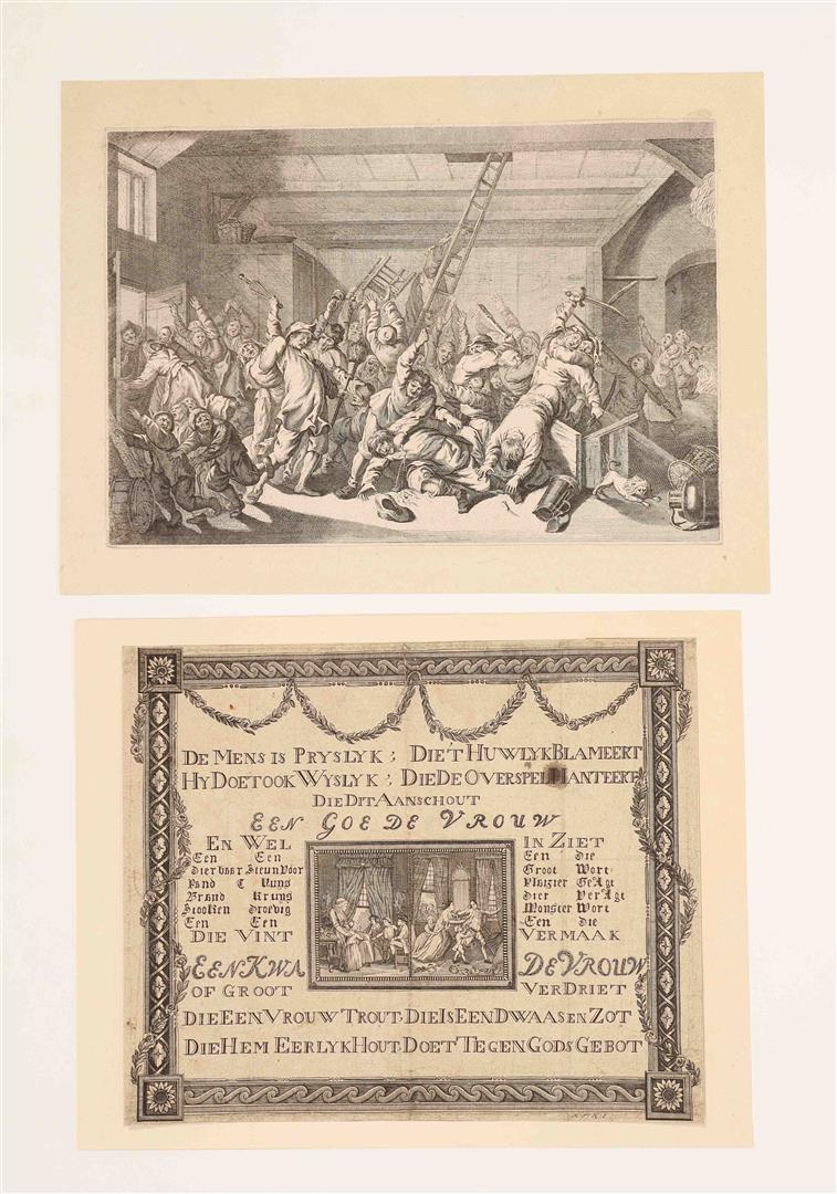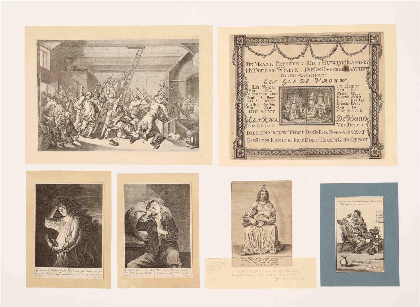 Die niet dan Reusen heeft gebaardt, Zes ellen hoog wierd zy geacht, Was van 't aeloud Enax geschlacht." 17th century engraving, 17.2 x 12 cm. Partly waterst., strip of paper mounted at lower margin, tape remnants from former mount at upper margin verso, trimmed to the plate mark. Very - if not extremely rare - engraving. Cf. Mededelingen van de Stichting Jacob Campo Weyerman, year 21 (1998), p. 64 (online available): "(...) een attraktie op de hoek van Looiersgracht en Prinsengracht, een doolhof met een panopticum, waarin beelden waren te zien die met de ogen konden rollen. Naast het beeld van Goliath, dat tegenwoordig staat opgesteld in het restaurant van het Amsterdams Historisch Museum, stond destijds Vrouw Walburg, de mythische Haagse reuzin die haar kind de borst gaf, en daardoor werd aangezien voor filistijnse echtgenote." (2) "De mens is pryslyk, Hy doet ook Wyslyk, Die 't huwelyk blameert, Die de overspel hanteert. (...) Die een vrouw trout, Die hem eerlyk hout, Die is een dwaas en zot, Doet tegen Gods gebod." Engraving, 25 x 30.4 cm, late 18th cent., monogrammed "M.T.H.S." in lower margin. Fully mounted, smoothed vertical folds, brown stain in the text. Very rare allegorical print on the difference between a good and bad marriage. (3) "De snot scheerd openbaar; De pot in 't heimelijk haar (...)". Etching, 15 x 9.5 cm, ca. 1713, mounted at upper margin. On the floor is a piece of paper w. the text: "Niew lied van de Amsterdamse meysjes 1713." Two sm. closed tears, remnants of former mount at lower corners verso, trimmed to the plate mark. -and 3 others.