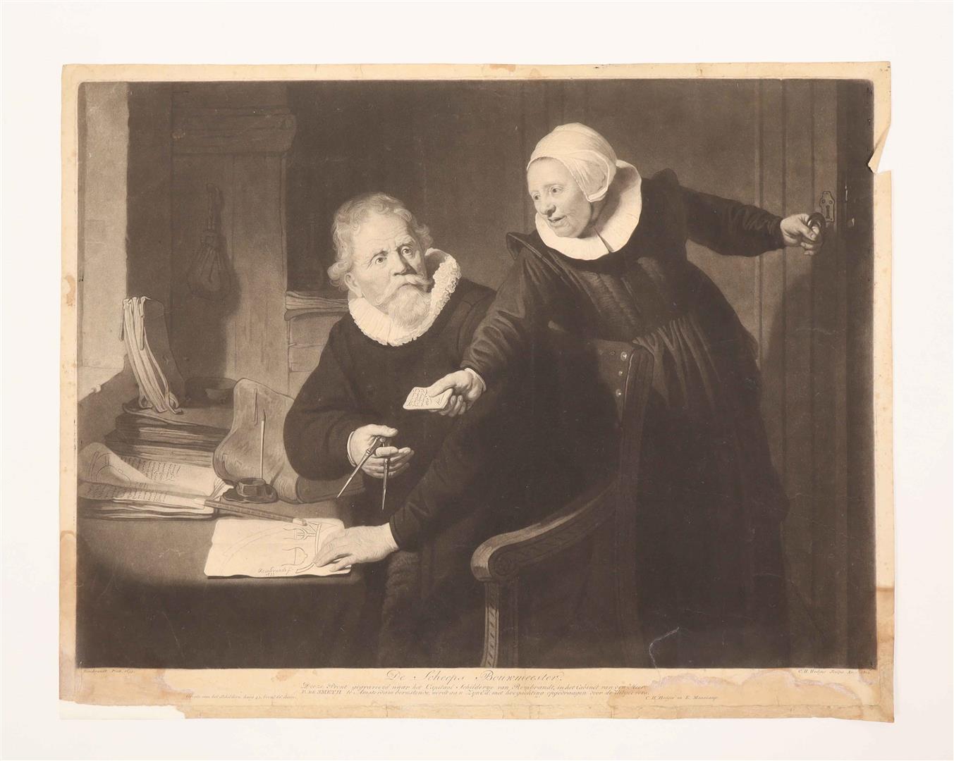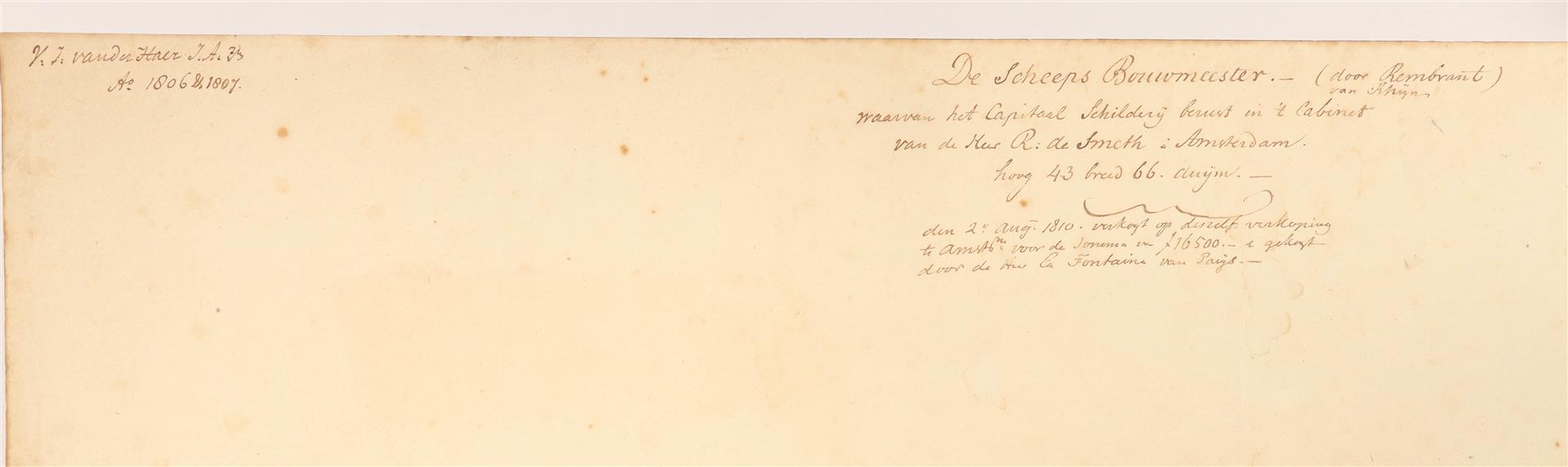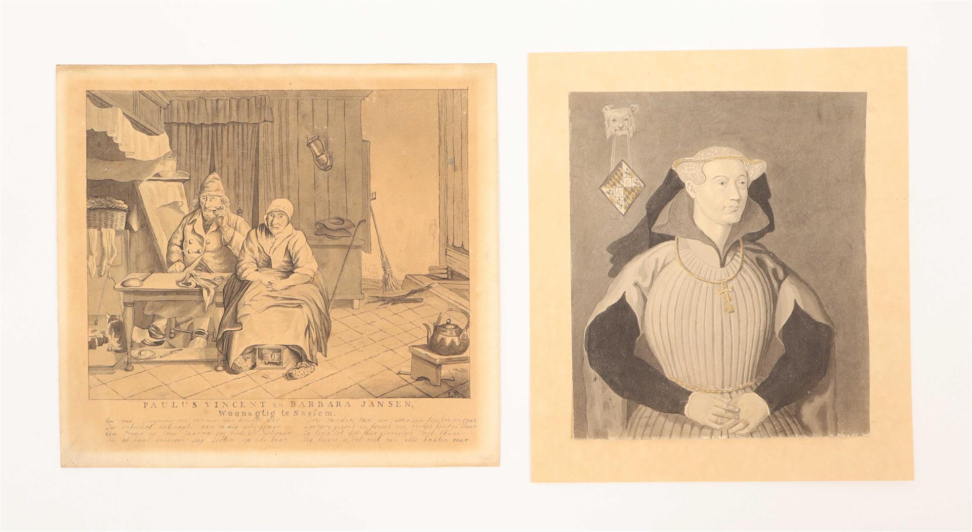 Drawing in grey ink, grey wash, after the print (1794) by Izaak Jansz. de Wit (1744-1809). 23 x 25 cm. Monogrammed "LR" in lower right corner, w. caption and 8-line poem below the image. Evenly browned. The Rijksmuseum decription of the print: "Het echtpaar is afgebeeld wegens hun hoge leeftijd: op het moment van de vervaardiging van de prent in 1794 is Paulus Vincent 104 jaar oud en Barbara Jansen 102 jaar oud." (2) V.J. van der Haer (ca. 1800). "De Scheeps Bouwmeester". Drawing in pen and black ink, cont. copy after the mezzotint of equal size (1802) by Charles Howard Hodges (1776-1837) based on the painting by Rembrandt (1633). 40 x 55 cm. Signed and dated "V.D. Haer F. 1807" in lower right corner. Mounted at upper margin. Light surface wear, a few thin spots and minor stains. Verso signed and dated "V.J. van der Haer J.A. Zn. Anno 1806 & 1807" and w. description in pen: "(...) waarvan het capitaal schilderij berust in het cabinet van de Heer R. de Smeth à Amsterdam (...). Den 2e Aug. 1810 verkogt op deszelf. verkoping te Amst.m. voor de somma van f. 16500,- & gekogt door de Heer La Fontaine van Parijs." A mediocre copy of the print is also present in the lot. -and 2 others: a 19th cent. anonymous portrait of Jacoba van Beieren after a 15th cent. painting in the Rijksmuseum (w accomp. card dep. the painting), and a large 19th cent. drawing dep. (according to an annotation in pencil verso) "Pierre le Turc [Le Turcq, real name Ghyslain du Plessis, see Wikipedia] Pirate of Flissingue 1783".