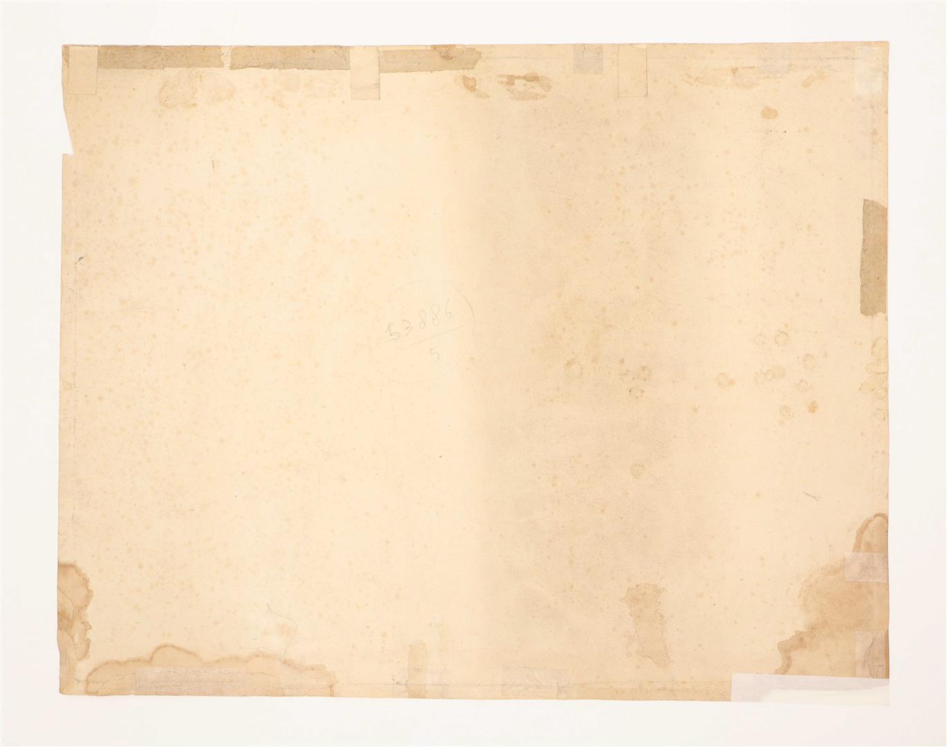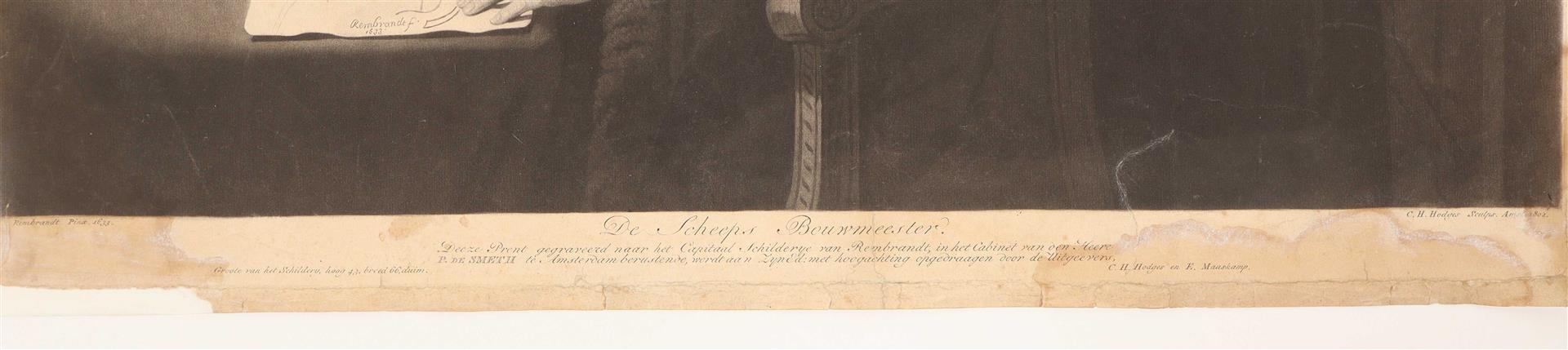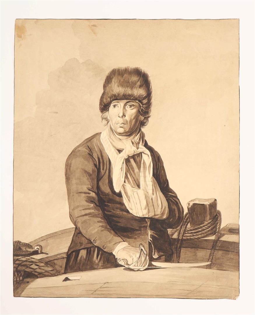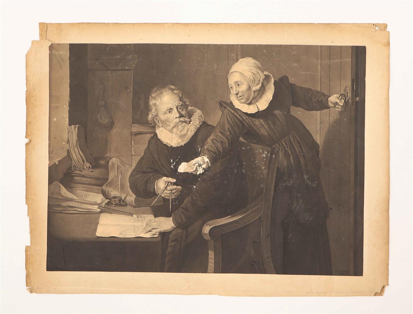 Drawing in grey ink, grey wash, after the print (1794) by Izaak Jansz. de Wit (1744-1809). 23 x 25 cm. Monogrammed "LR" in lower right corner, w. caption and 8-line poem below the image. Evenly browned. The Rijksmuseum decription of the print: "Het echtpaar is afgebeeld wegens hun hoge leeftijd: op het moment van de vervaardiging van de prent in 1794 is Paulus Vincent 104 jaar oud en Barbara Jansen 102 jaar oud." (2) V.J. van der Haer (ca. 1800). "De Scheeps Bouwmeester". Drawing in pen and black ink, cont. copy after the mezzotint of equal size (1802) by Charles Howard Hodges (1776-1837) based on the painting by Rembrandt (1633). 40 x 55 cm. Signed and dated "V.D. Haer F. 1807" in lower right corner. Mounted at upper margin. Light surface wear, a few thin spots and minor stains. Verso signed and dated "V.J. van der Haer J.A. Zn. Anno 1806 & 1807" and w. description in pen: "(...) waarvan het capitaal schilderij berust in het cabinet van de Heer R. de Smeth à Amsterdam (...). Den 2e Aug. 1810 verkogt op deszelf. verkoping te Amst.m. voor de somma van f. 16500,- & gekogt door de Heer La Fontaine van Parijs." A mediocre copy of the print is also present in the lot. -and 2 others: a 19th cent. anonymous portrait of Jacoba van Beieren after a 15th cent. painting in the Rijksmuseum (w accomp. card dep. the painting), and a large 19th cent. drawing dep. (according to an annotation in pencil verso) "Pierre le Turc [Le Turcq, real name Ghyslain du Plessis, see Wikipedia] Pirate of Flissingue 1783".