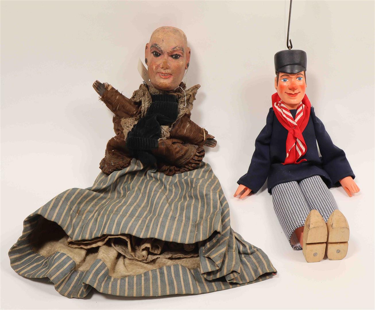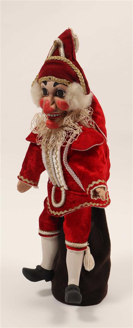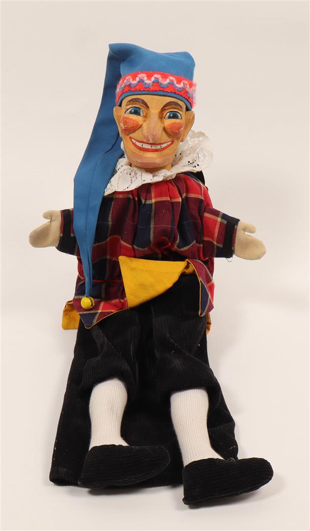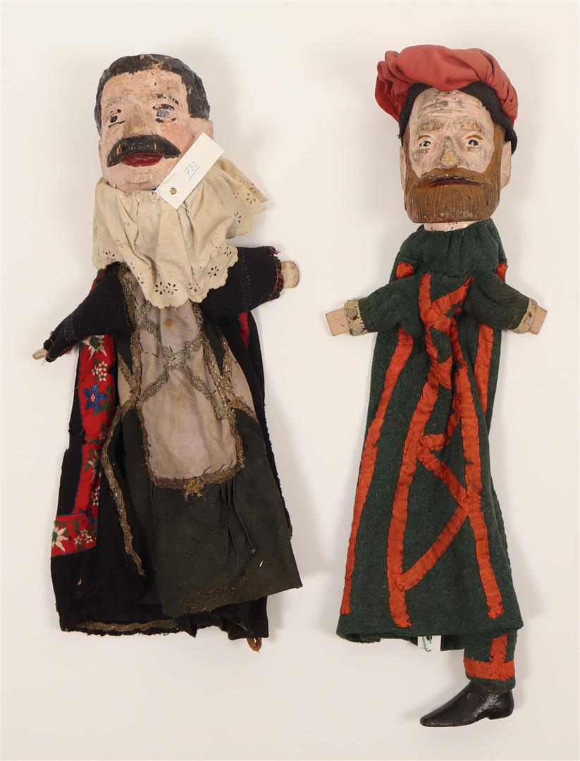 Hand puppet, height 53 cm, w. carved and painted wooden head, otherwise entirely of cloth. (2) Mr. Punch. Hand puppet, height 53 cm, carved and painted wooden head, hands and legs, richly dressed in red velvet w. use of gold thread. -and 4 nice older hand puppets, all w. carved and painted wooden heads (sl. worn/ signs of age. Added: wooden puppet in Dutch tradition dress, height 46 cm, w. metal hanging rod.