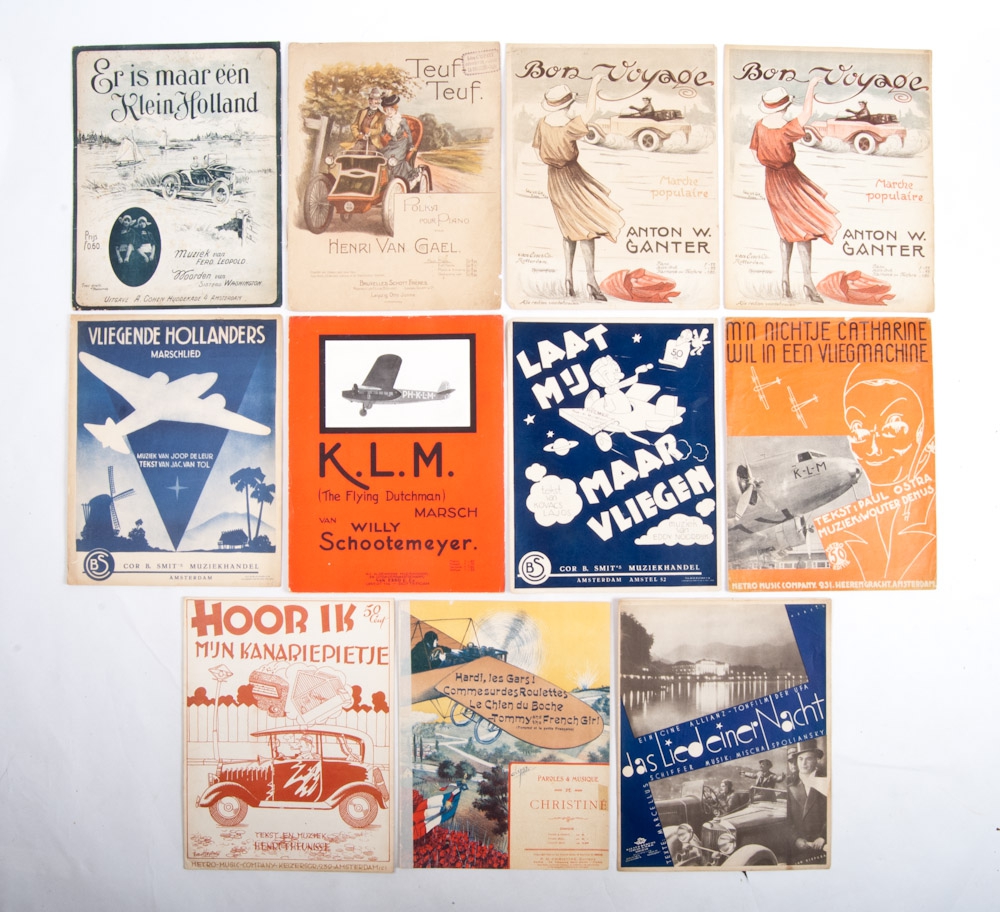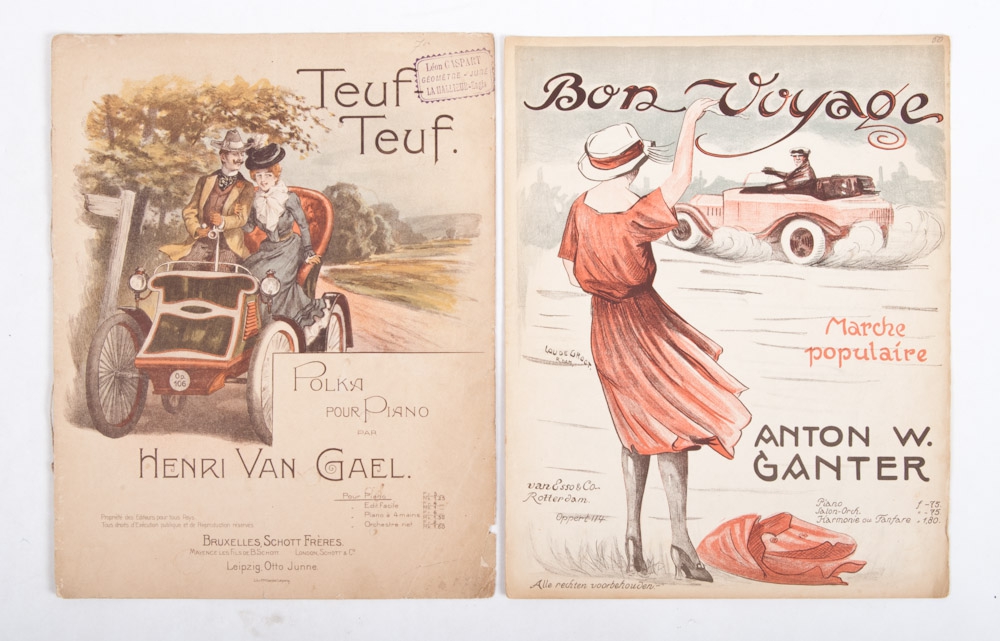 Teuf Teuf. Polka pour Piano par Henri Van Gael. Bruxelles, Schott Freres. Lith. F.M. Geidel Leipzig, 1902. Stamp front, sl. rubbed. + Bon Voyage. Marche populaire Anton W. Ganter. lith. Lou de Groot. Edition Esso & Co, Rotterdam (2x) - and 3 others relating to automobilia + Hardi, les Gars! Comme sur des Roulettes le Chien du Boche - Tommy and the French Girl. Clérice freres, 1911. Restored along edge. - and 4 others relating to Aviation.