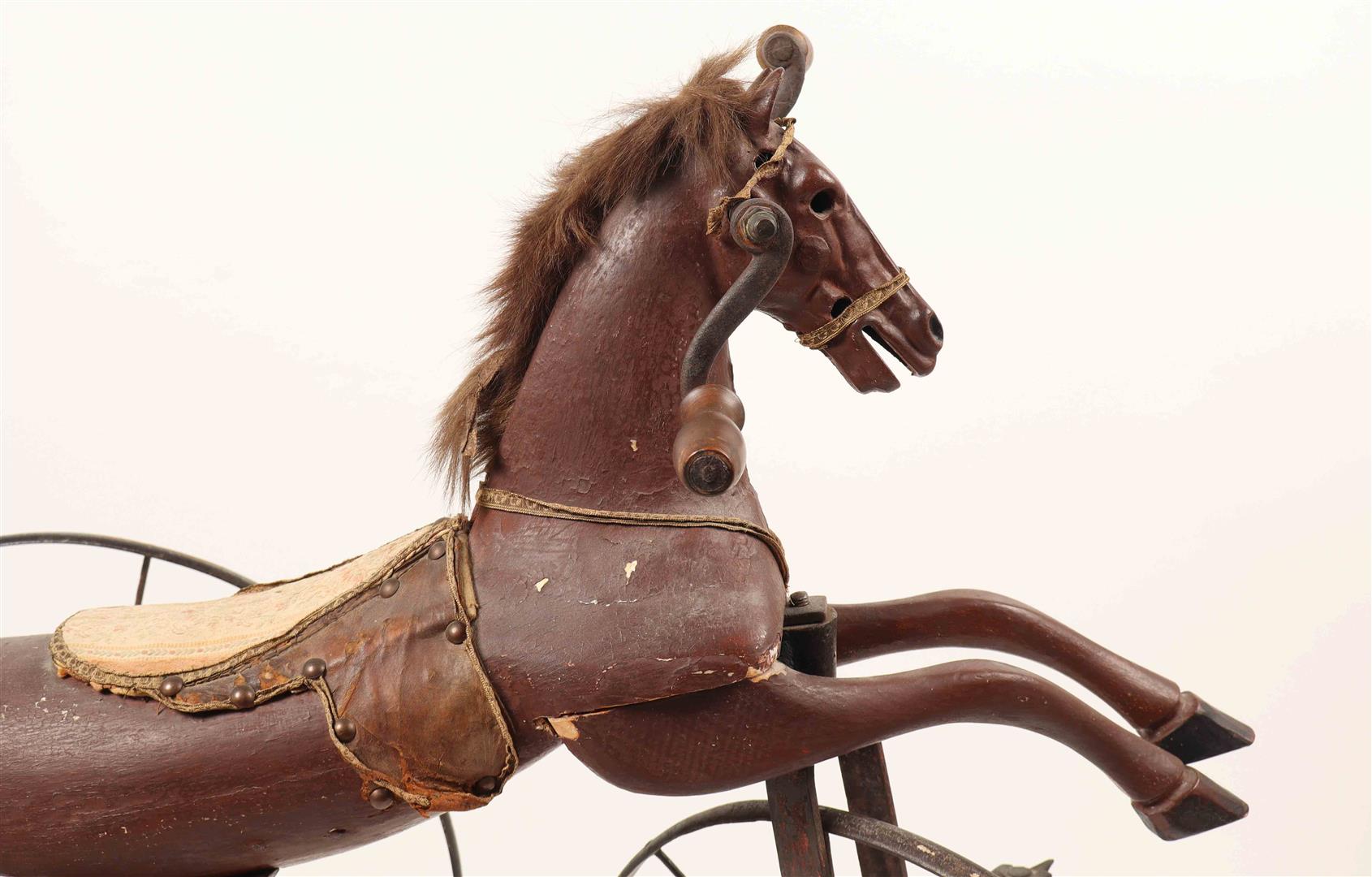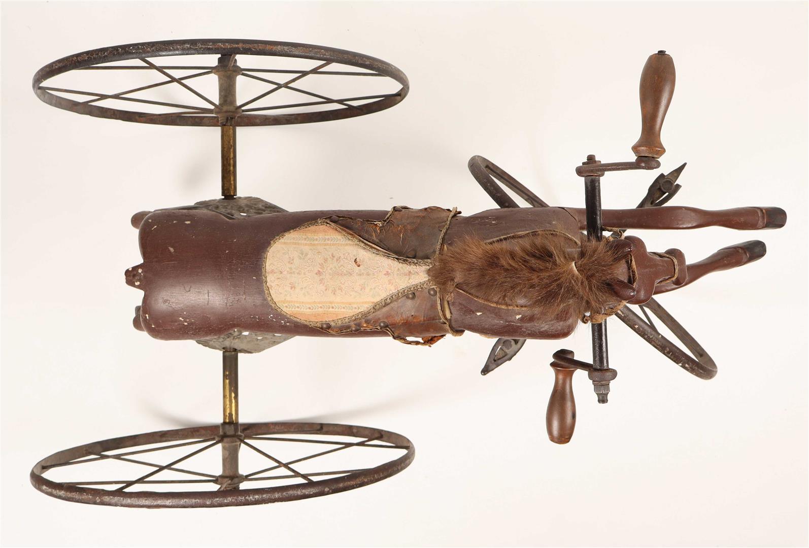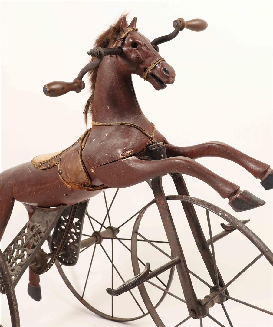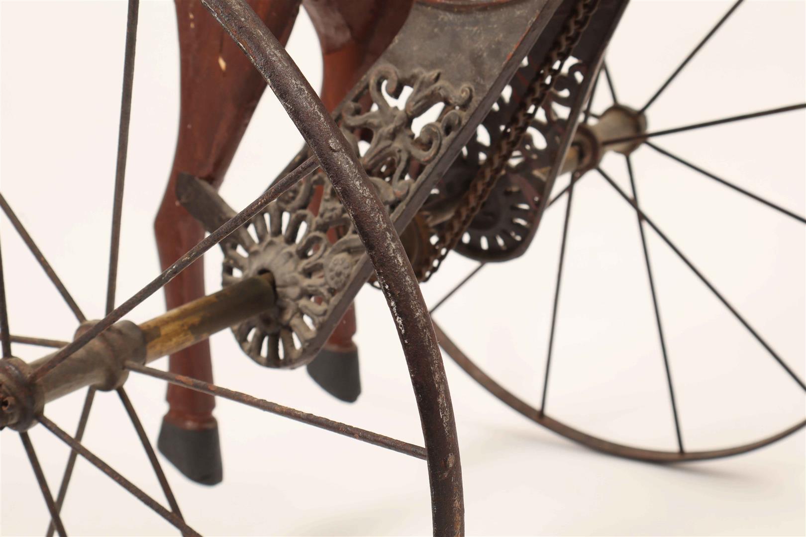 France, late 19th-cent. Painted wood and wrought iron and leather saddle. W. hand crank mechanism turning the rear wheels. H. 72, w. 50, l. 80 cm.