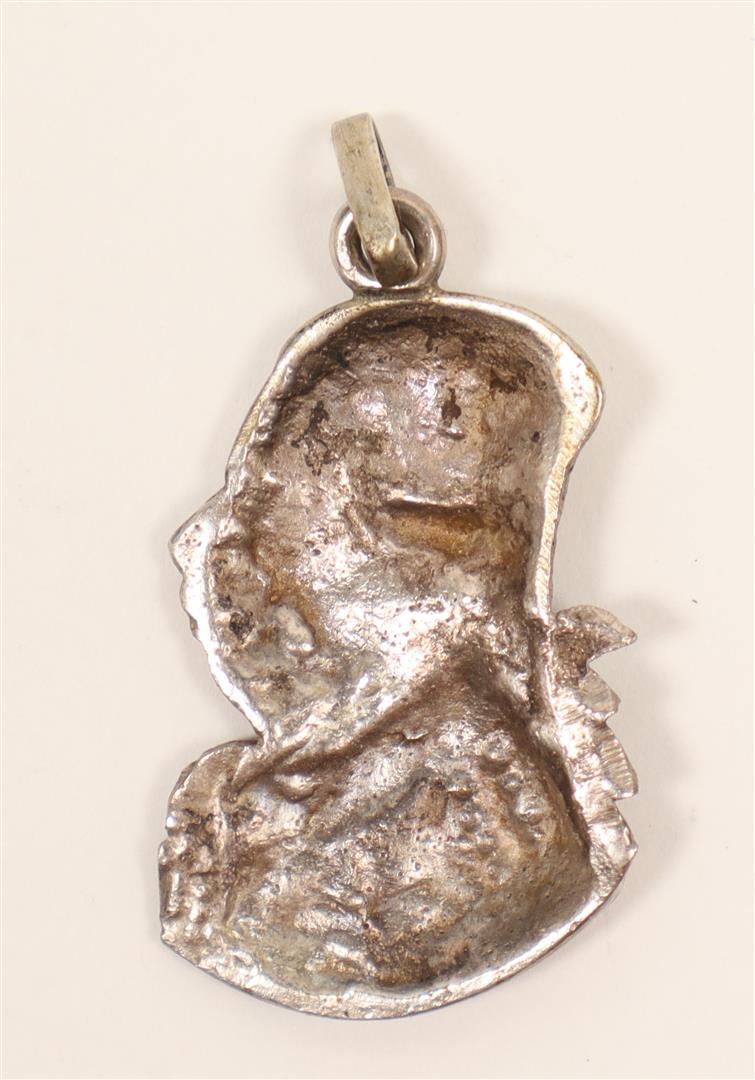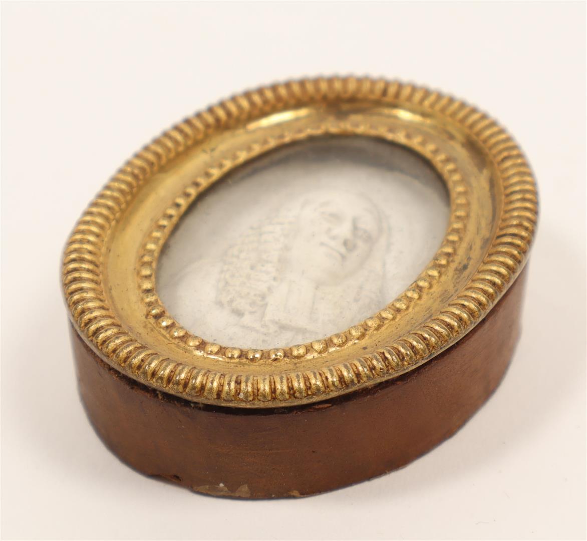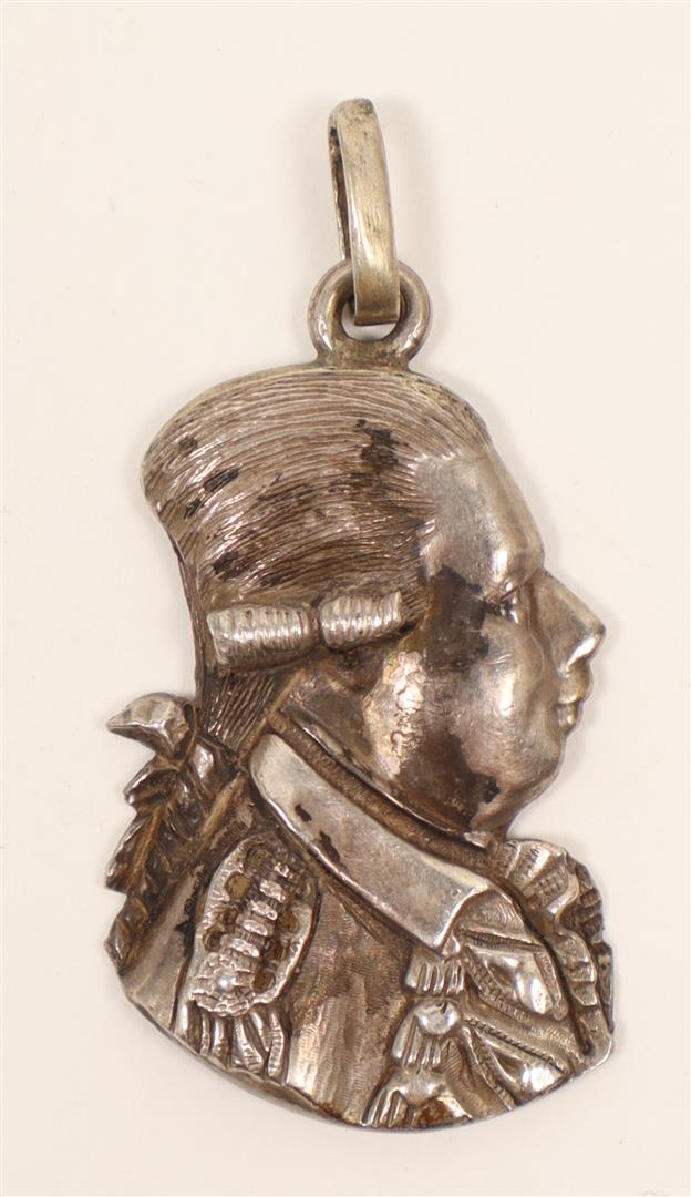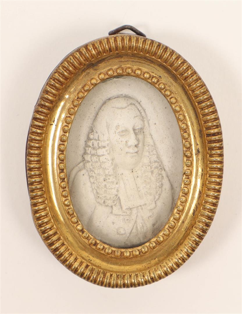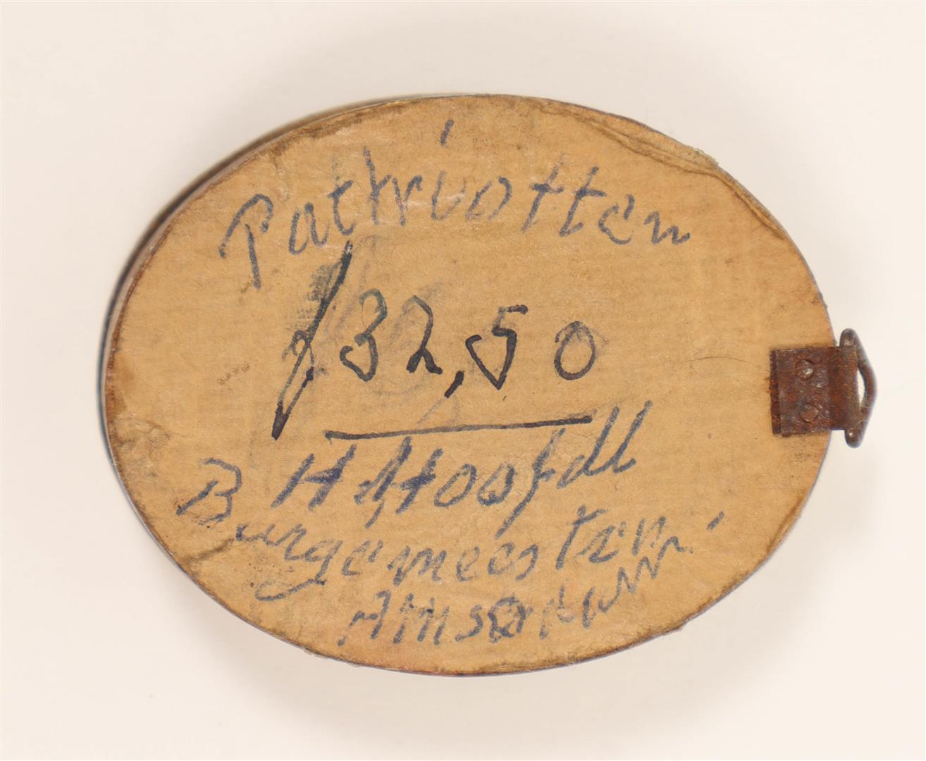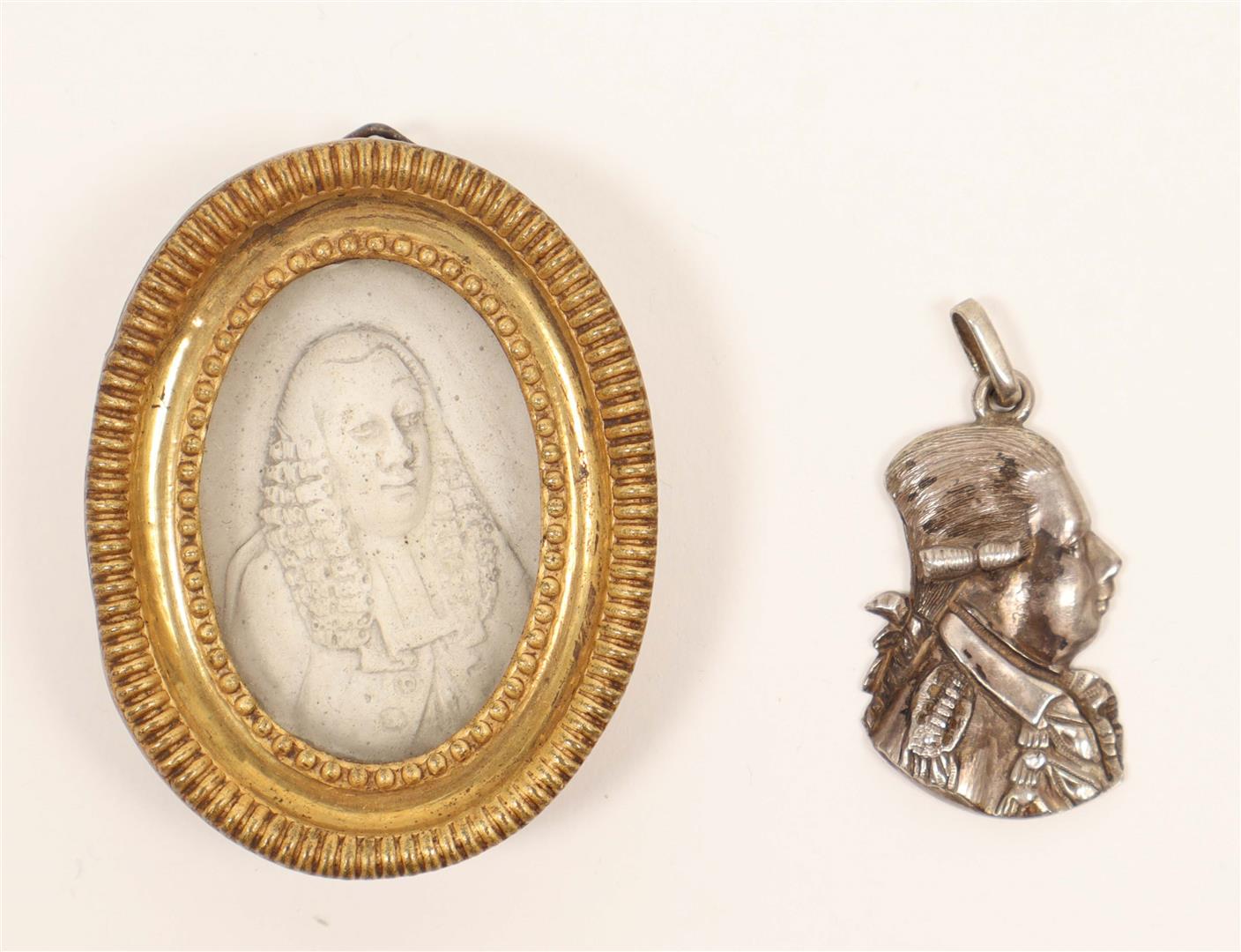 Cast gypsum in relief, ca. 4 x 3 cm. (oval), ca. 1787. In orig. frame w. annotation in ballpoint verso. Hendrik Danielsz. Hooft was an Amsterdam regent who became mayor of the city in 1769, and served seven more terms between 1774 and 1787. He joined the Patriot (Patriotten) faction who opposed the rule of the stadtholder, William V, Prince of Orange, whose supporters were known as Orangists (Orangisten). After 1787 his portrait was reproduced in various materials and the Patriots celebrated his birthday up to his death. -and a silver Orangist badge showing the bust of Stadhouder Willem V, ca. 1787, height 3 cm.