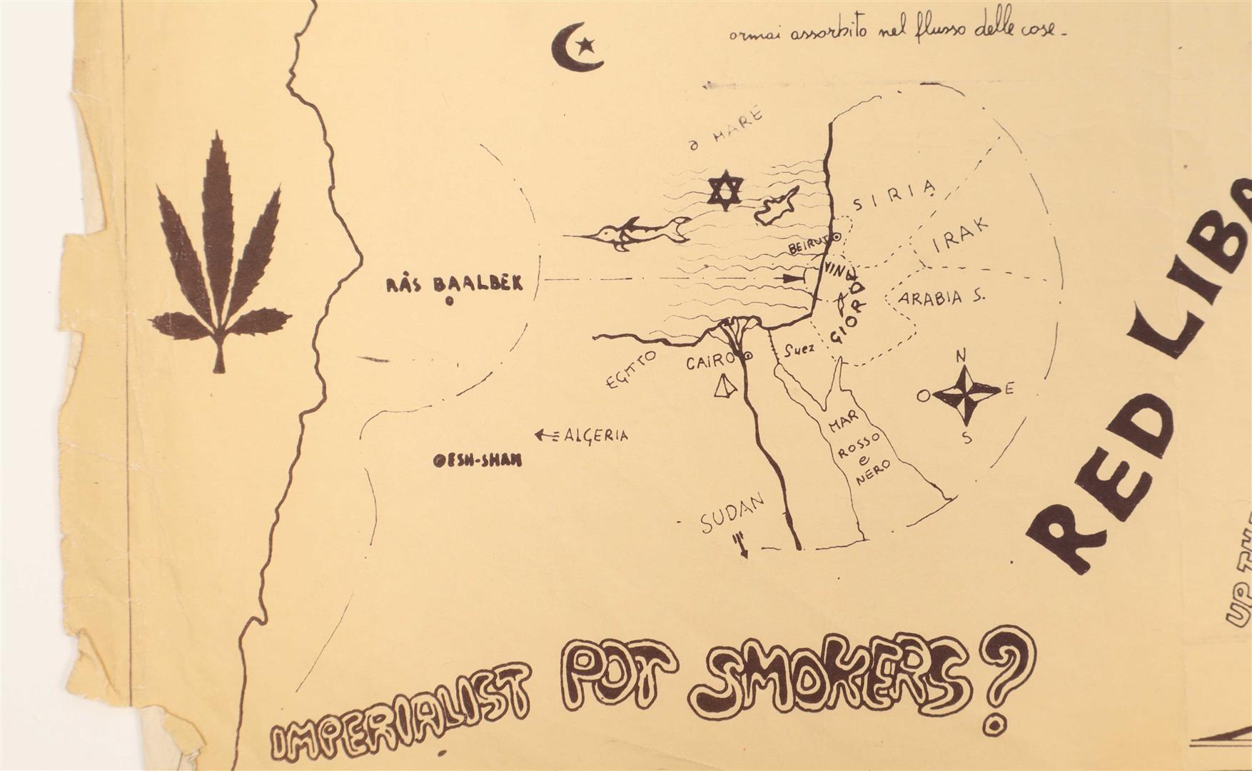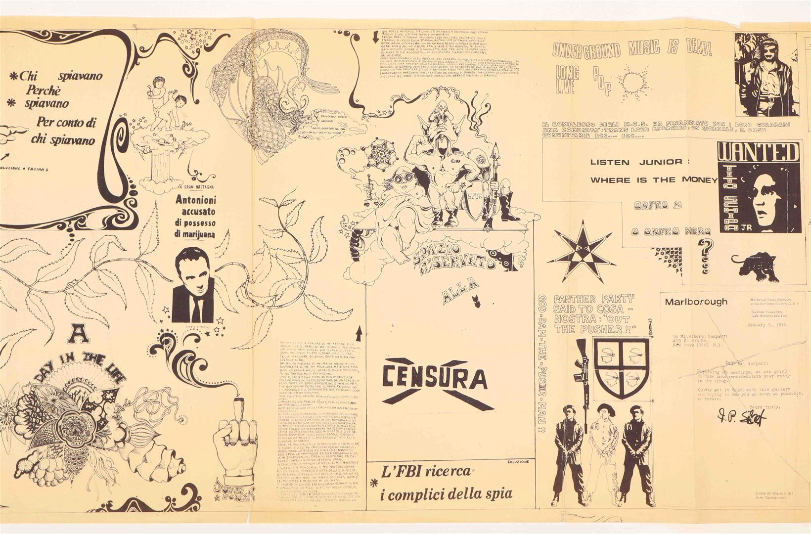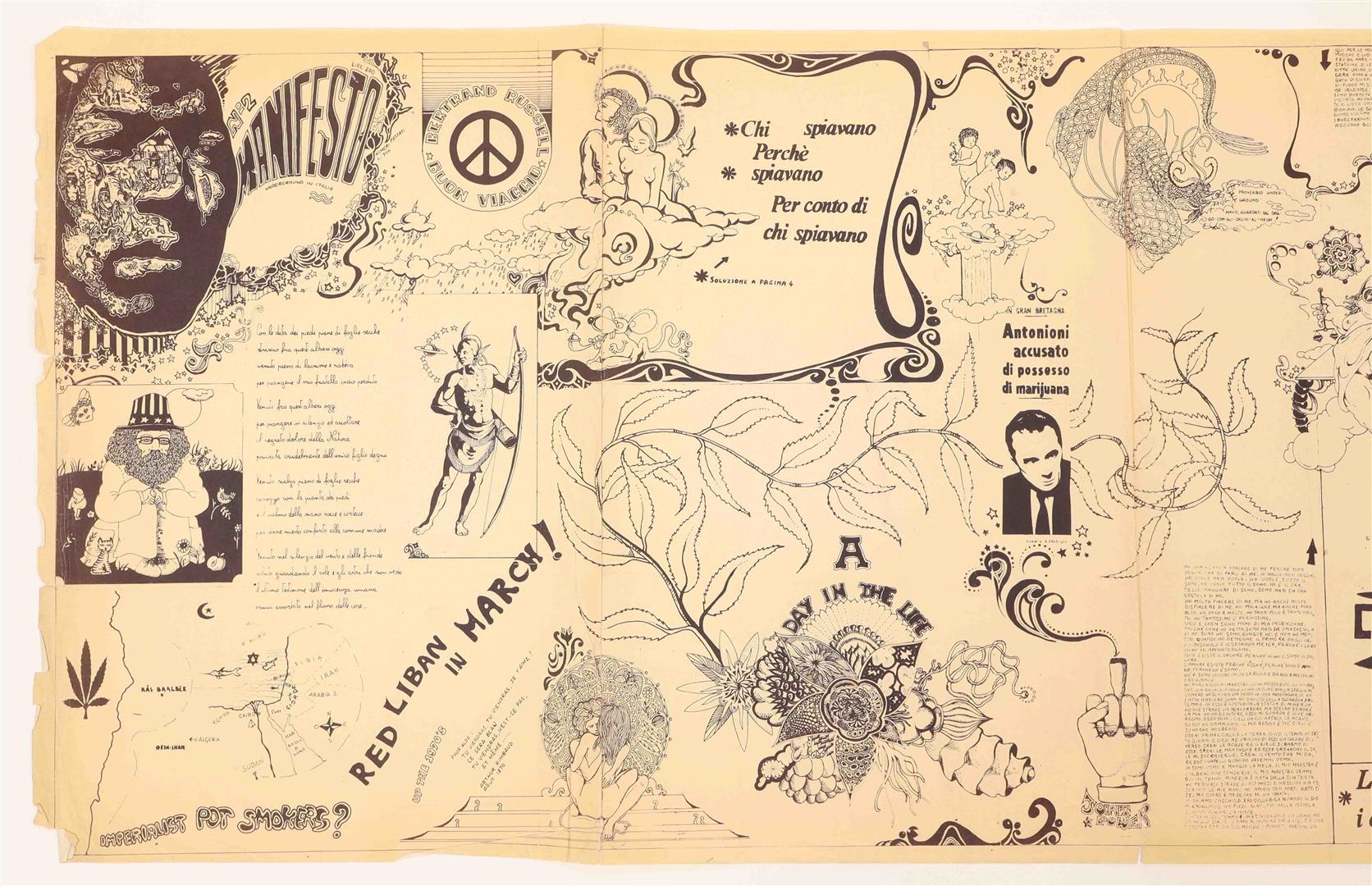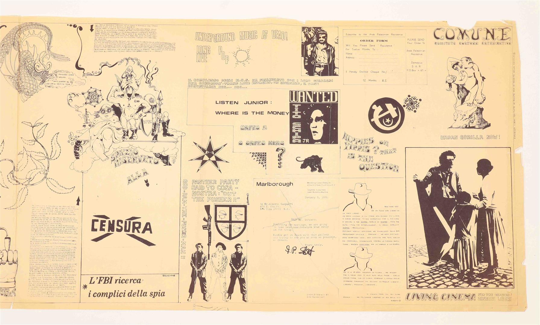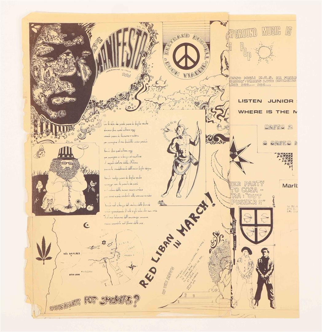 Rome, Comune comitato di cultura alternativa, ca. 1971. Large folded silkscreen poster, in English and Italian. 49 x 152 cm. The poster features an eclectic assemblage of images in Carboni's signature style. It expresses explicit support for the Palestinian liberation movement and even includes a signup card for the Arab Palestinian Resistance.