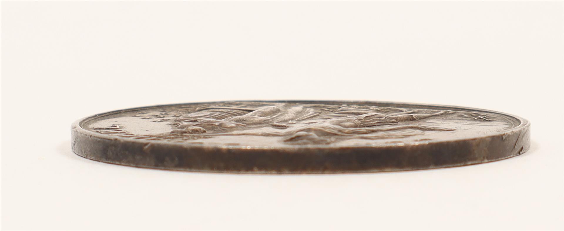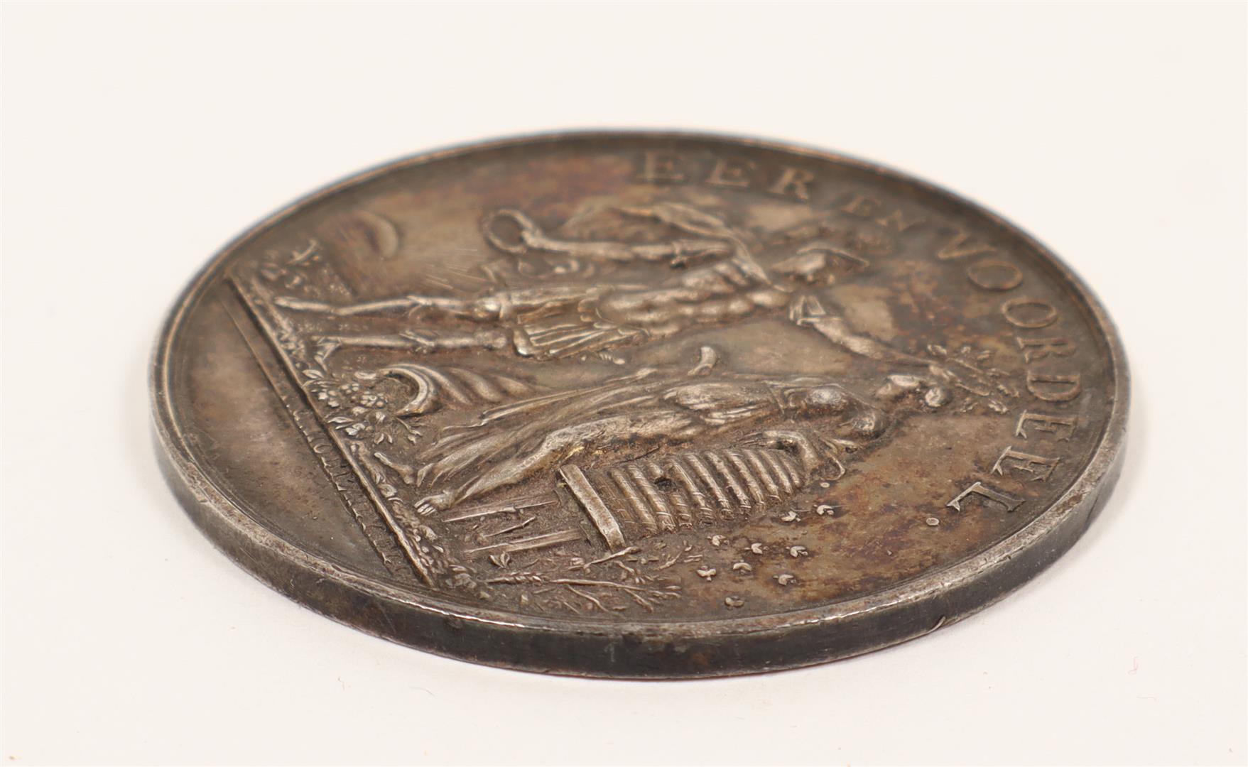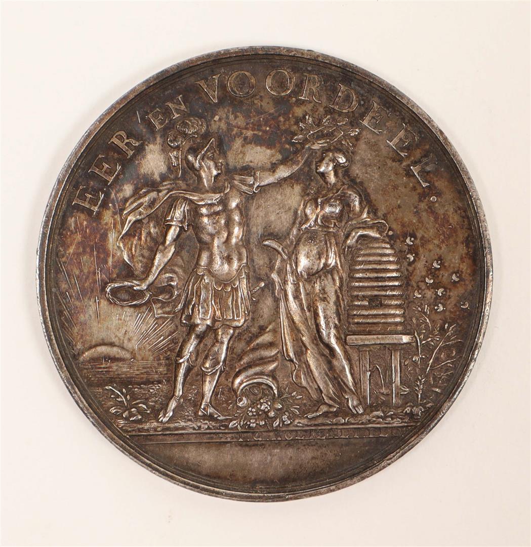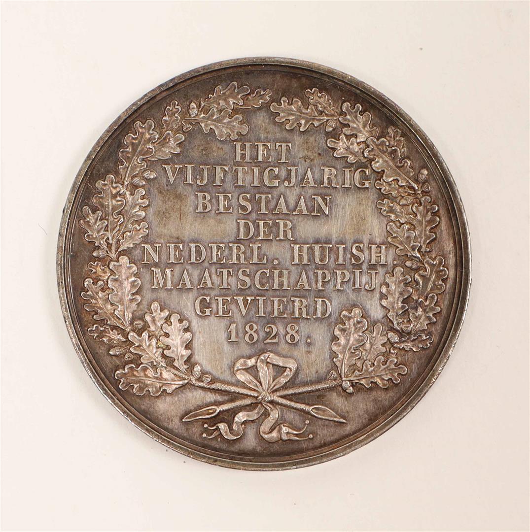 Silver token, Ø 5 cm, weight ca. 38 gr., posthumously using a design by Holtzhey, recto w. allegorical image below the motto "Eer en voordeel", verso w. the central text "Het vijftigjarig bestaan der Nederl. Huish. Maatschappij gevierd 1828" surrounded by a laurel wreath of oak branches.