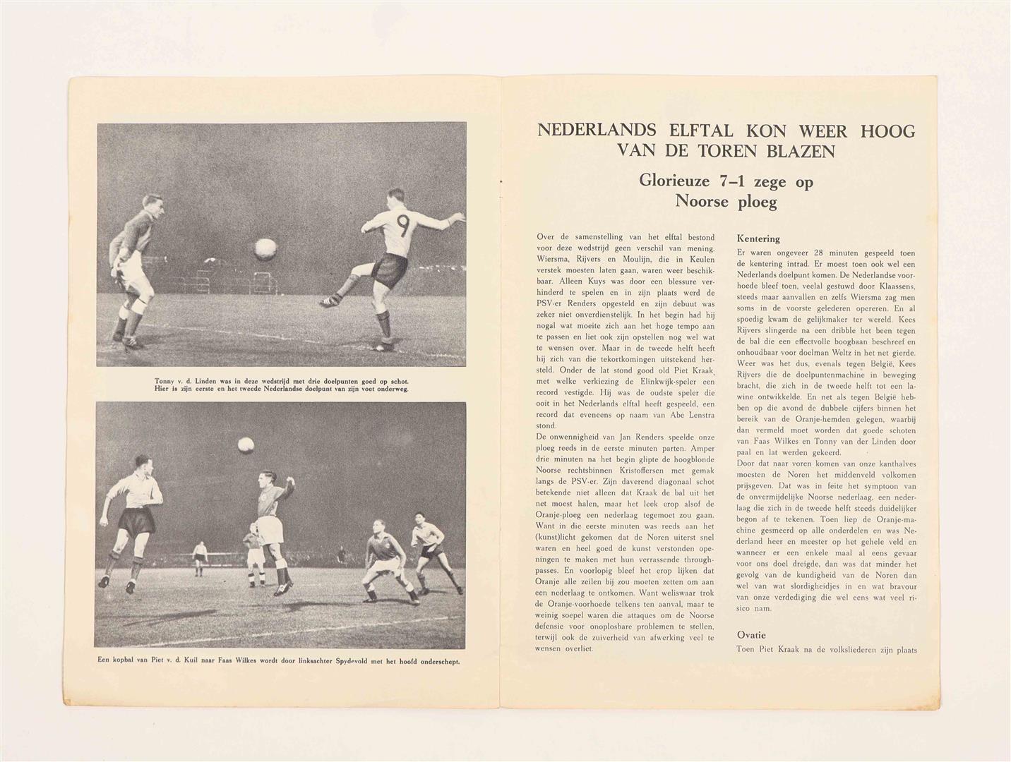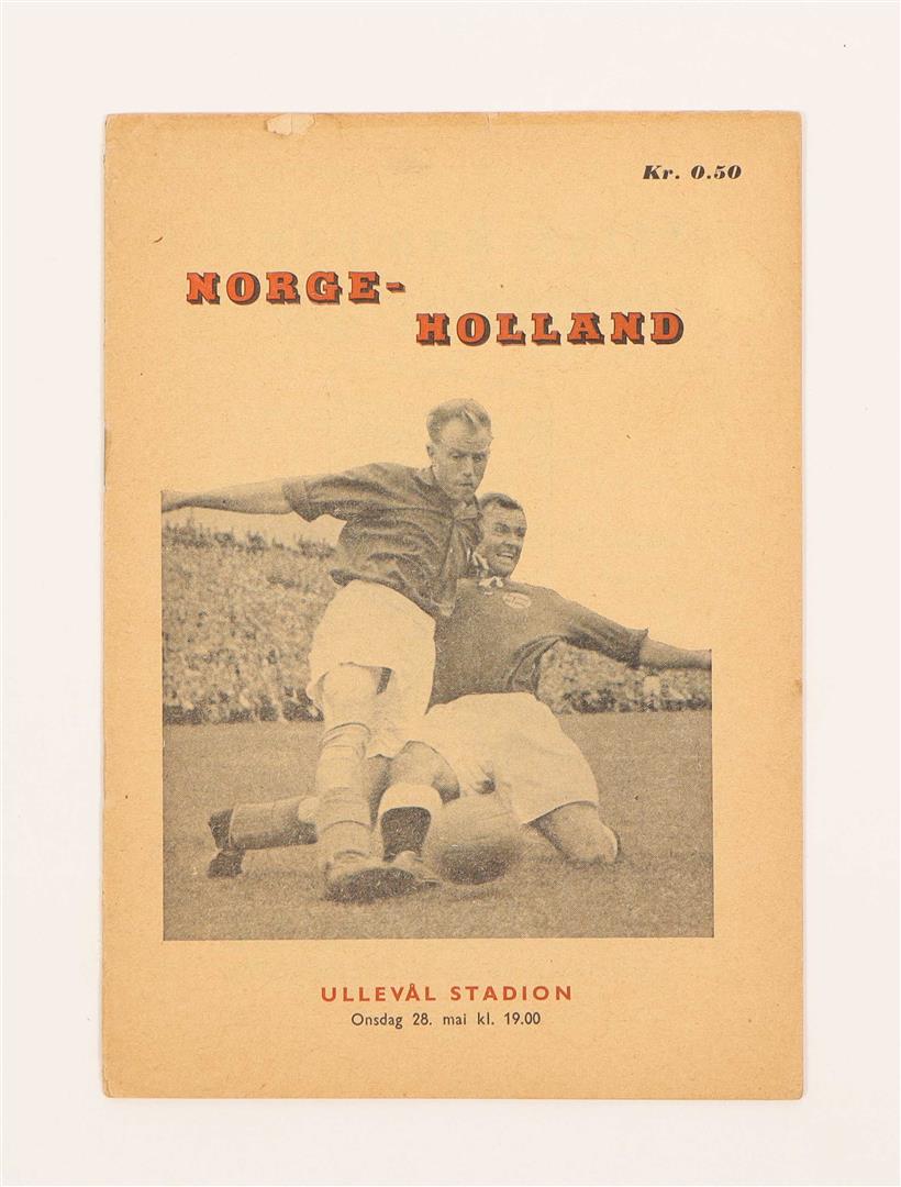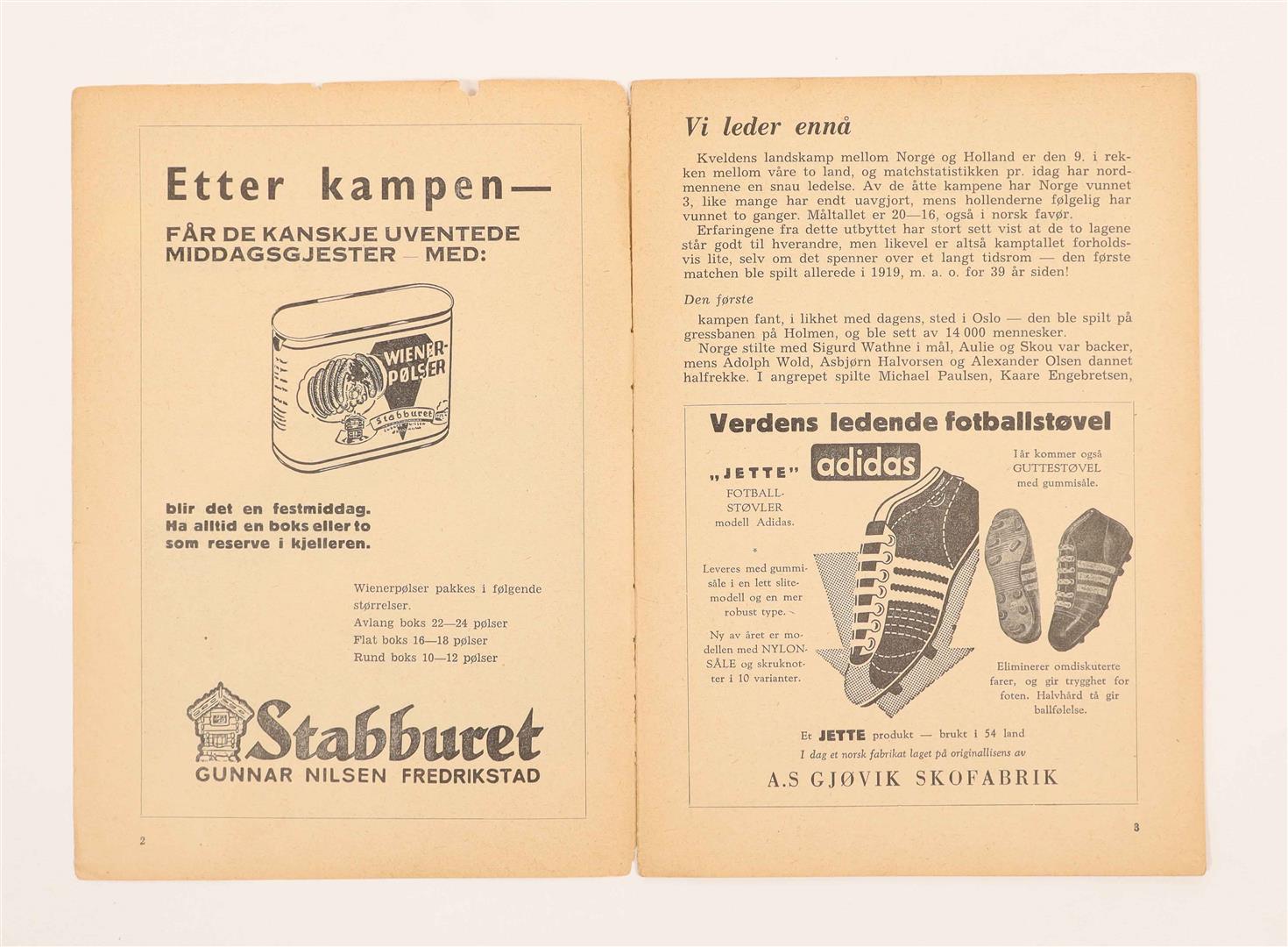 Sportsjounalistenes Klubb. Drammen, J. Steenberg, 1958. Pre-match publication for the ninth international match between the Netherlands and Norway, discussing the history of the previous matches and the strategy for the upcoming one. The match resulted in a 0-0 draw. 23 p., ill. wr. (sl. chipped at top, otherwise very good). With: (2) Nederland-Noorwegen 4 november 1959. Oranje Voetbal, no. 3. Publication reporting the result of the tenth international match between the Netherlands and Norway, w. detailed description of the match and photogr. ills. The match was a crushing 7-1 victory for the Netherlands. (14) p., ill. wr. In good condition.