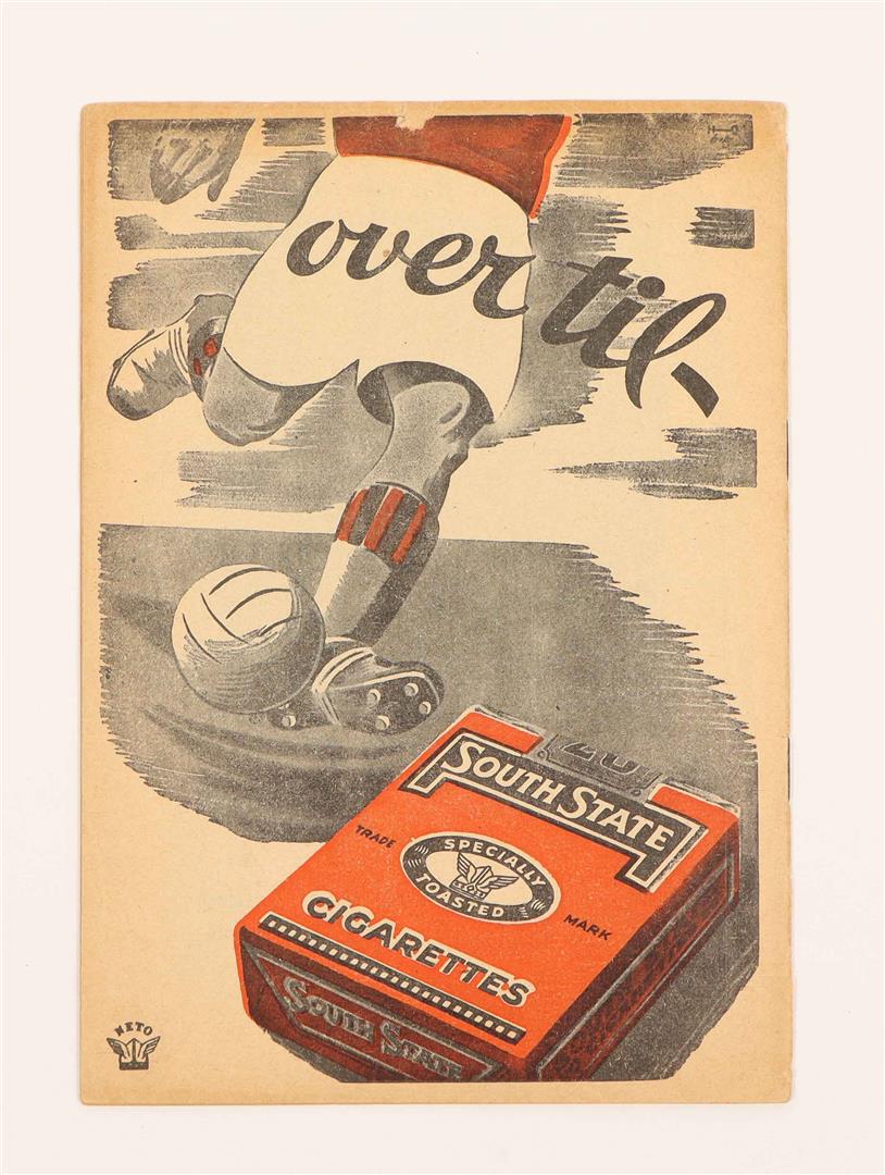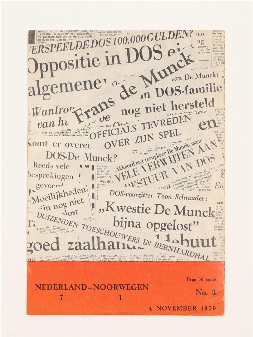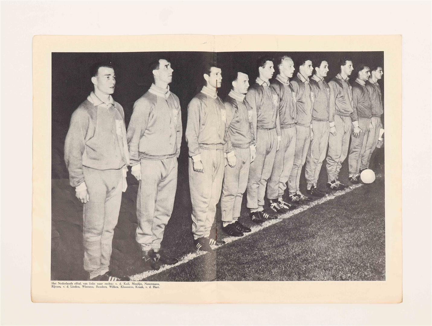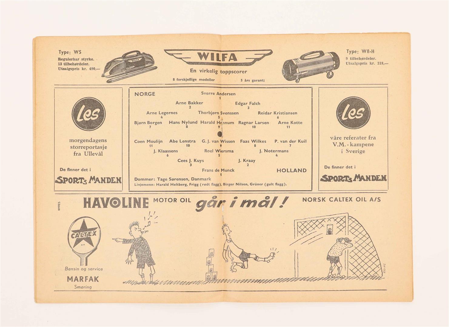 Sportsjounalistenes Klubb. Drammen, J. Steenberg, 1958. Pre-match publication for the ninth international match between the Netherlands and Norway, discussing the history of the previous matches and the strategy for the upcoming one. The match resulted in a 0-0 draw. 23 p., ill. wr. (sl. chipped at top, otherwise very good). With: (2) Nederland-Noorwegen 4 november 1959. Oranje Voetbal, no. 3. Publication reporting the result of the tenth international match between the Netherlands and Norway, w. detailed description of the match and photogr. ills. The match was a crushing 7-1 victory for the Netherlands. (14) p., ill. wr. In good condition.