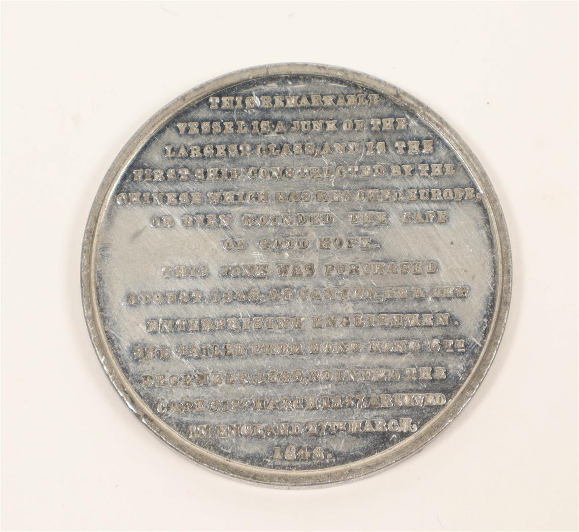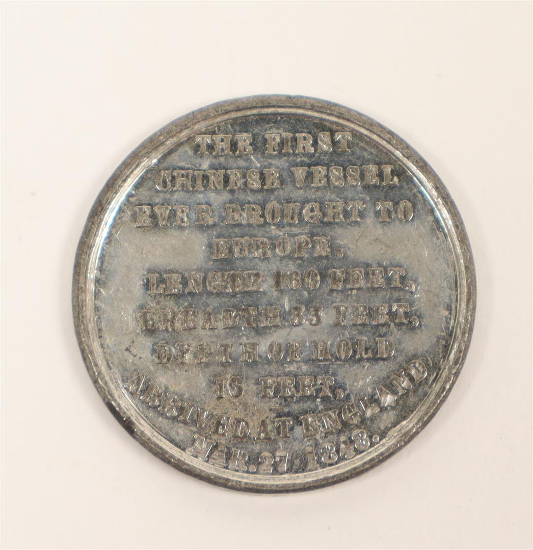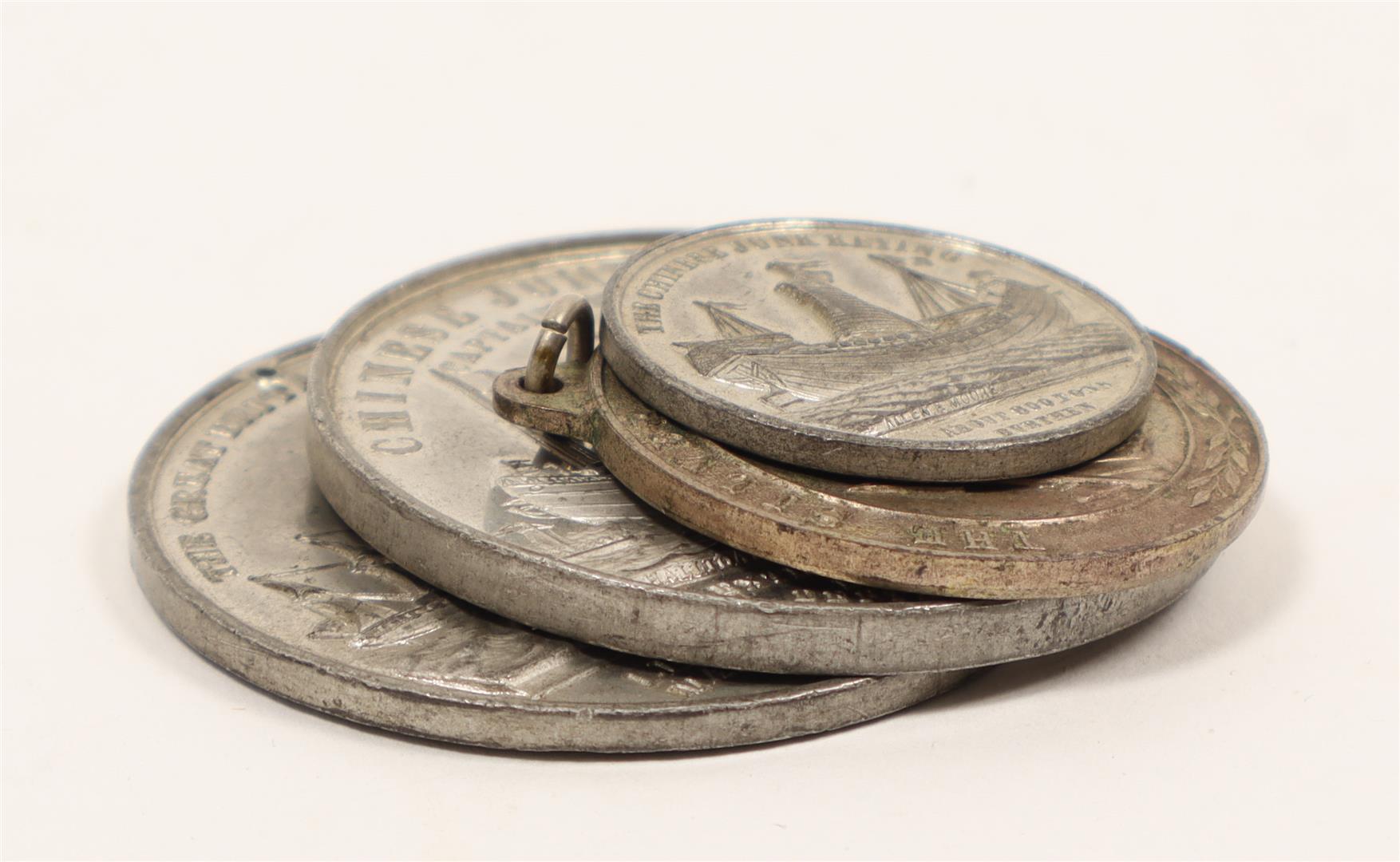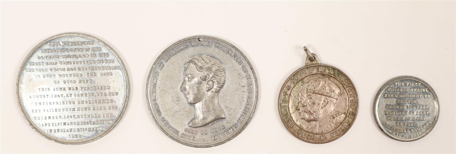 one on the "Great Britain Steam Ship", Ø 4.5 cm, dated "July 19 1843" (holed for suspension), one on the "Chinese Junk Keying", Ø 4.5 cm, a junk of the largest class that sailed from Hong Kong and arrived in England 27 March 1848, and a smaller token on the Chinese Junk Keying w. the image in reverse. Added: a silver token on the silver jubilee of the marriage of George V, 1935.