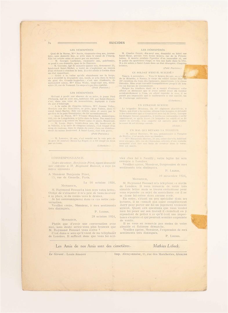 La Révolution Surréaliste became the official organ of the Surrealist movement, twelve issues were published from 1924 to 1929. The first three issues were edited by Pierre Naville and Benjamin Péret, after which André Breton took over. This inaugural issue was hosted by the Parisian Gallimard bookstore (which took half the issues on deposit) and contains texs by Louis Aragon, André Breton, Simone Kahn, Paul Eluard, Philippe Soupault et al; photographs by Man Ray; drawings by Giorgio De Chirico, Max Morise, Pierre Naville, Robert Desnos, Max Ernst, André Masson, and Pablo Picasso.