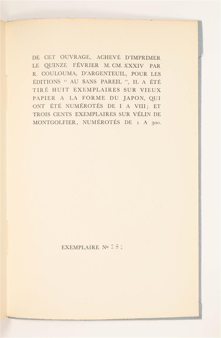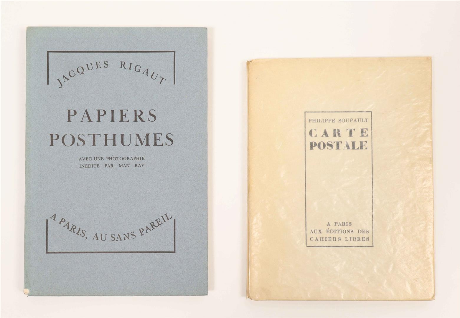 (2) Jacques Rigaut. Papiers posthumes. Paris, Au Sans Pareil, 1934. Softcover, 145 x 213 cm, 112 uncut pp. From an edition of 300 copies on Vélin de Montgolfier, this one numbered 181. Includes a previously unpublished portrait of the artist by Man Ray. Small abrasion to blue cover, else in very good condition. Features a collection of manuscripts gathered after Rigaut's death in 1929. At the age of 30, the French surrealist poet and founding member of the Paris Dada group shot himself, using a ruler to ensurer the bullet would pass through his heart. (total 2)