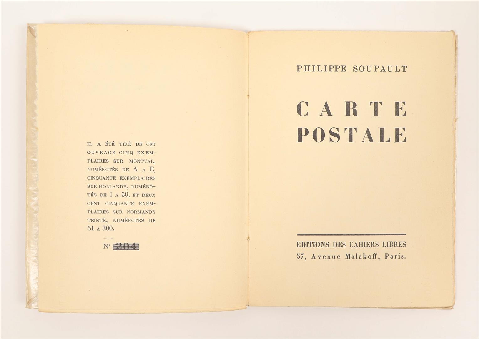 (1) Philippe Soupault. Carte Postale. Paris, Editions des Cahiers Libres, 1926. Softcover with glassine wrapper, 19.5 x 14.7 cm, 36 pp. First edition of 300 numbered copies, this being one of 250 copies on tinted Normandy paper, stamped No.204. Includes a portrait of the artist on the last sheet. Glue on interior of spine has dried, yet pages remain firmly bound. Fine copy. Philippe Soupault (1897-1990) was a French writer, poet and political activist. He was a Dadaist and one of the founding figures of the Surrealist movement. Together with André Breton and Louis Aragon he launched the Surrealist periodical Littérature (1919-1924).