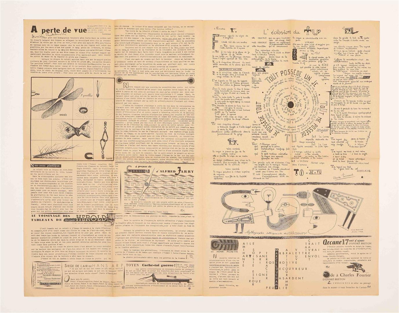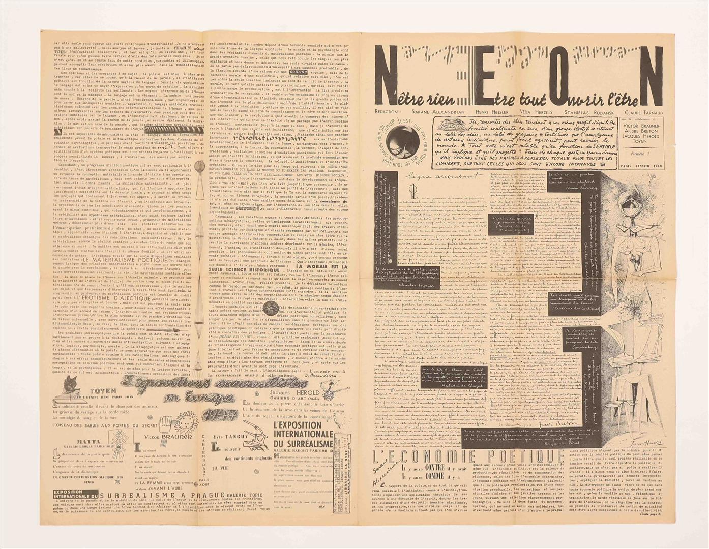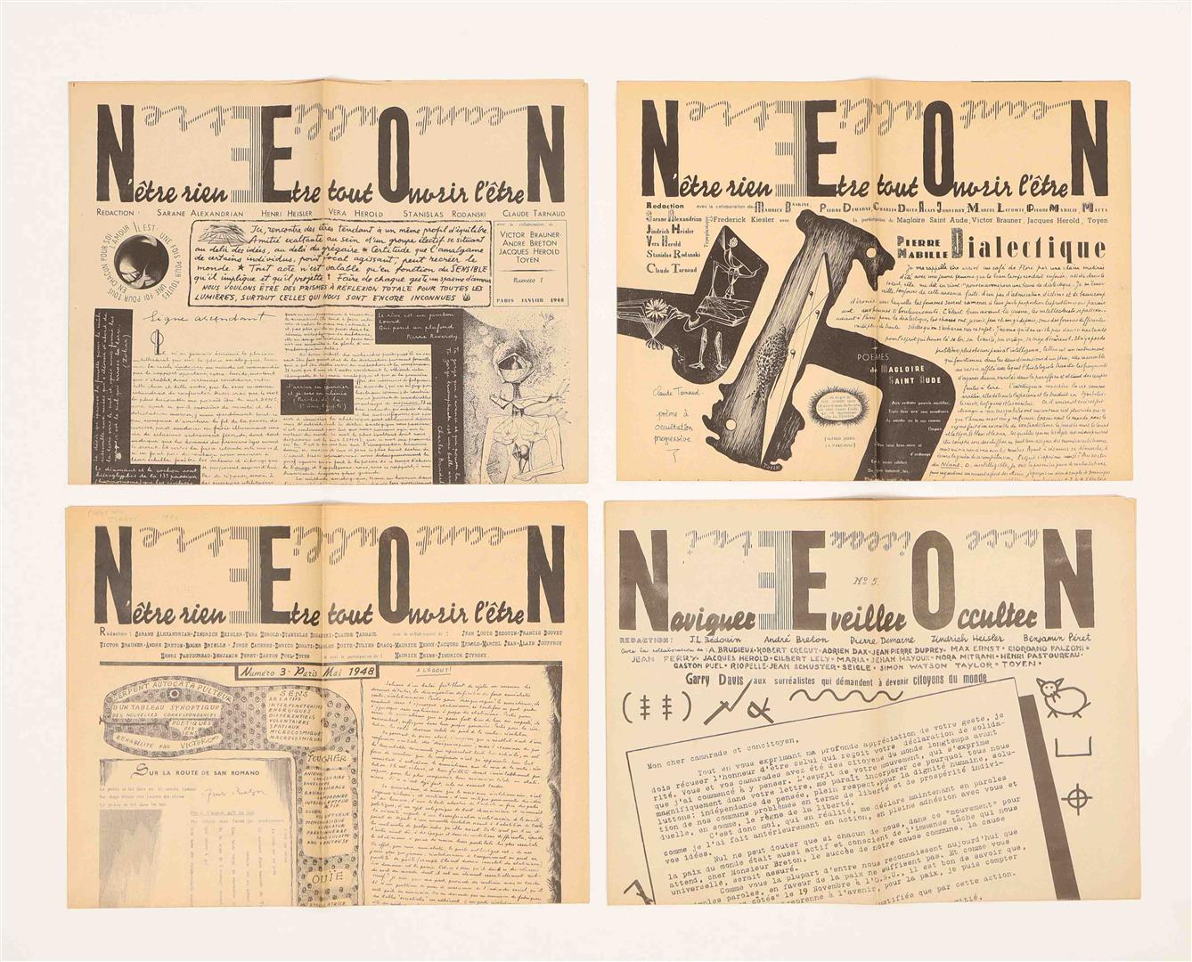 The first three issues (titled N’être rien, Être tout, Ouvrir l’être, Néant, Oubli, Être) were edited by Sarane Alexandrian, Jindrich Heisler, Vera Herold, Stanislas Rodanski, Claude Tarnaud. No.5 (titled Naviguer, Eveiller, Occulter Nacce, Oiseaux, Etui) was compiled by J.L. Bédouin, André Breton, Pierre Demarne, Jindrich Heisler and Benjamin Péret. Each issue consists of a large newssheet (62 x 82 cm) printed on both sides in black and folded to 31 x 20.5 cm, with collaged texts and graphic images by notable associates of the Surrealist movement such as Victor Brauner, Max Ernst, Julien Gracq, Jacques Herold, Alain Jouffroy, Frederick Kiesler, Benjamin Peret, Toyen. All issues are extremely well-preserved. (total 4)