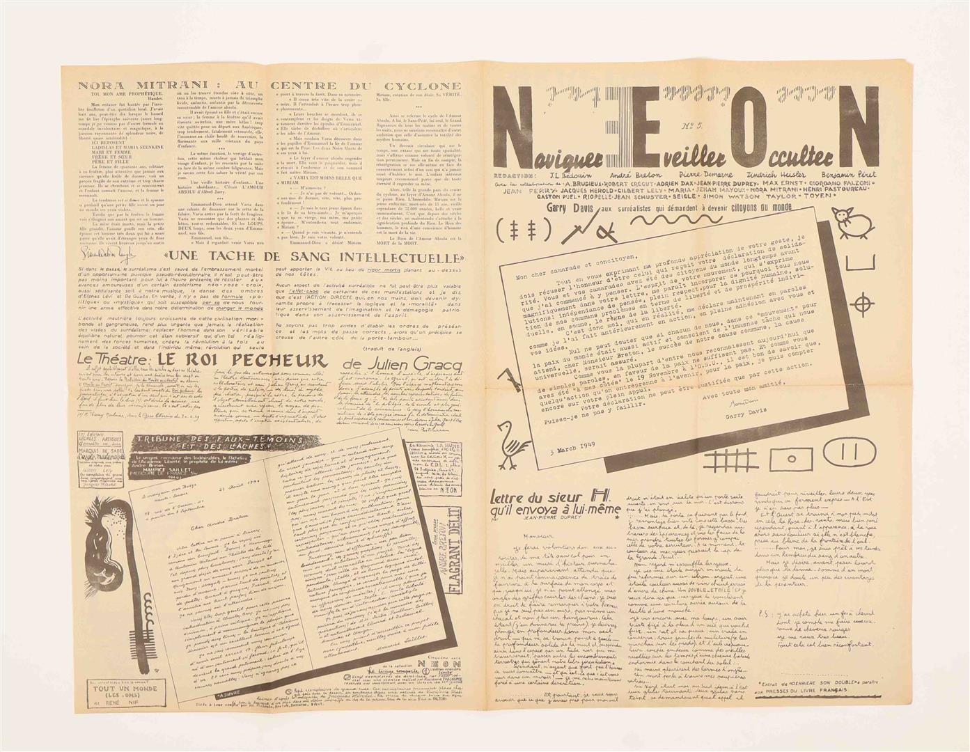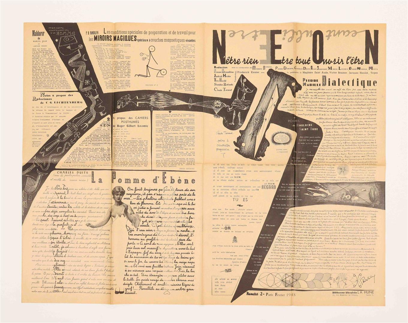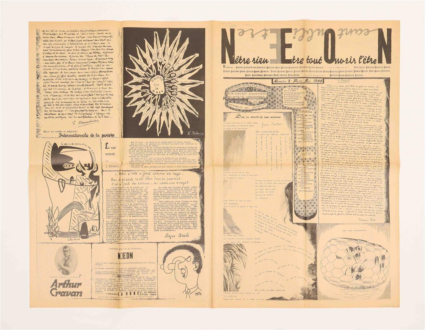 The first three issues (titled N’être rien, Être tout, Ouvrir l’être, Néant, Oubli, Être) were edited by Sarane Alexandrian, Jindrich Heisler, Vera Herold, Stanislas Rodanski, Claude Tarnaud. No.5 (titled Naviguer, Eveiller, Occulter Nacce, Oiseaux, Etui) was compiled by J.L. Bédouin, André Breton, Pierre Demarne, Jindrich Heisler and Benjamin Péret. Each issue consists of a large newssheet (62 x 82 cm) printed on both sides in black and folded to 31 x 20.5 cm, with collaged texts and graphic images by notable associates of the Surrealist movement such as Victor Brauner, Max Ernst, Julien Gracq, Jacques Herold, Alain Jouffroy, Frederick Kiesler, Benjamin Peret, Toyen. All issues are extremely well-preserved. (total 4)