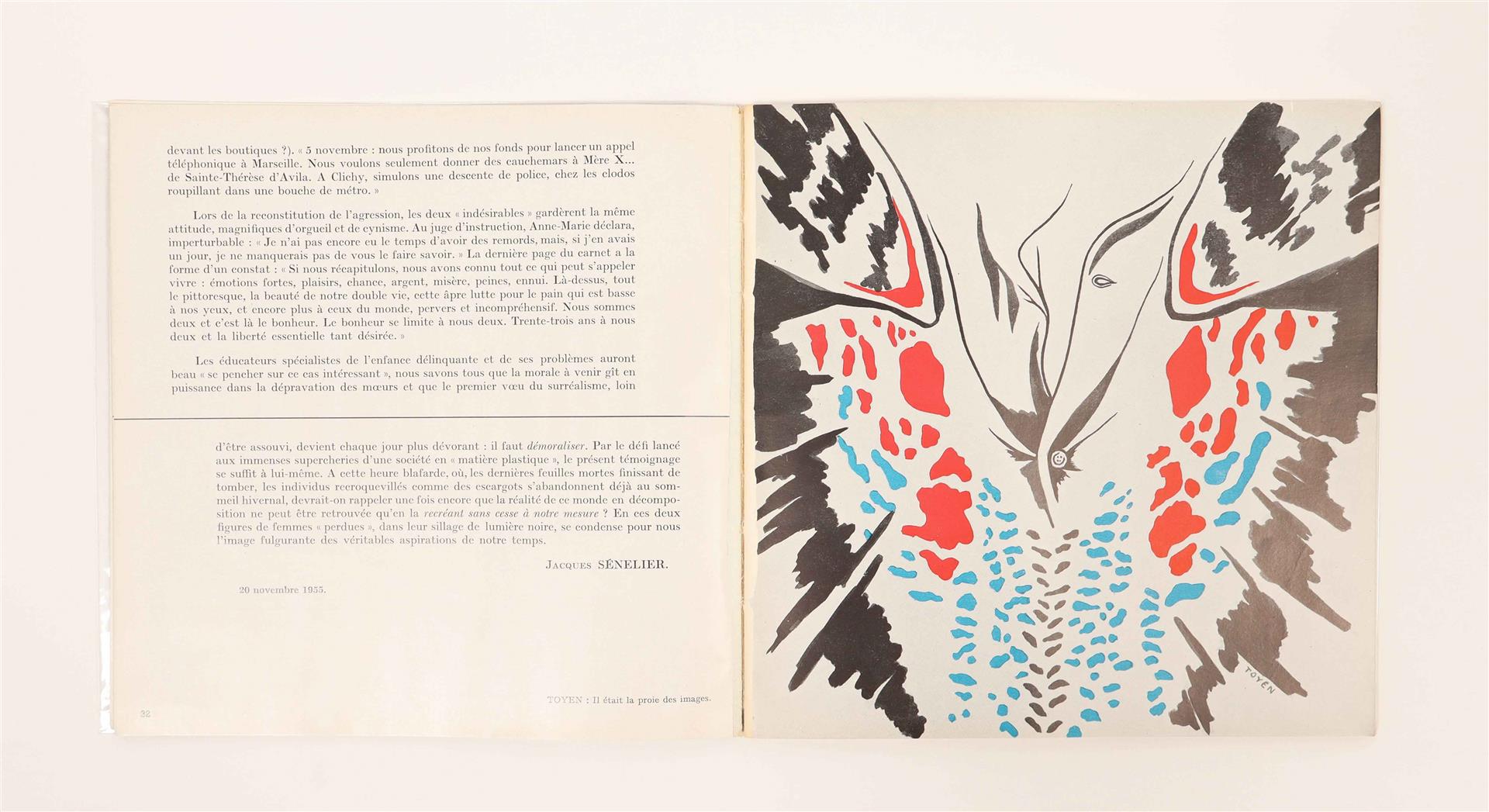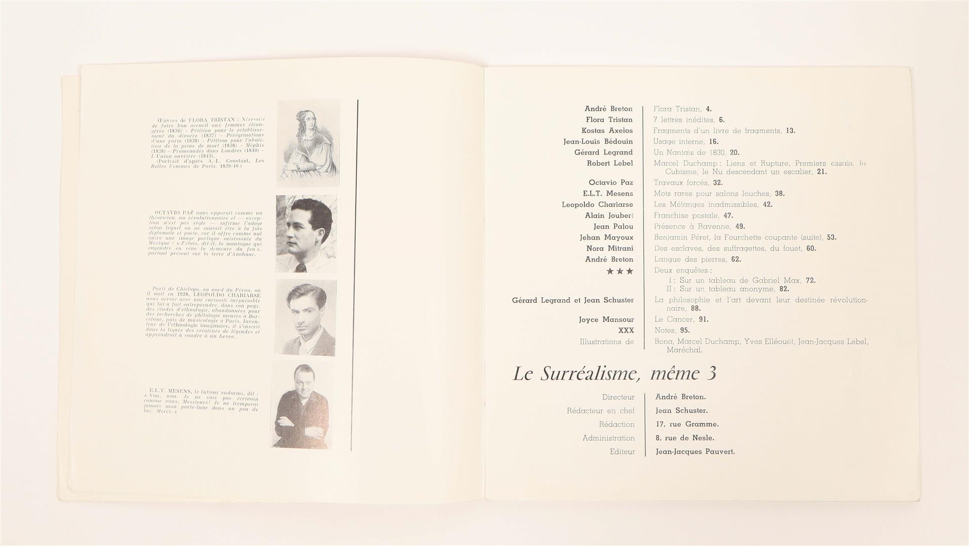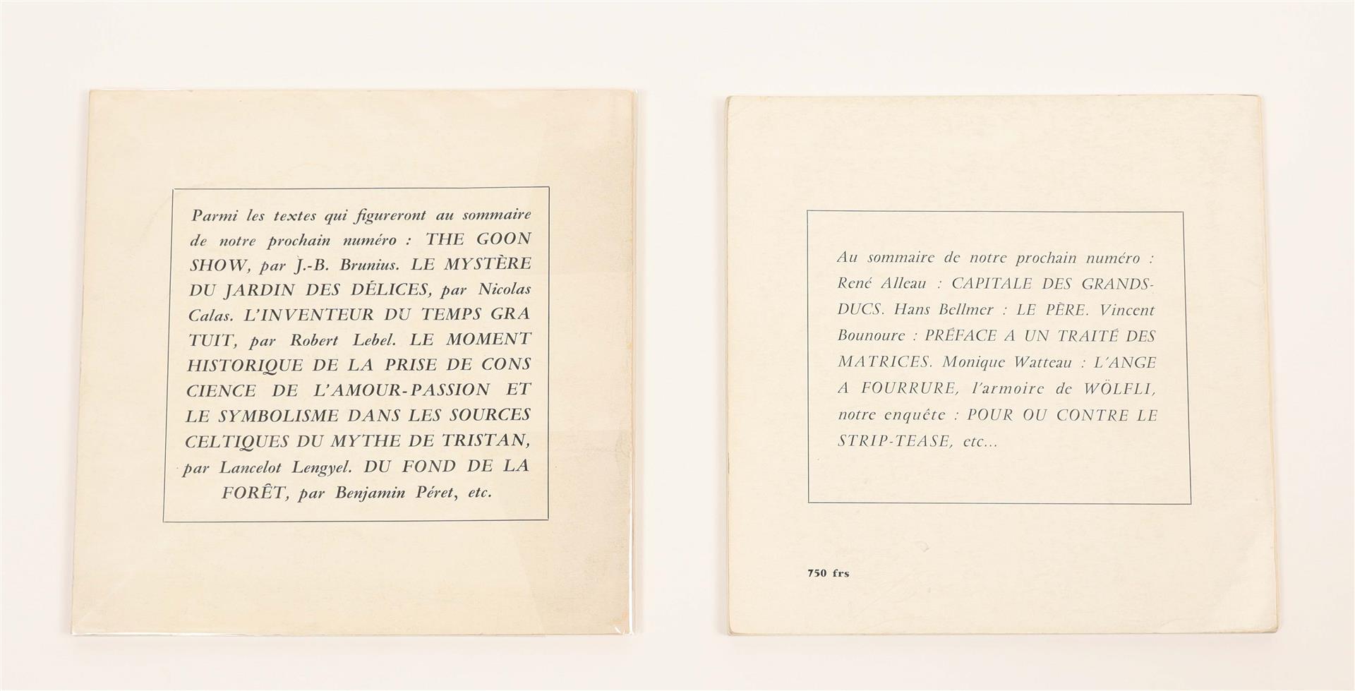 (1) No.1 October 1956. Cover by Marcel Duchamp. Contributions by Jean (Hans) Arp, Hans Bellmer, Leonora Carrington, Marcel Duchamp, Marie Cerminova (Toyen), Man Ray, Octavio Paz, Benjamin Péret et al. (2) No.3 Autumn 1957. Cover by Gabriel Max. Contributions by André Breton, Joyce Mansour, Robert Lebel, Jean Jacques Lebel, Nora Mitrani E.L.T. Mesens et al. Moderate rubbing to spines, otherwise fine copies. (total 2)