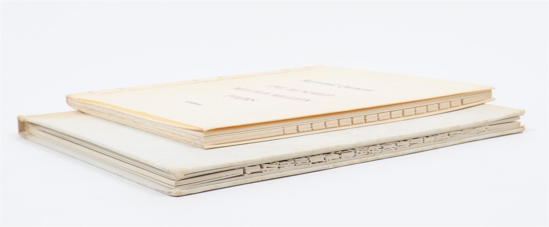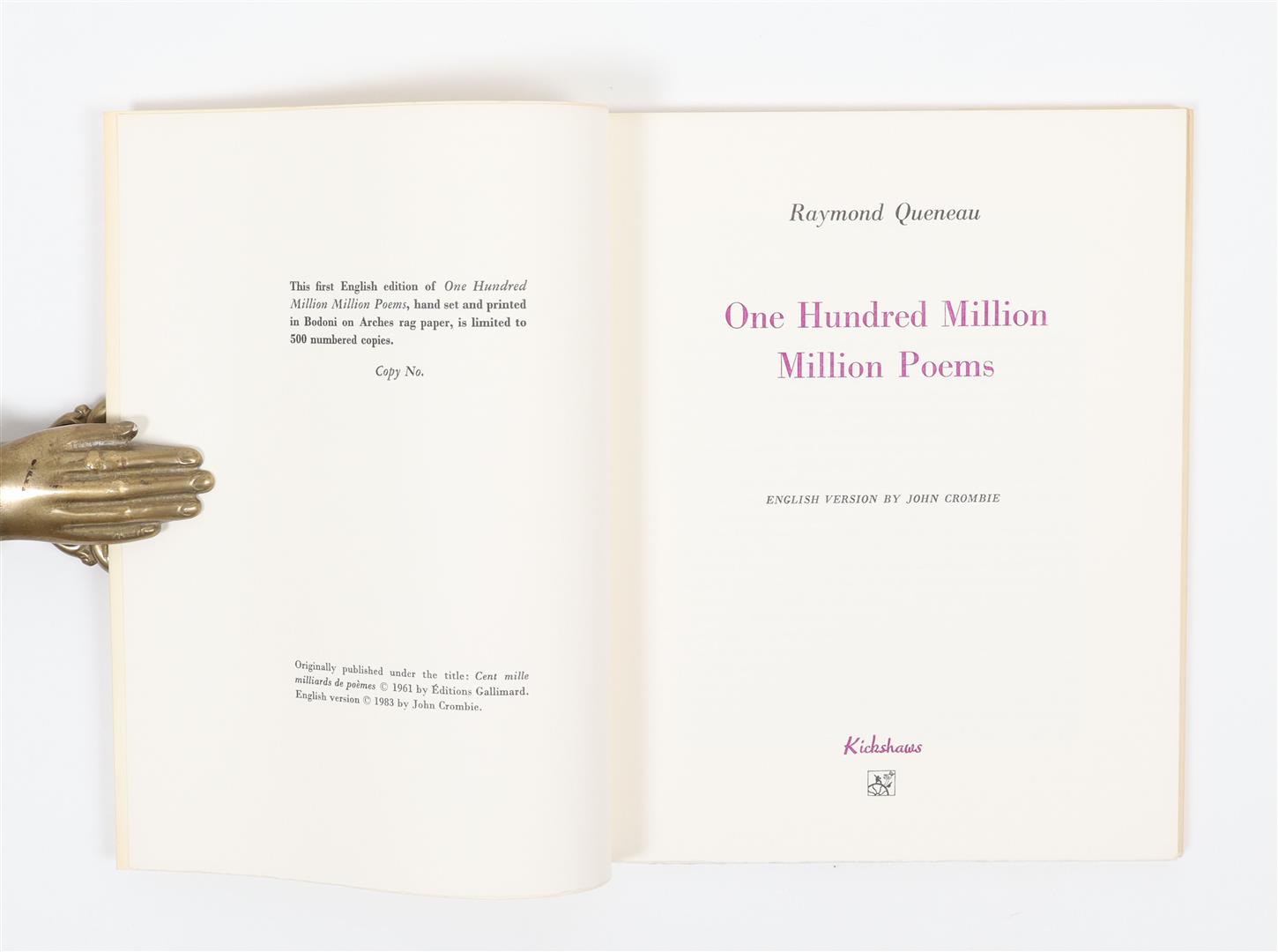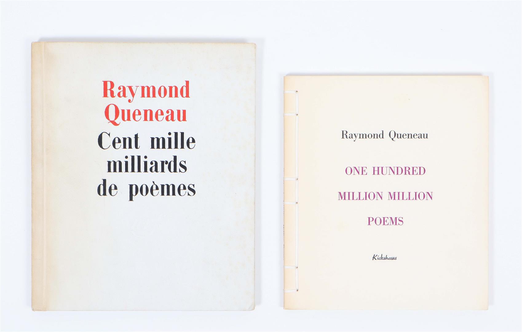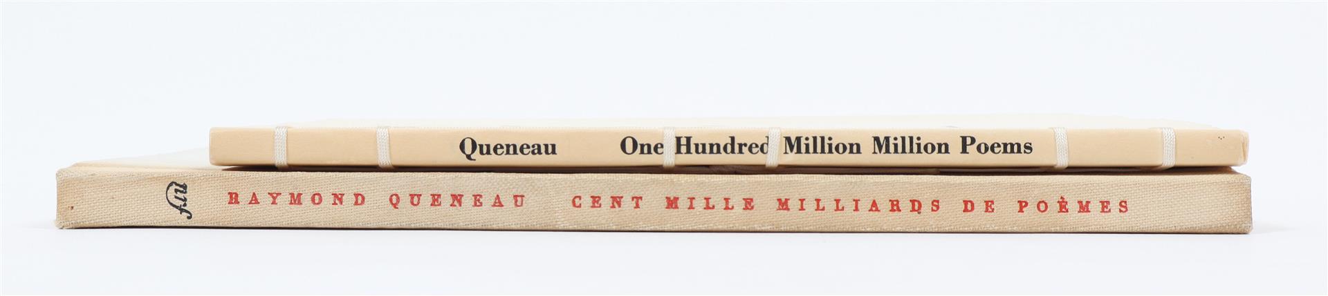 (2) Raymond Queneau. One Hundred Million Million Poems. English translation by John Crombie. Paris, Kickshaws Press, 1983. Original wrappers in Japanese butterfly binding, 25 x 22 cm. Each page cut into strips between each line to enable different combinations of poems. First English edition, one of 500 copies. Light toning to cover, else near mint. (total 2)