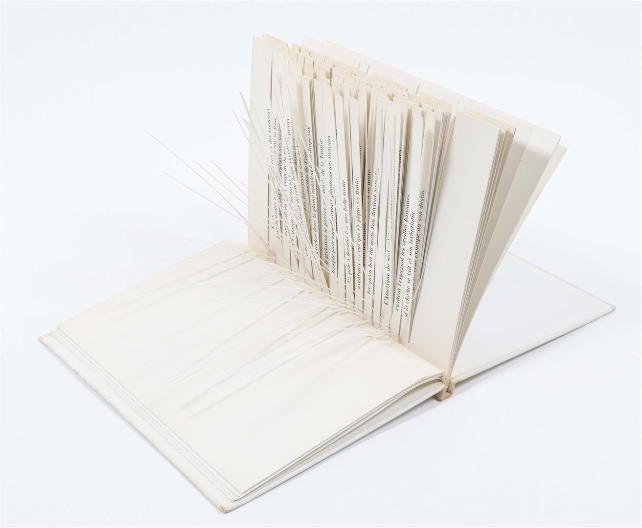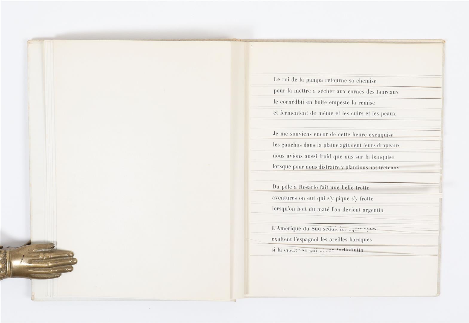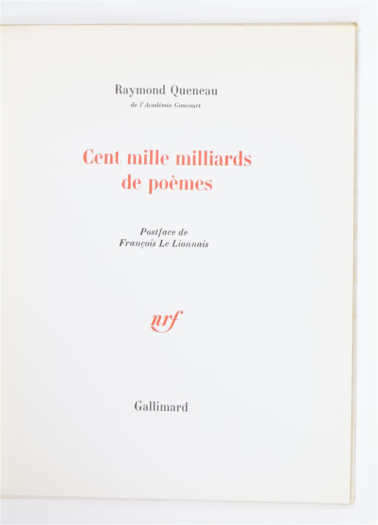 (1) Raymond Queneau. Cent mille milliards de poèmes. Paris, Gallimard NRF, 1961. Hardcover, cloth binding, 28.7 x 24 cm. Contains instructions for use by Queneau, an afterword by François le Lionnais, and 10 sheets of sonnet lines cut into strips. By turning the strips the reader can compose multiple combinations of poems, one hundred thousand billion in all. First edition of this remarkable book object which marked the beginning of the Oulipo group in 1961, the French literary movement that combined mathematics and probability to explore new literary possibilities. First edition. Second printing November 1961, limited to 2200, this copy numbered H.C.1. Cover with soiling, small abrasion to spine, interior fine.