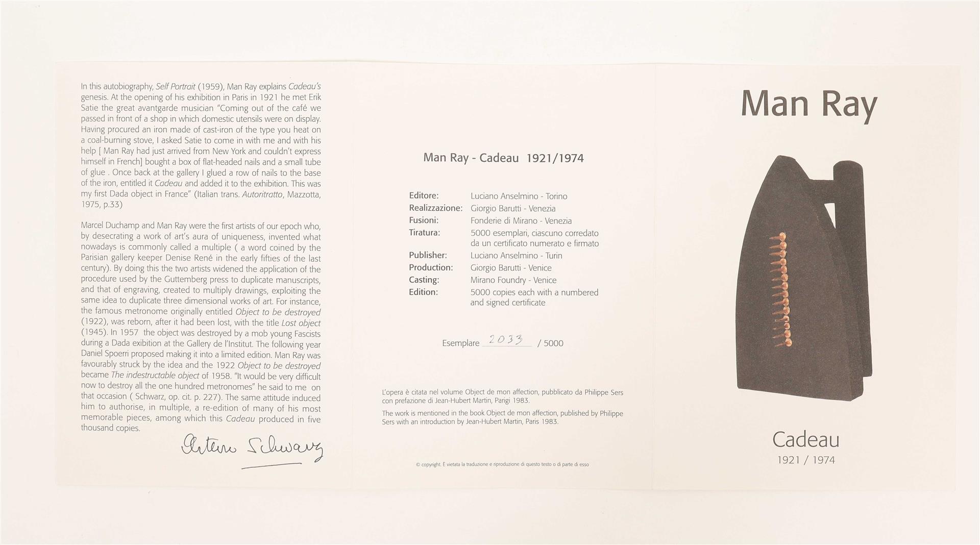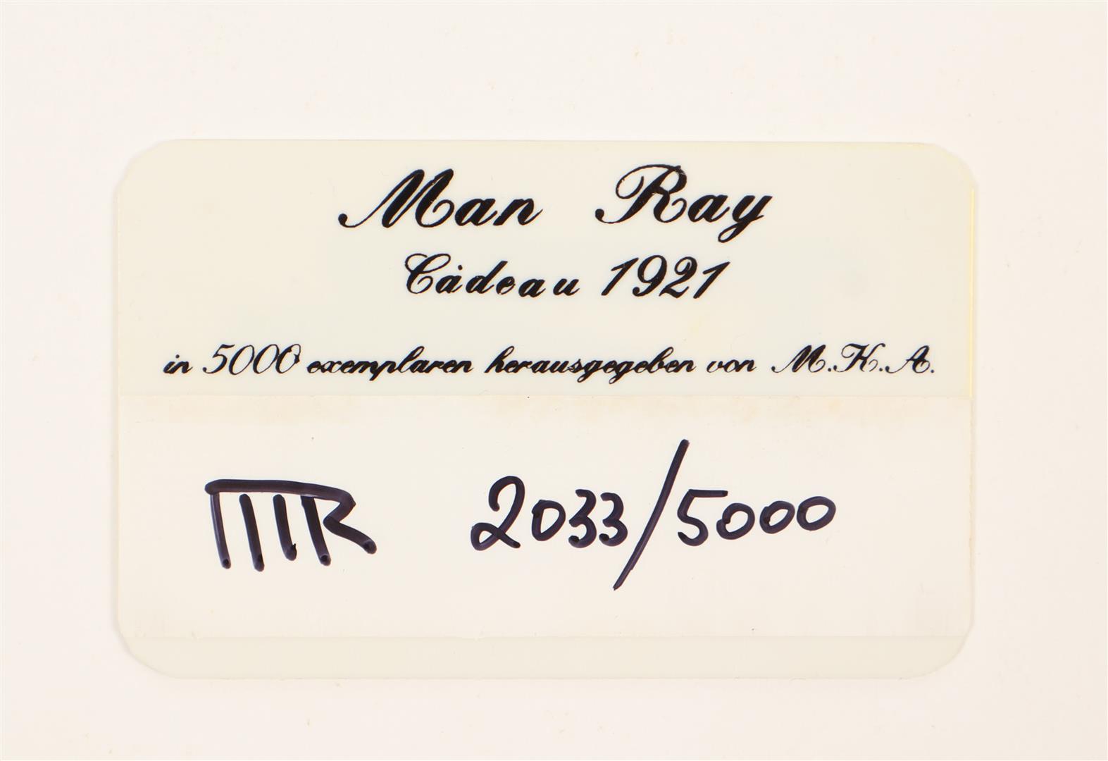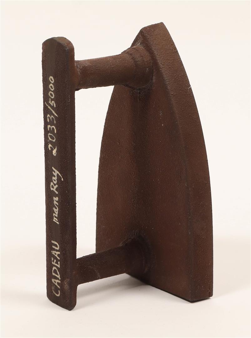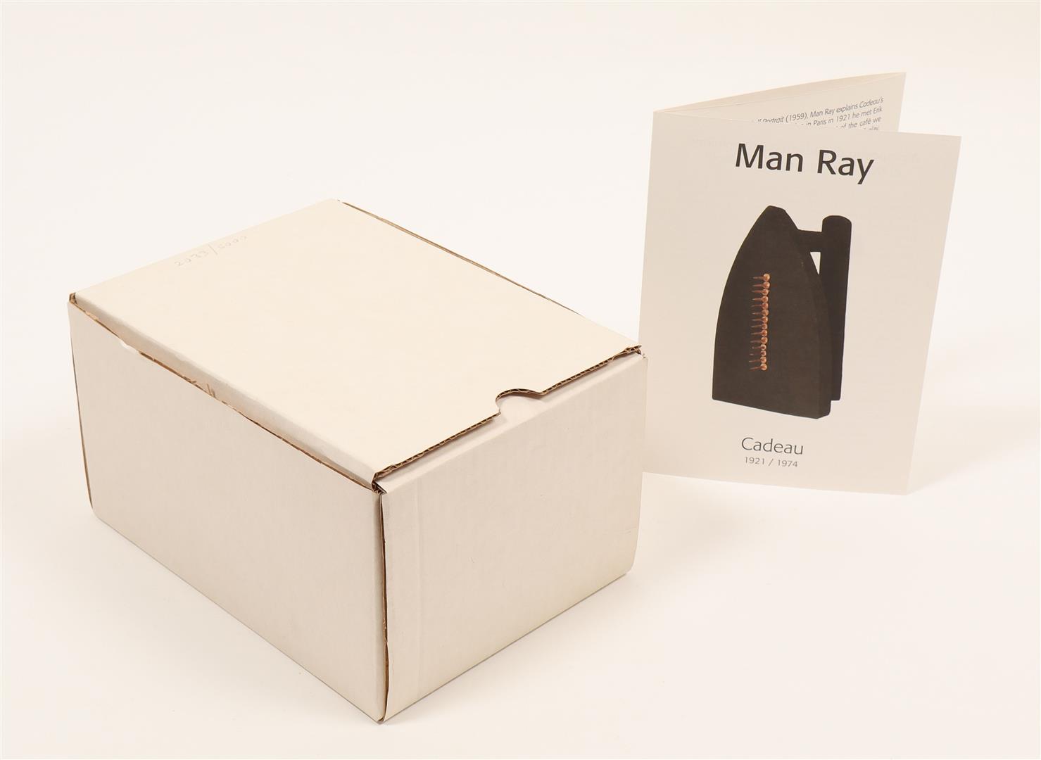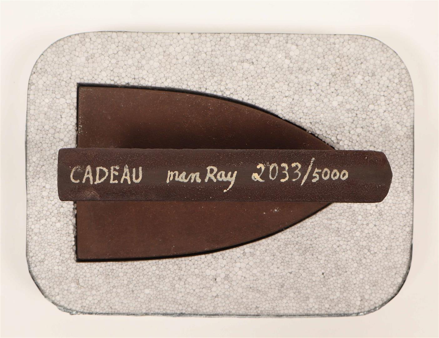 Cadeau (The Gift) is an iconic dadaist object by Man Ray (1890-1976) created during the opening of Ray's first solo show in Paris, organized by Philippe Soupault and Suzanne Pillard at Galerie Six on December 3, 1921. The original is lost but its concept survives through later reproductions created or sanctioned by the artist.