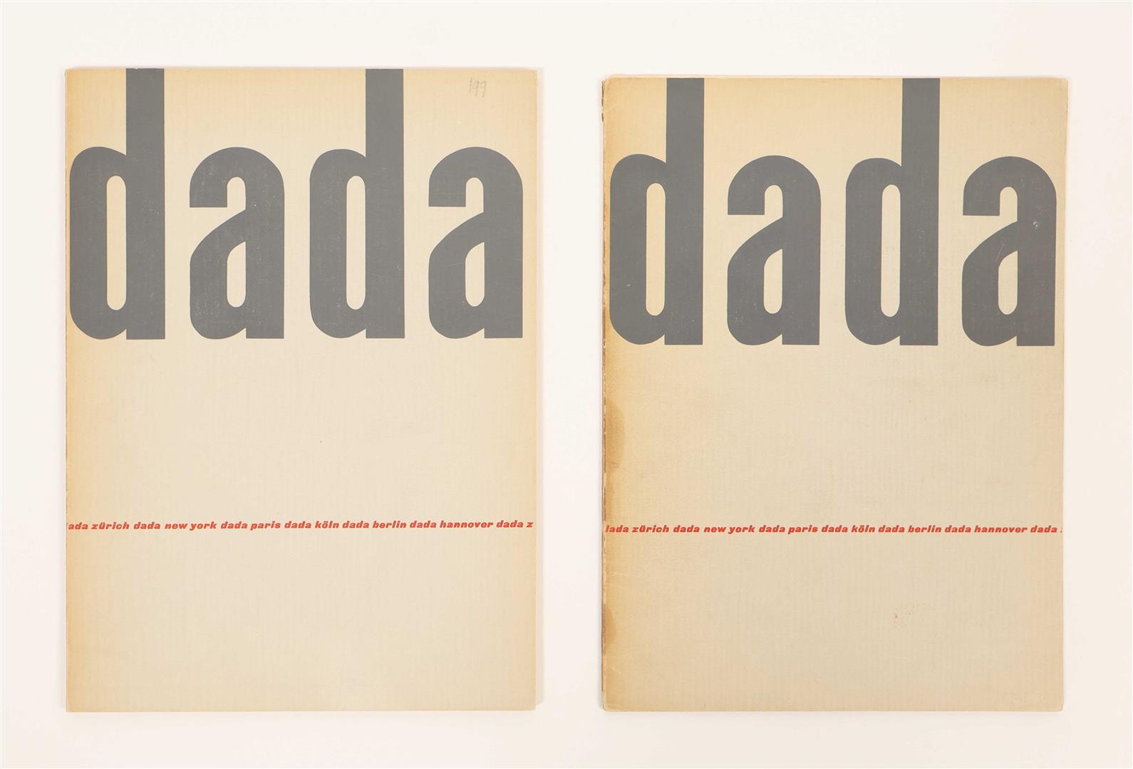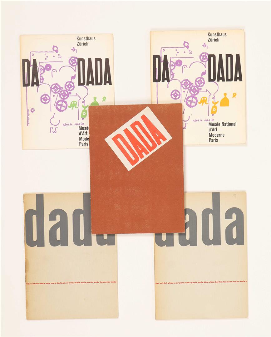 (2) DADA - Dada. Zürich, New York, Paris, Berlin, Köln, Hanover. Amsterdam, Stedelijk Museum, 1958. Catalogue consisting of 2 volumes, each 26 x 19 cm, 86/32 pp., printed on various kinds of paper with b/w illustrations. Introduction by Tzara, text by Jaffé, in Dutch, French, German and English. Both volumes with light soiling and age wear. (3) DADA 1966/67. Zurich, Kunsthaus Zurich, 1966. Catalogue for Dada's 50th anniversary show at Kunsthaus Zurich and Musée National d' Art Moderne de Paris. Two volumes, 23 x 19 cm, 24/112 pp. Text in German and French. Moderate toning to covers, else very good. (total 5)