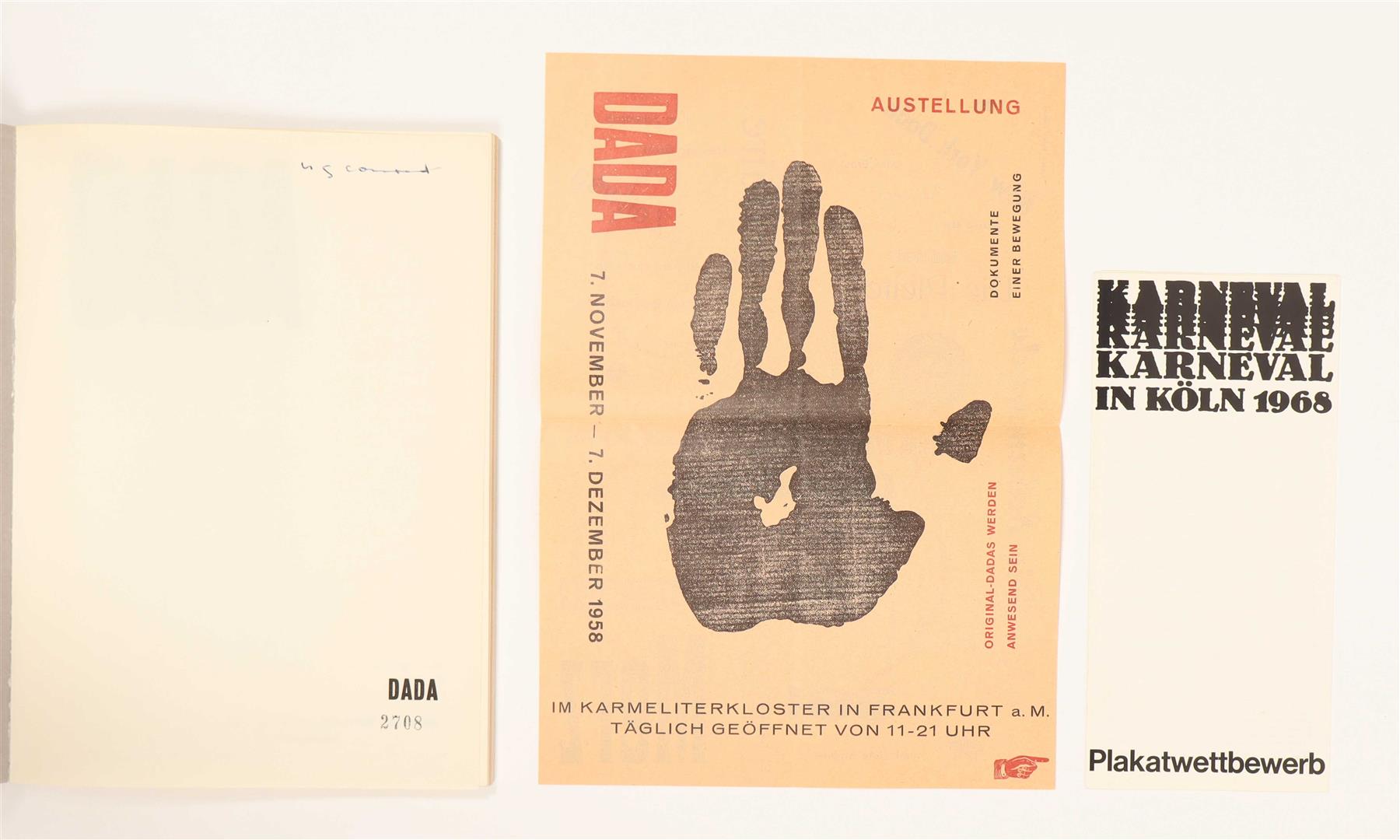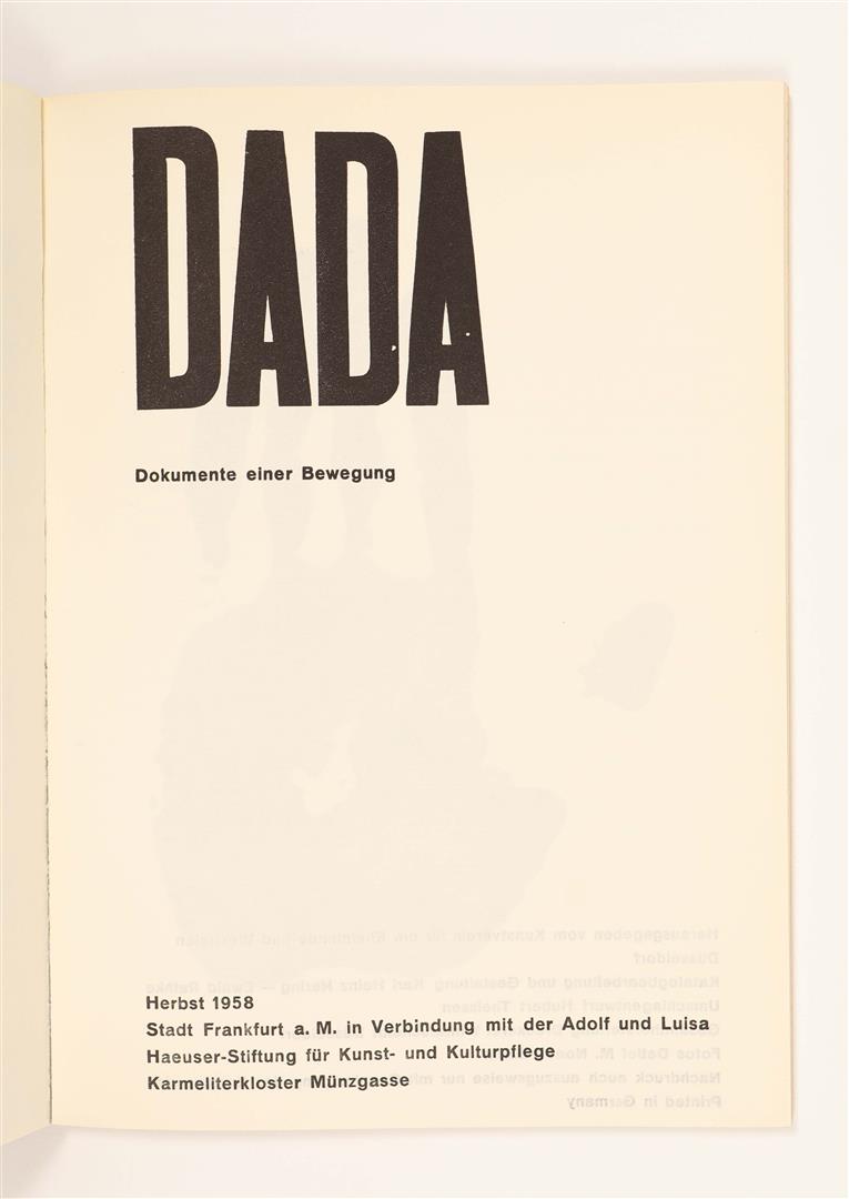 (1) Dada dokumente einer bewegung. Düsseldorf, Kunstverein für die Rheinlande und Westfalen,1958. Softcover with mounted title sheet, 26 x 19 cm, ca. 100 pp. Catalogue for the first major post-war Dada exhibition, with reprints of documents, lists of exhibitions and performances, and artists' statements by Man Ray, Arp, Richard Huelsenbeck and Hans Richter. Includes inlaid leaflets. Fine set.