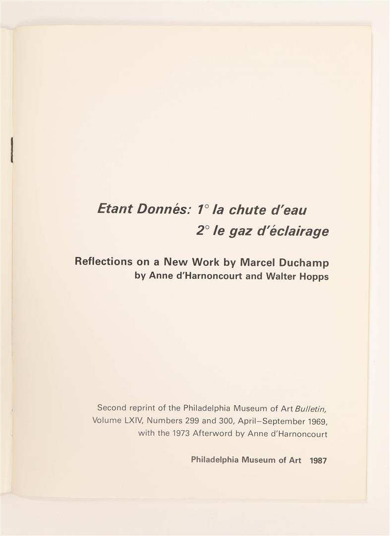 (2) Etant Donnés: 1° la chute d'eau 2° le gaz d'éclairage. Reflections on a New Work by Marcel Duchamp. Staplebound, 24 x 18.5 cm, 68 pp. Second reprint of the Philadelphia Museum of Art Bulletin on Marcel Duchamp, published in 1989 (originally published in 1969). Texts by Anne d'Harnoncourt and Walter Hopps. (3) Arturo Schwarz, Marcel Duchamp, la Sposa e i Readymade. Milan, Electa, 1988. Softcover, 28 x 25 cm, 123 pp. Published in conjunction with the show held at Palazzo di Brera in Milan, text in Italian. All catalogues in fine condition. (total 3)