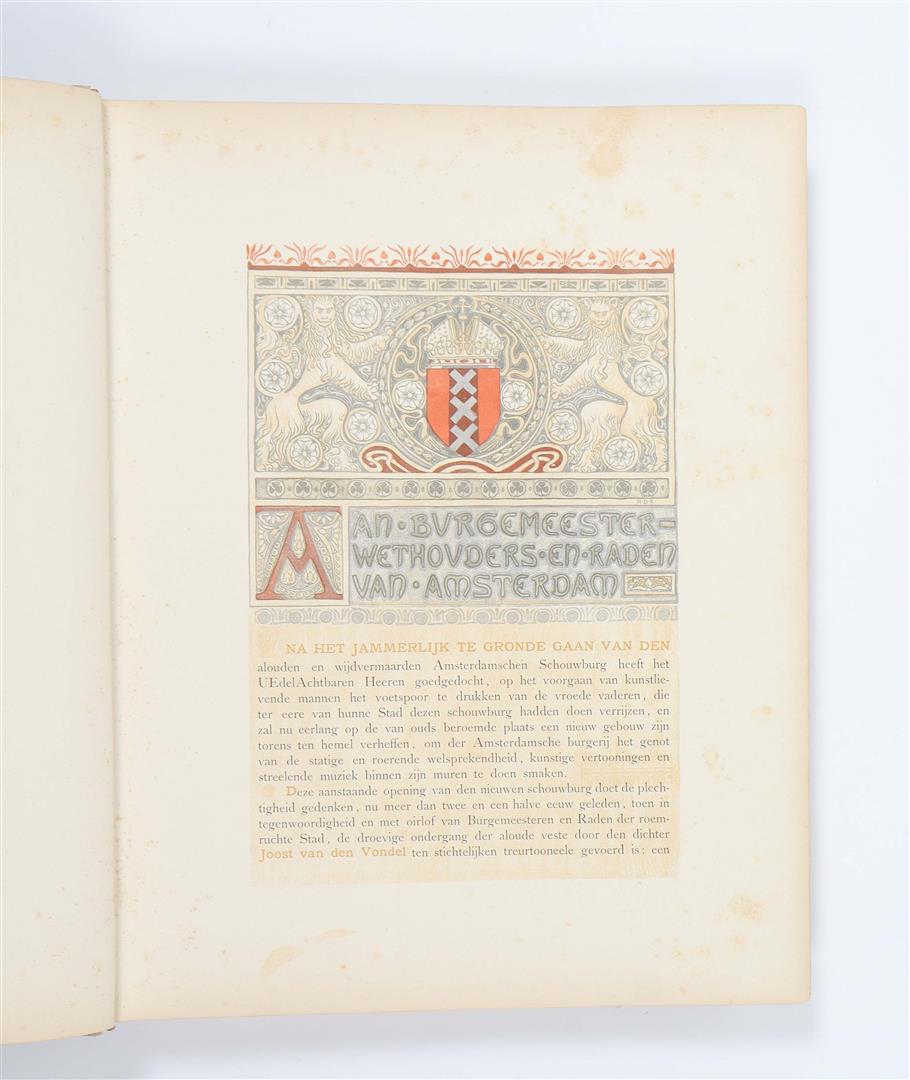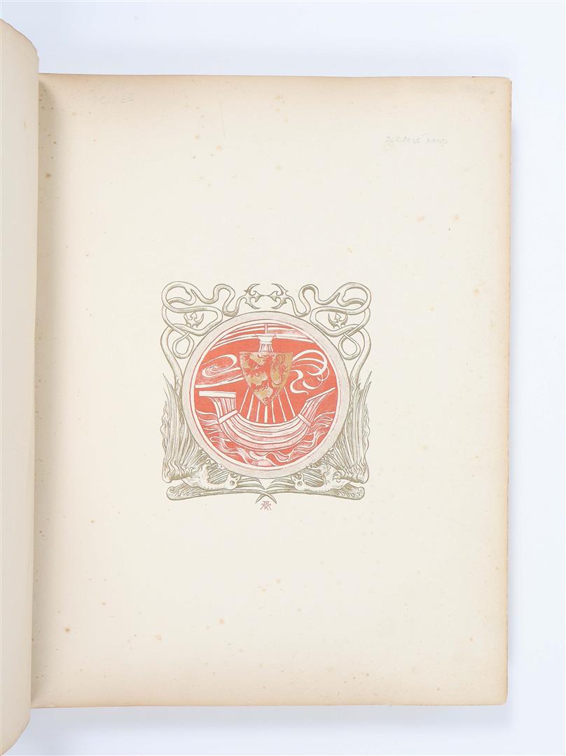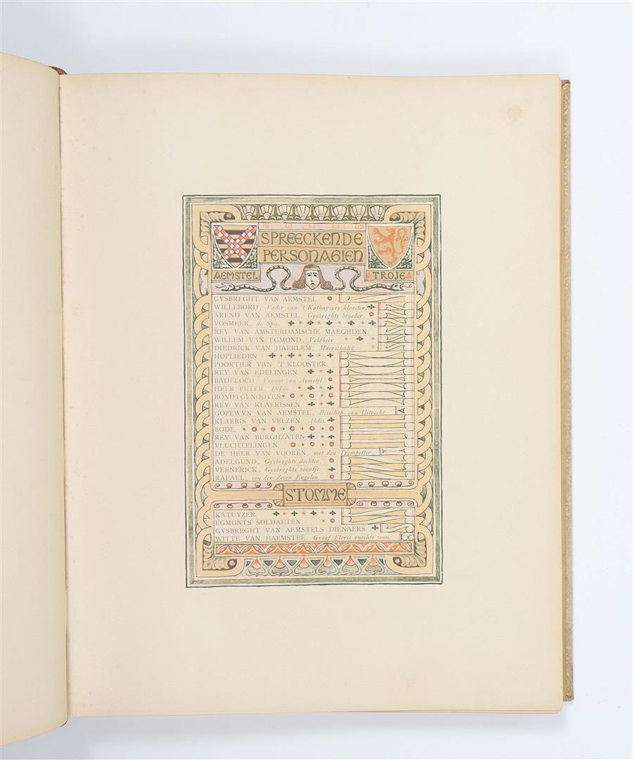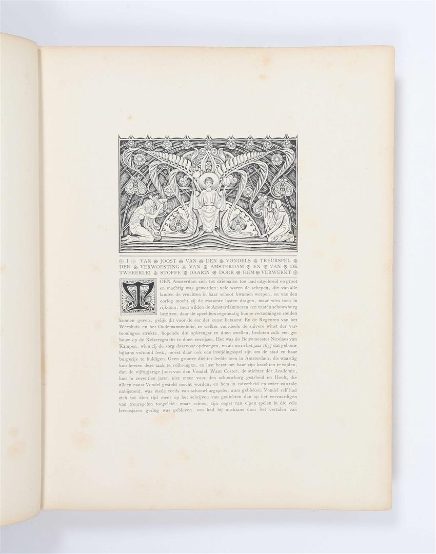Boards sl. rubbed, some foxing. - Beautiful and monumental Art Nouveau book designed by A.J. Derkinderen and published in instalments between 1893 and 1901 and regarded as the first Dutch Art Nouveau book realized as a true Gesamtkunstwerk. With fine lithographed stage decorations by H.P. Berlage and music composed by B. Zweers & A.M.J. Diepenbrock. Gans, Nieuwe Kunst, p. 93-94; Braches, Nieuwe Kunst en het boek, no. 940309 and p. 393-406.