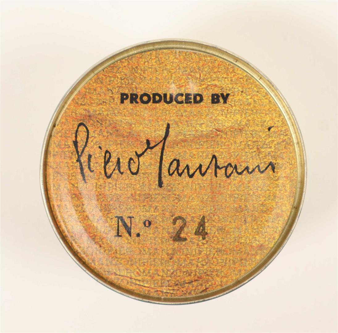 Milan, Fondazione Pietro Manzoni, 1961/2013. Tin can, 7.5 x 7.5 x 6 cm, with printed yellow label bearing text in Italian, German, French, and English. Signed in print and numbered No. 24 on top label.