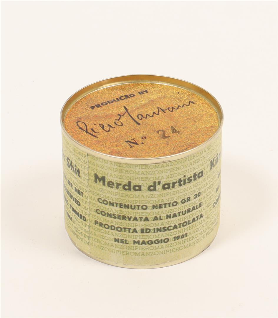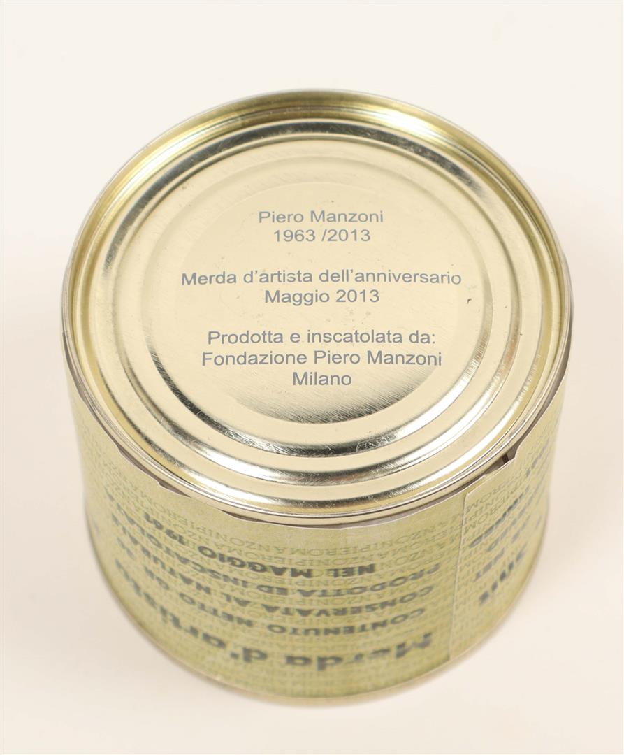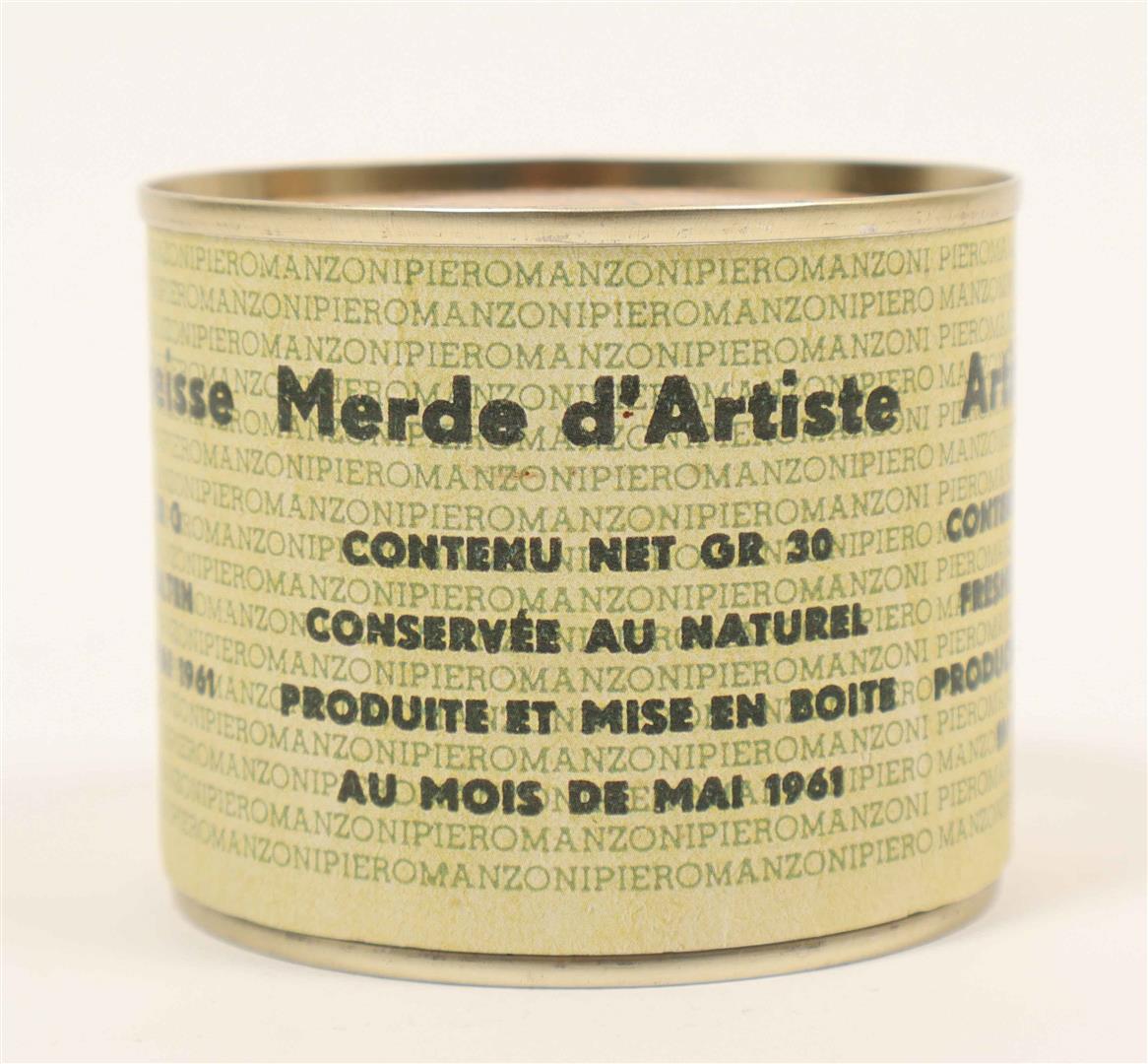In May 1961 Piero Manzoni produced a work of art consisting of 90 tin cans filled with 30 gram of his own excrement; freshly produced, preserved and tinned in May 1961. This facsimile was issued on the occasion of the 50th anniversary of his famous art work in an edition of 9000 copies. Unopened can in very good state, interior condition unknown. Without the cellophane wrap.