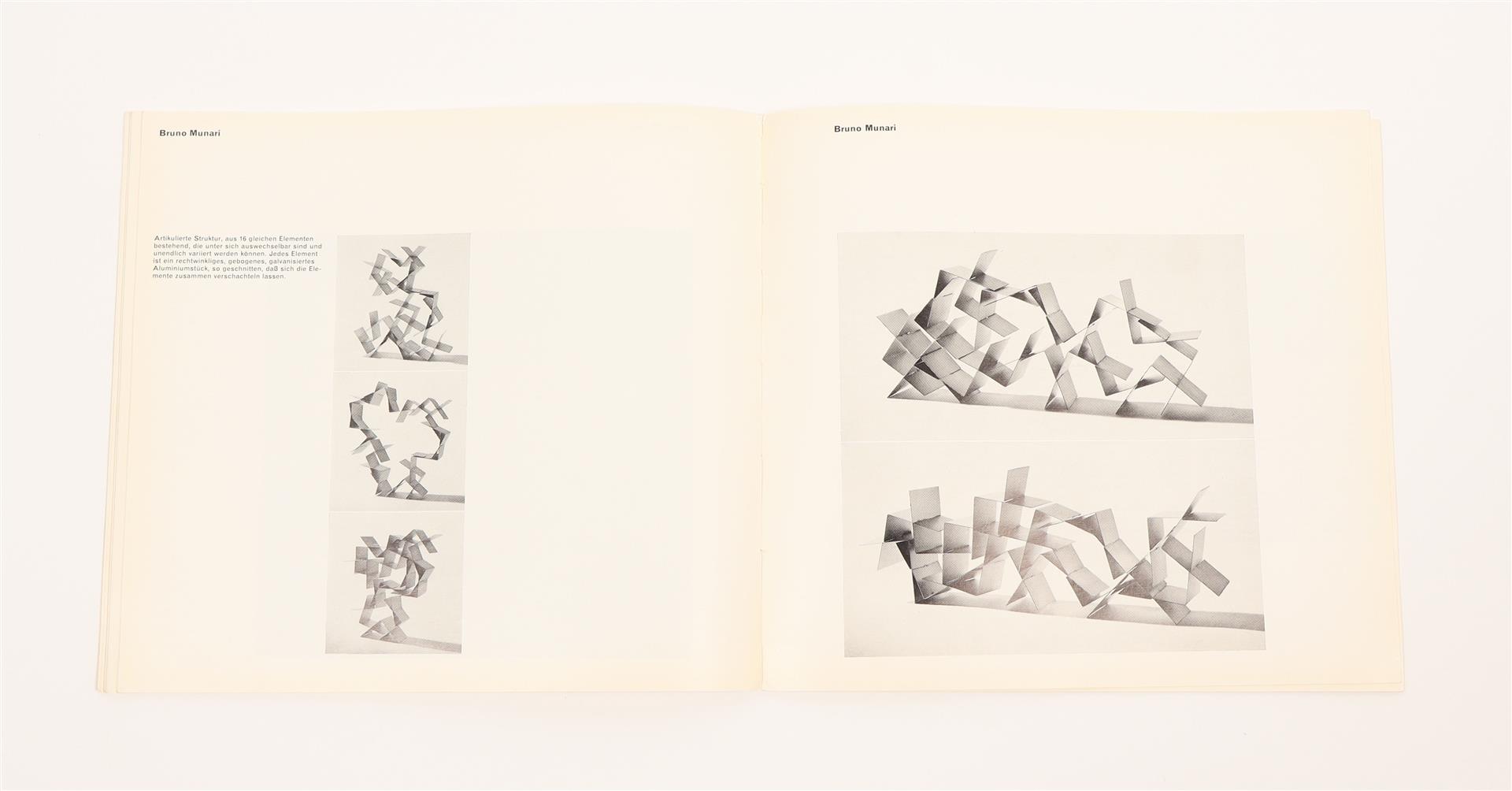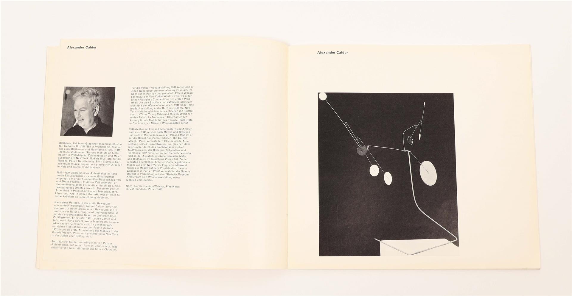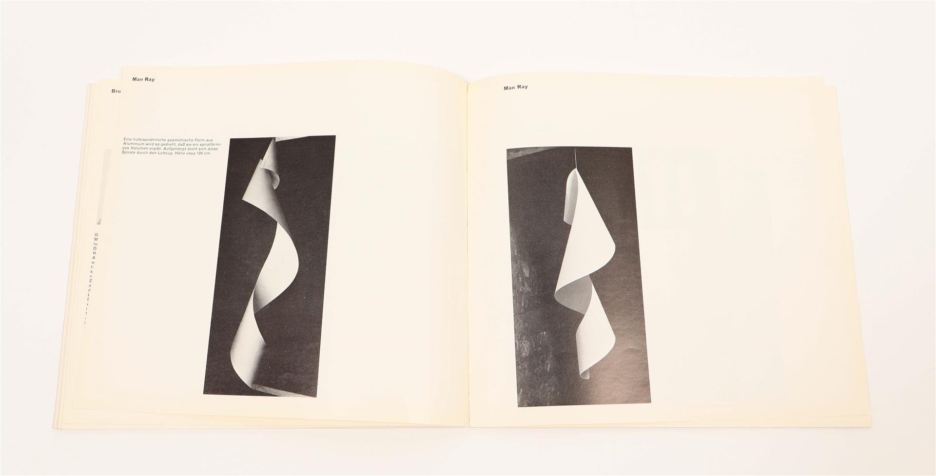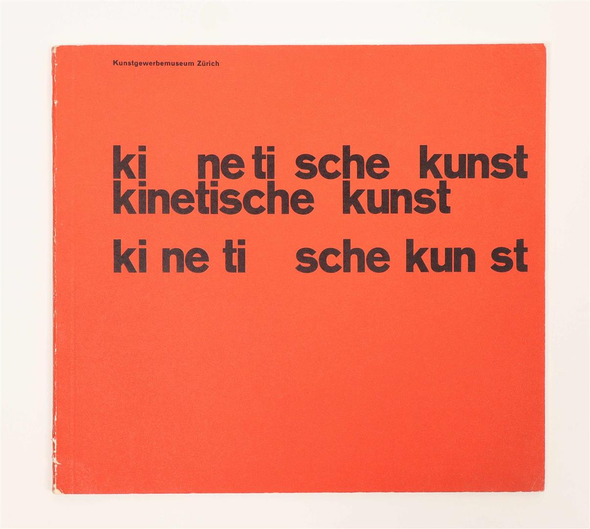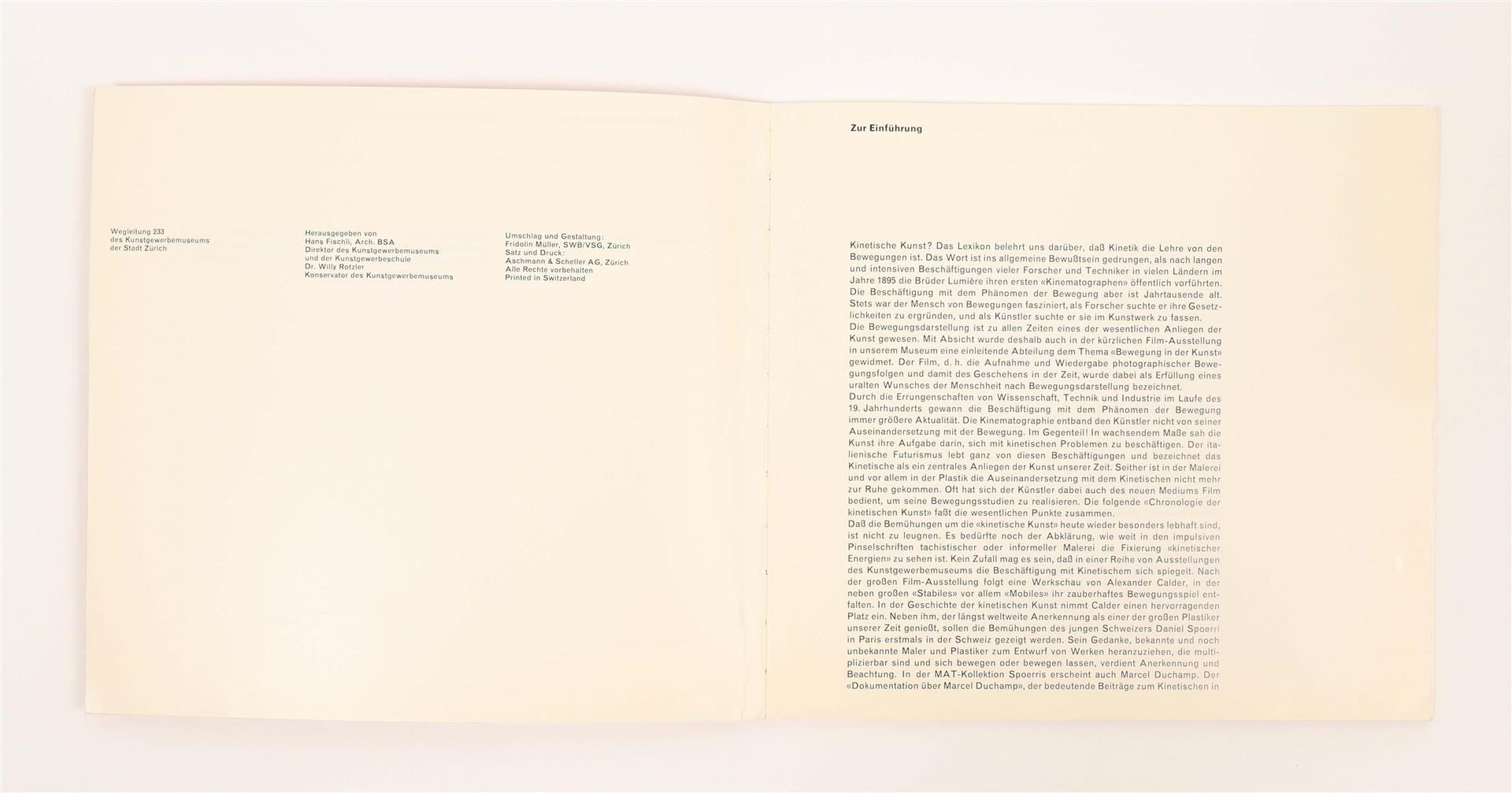 Zurich, Kunstgewerbemuseum Zurich, 1960. Softcover, 22 x 20 cm, approx. 60 unpaginated pp. Designed by Fridolin Müller. Important catalogue of an exhibition focused on kinetic art since 1900, edited by Hans Fischli and Willy Rotzler.