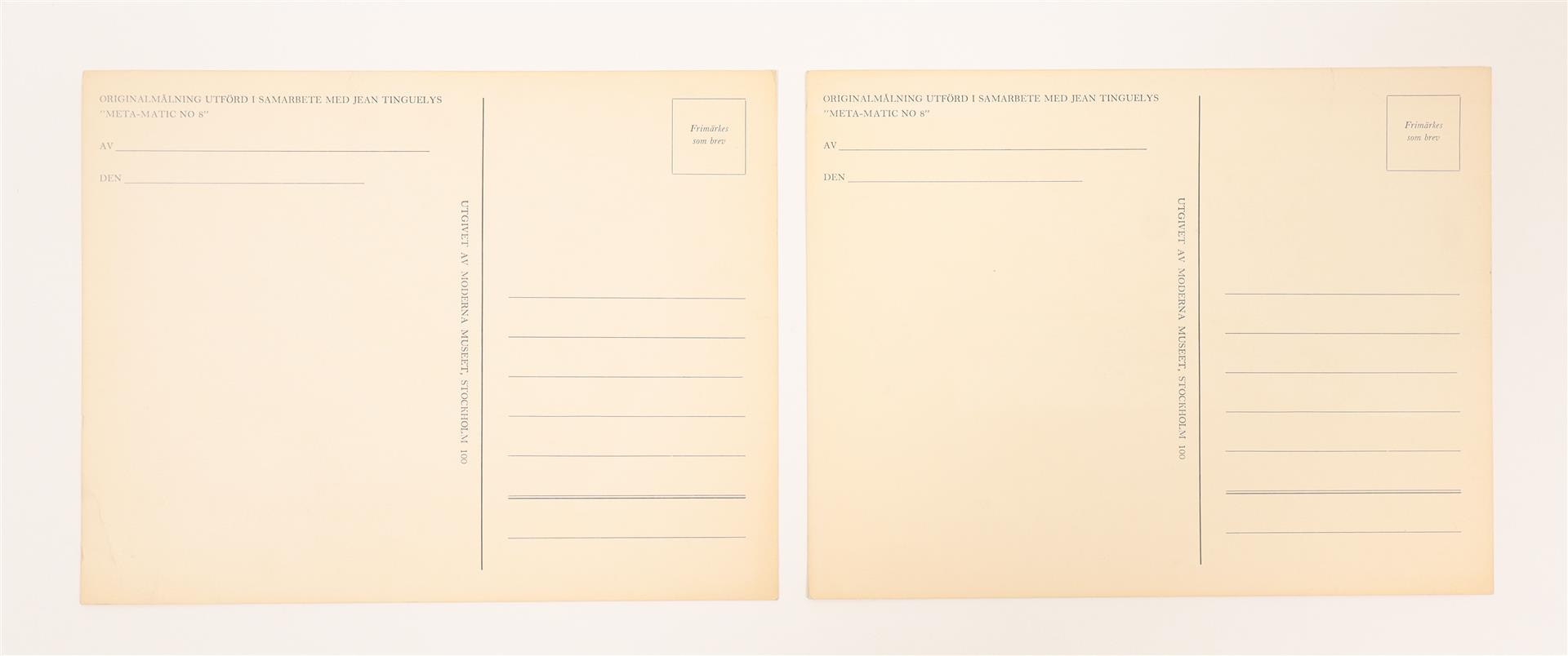 Undated postcards (ca. 1972), 16.2 x 21 cm, published by the Moderna Museet Stockholm. Each features a felt-tip drawing (one in blue, one green and brown). Verso shows publisher's information and printed text (in Swedish) 'original drawing executed in collaboration with Jean Tinguely's 'Meta-Matic No. 8', with space for co-creator and the date (left blank in these copies).