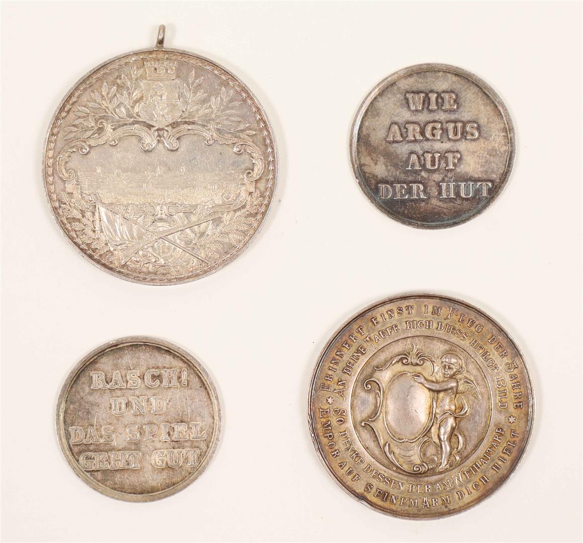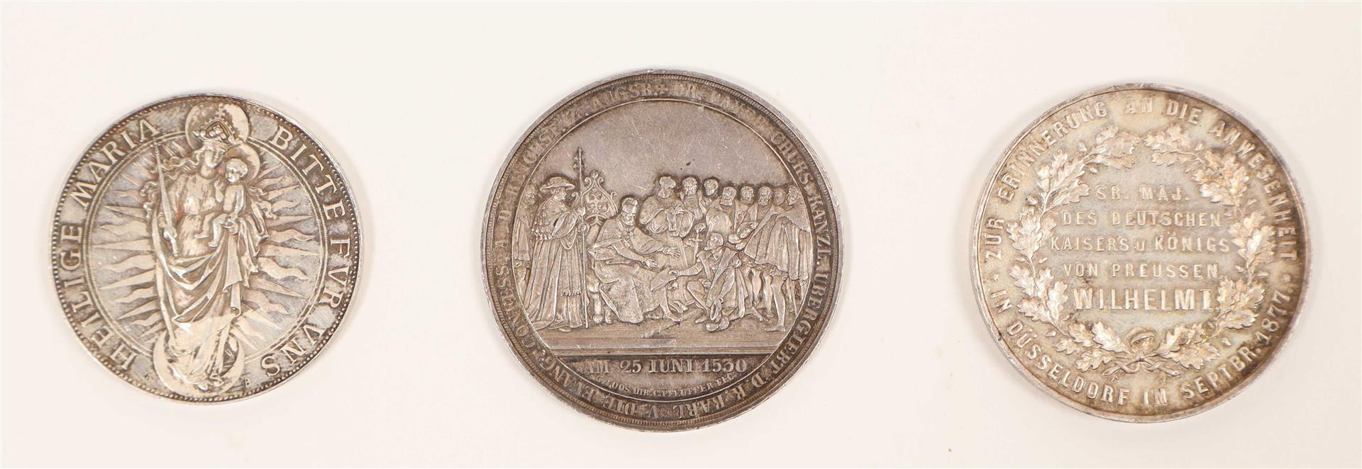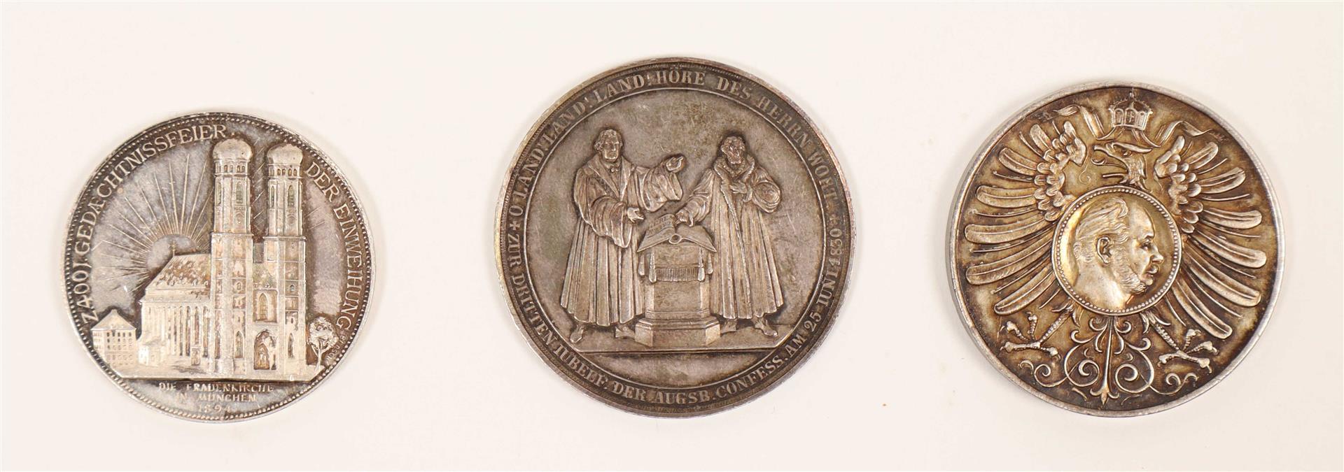 Silver, Ø 4.6 cm, weight 26 gr., recto w. the figures of Martin Luther and Philipp Melanchton standing at an altar w. a bible, surrounded by text and date 25 June 1830, verso w. image of the handing of the Augsburger Konfession to emperor Karl V, surrounded by text and above date 25 June 1530 and signature "G. Loos. Dir. C. Pfeuffer Fec.", made by Christoph Carl Pfeuffer (1801-1861) under direction of G. Loos, along the edge the text "Fein Silber. Werth von einem Ioachims Thaler". -and 8 other tokens, incl. a silver token commemorating 400 years of the Inauguration of the Frauenkirche in Munich, 1894, a silver token on the visit of Emperor Wilhelm I to Düsseldorf in September 1877, a silver token on the "Zehntes Deutsche Budesschiessen Berlin", 1890 and 2 silver "Whistmarke" by D.F. Loos w. the text "Wie Argus auf der Hut" and "Rash! und das Spiel geht gut", early 19th cent.