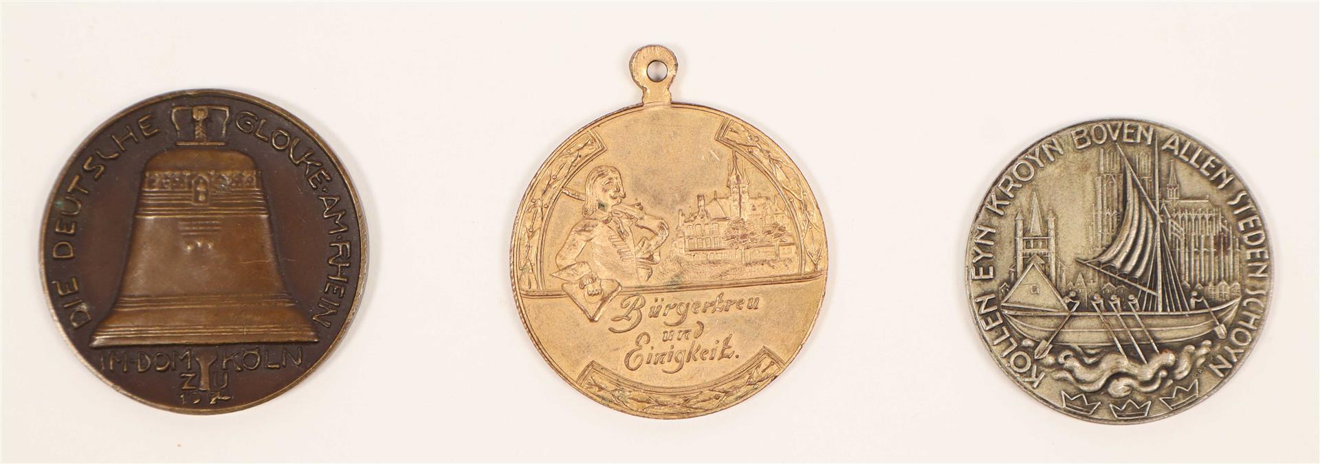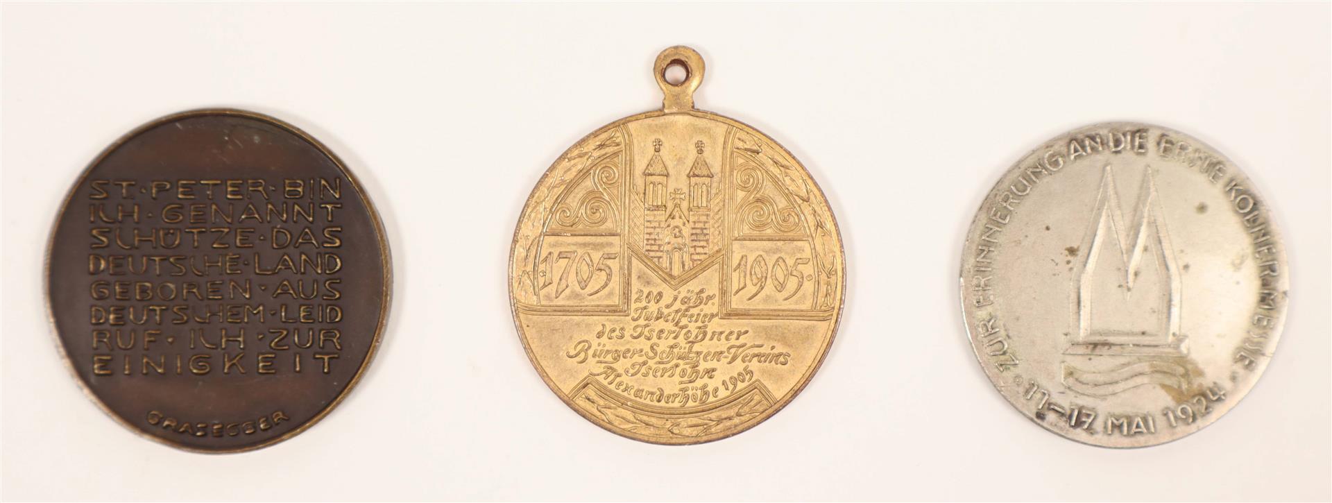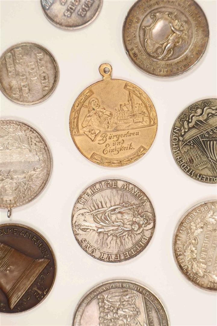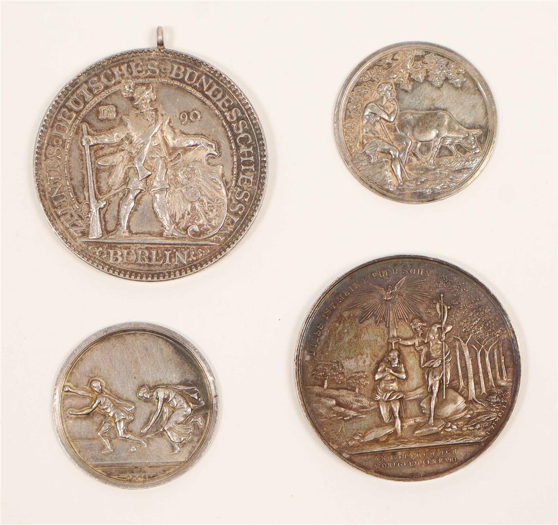 Silver, Ø 4.6 cm, weight 26 gr., recto w. the figures of Martin Luther and Philipp Melanchton standing at an altar w. a bible, surrounded by text and date 25 June 1830, verso w. image of the handing of the Augsburger Konfession to emperor Karl V, surrounded by text and above date 25 June 1530 and signature "G. Loos. Dir. C. Pfeuffer Fec.", made by Christoph Carl Pfeuffer (1801-1861) under direction of G. Loos, along the edge the text "Fein Silber. Werth von einem Ioachims Thaler". -and 8 other tokens, incl. a silver token commemorating 400 years of the Inauguration of the Frauenkirche in Munich, 1894, a silver token on the visit of Emperor Wilhelm I to Düsseldorf in September 1877, a silver token on the "Zehntes Deutsche Budesschiessen Berlin", 1890 and 2 silver "Whistmarke" by D.F. Loos w. the text "Wie Argus auf der Hut" and "Rash! und das Spiel geht gut", early 19th cent.