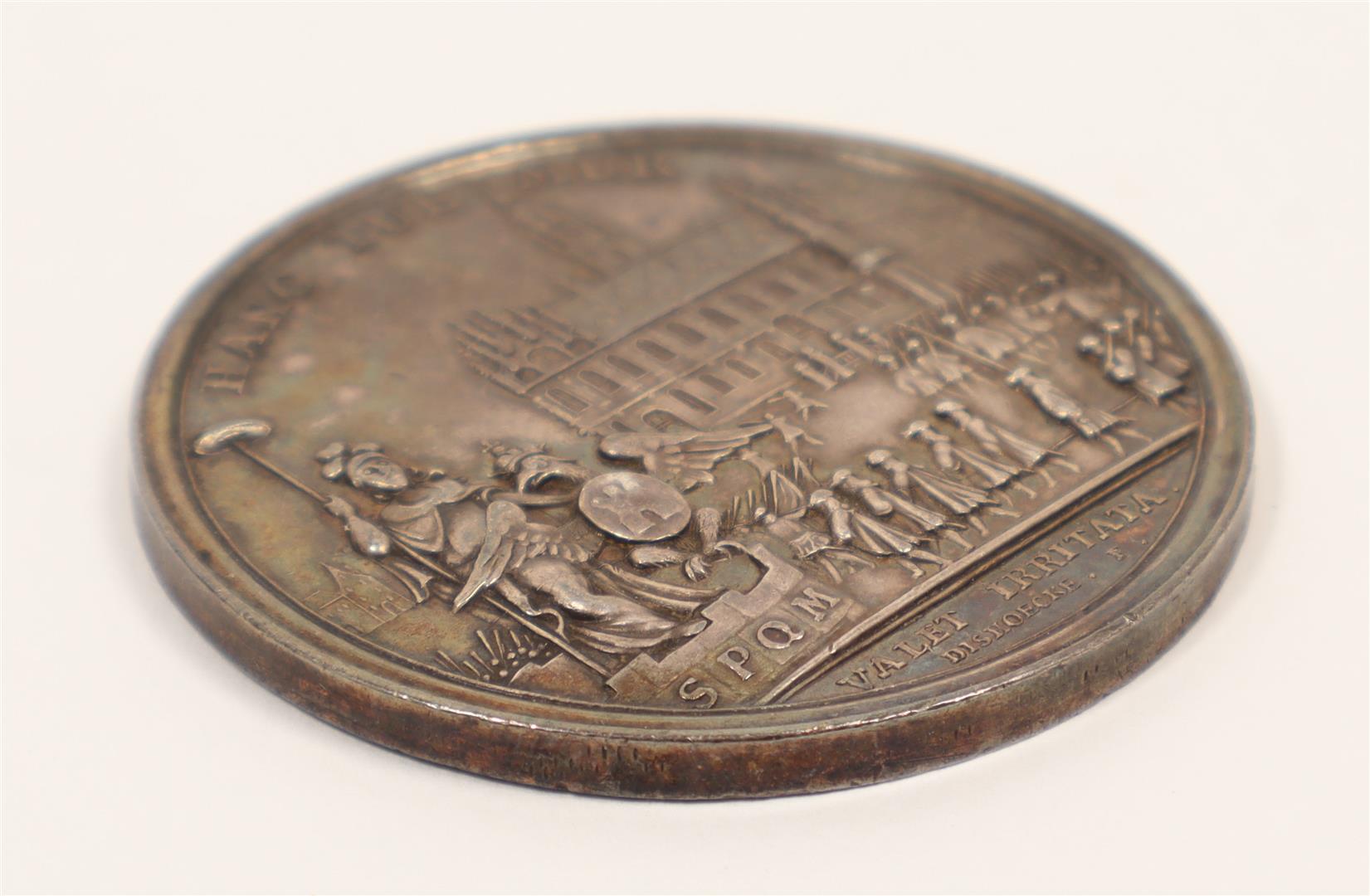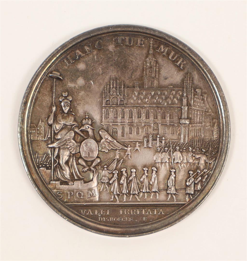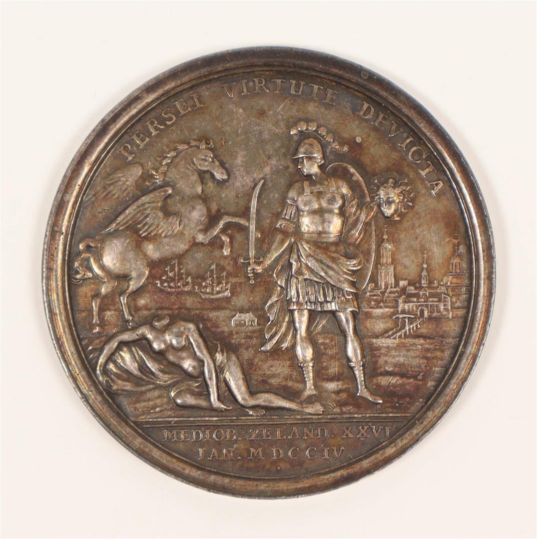 Silver, Ø 4.9 cm, weight ca. 47.5 gr., recto dep. the parade in front of the town hall and the allogorical figure of Freedom, below the text "Hanc tuemur" and above the text "Valet Irritata" and signature "Dishoecke F.", Jacob van Dishoecke (1650-1723), verso w. the image of Perseus holding the head of Medusa, her decapitated body at his feet and his winged horse Pegasus beside him, a view of Middelburg in the background, below the text "Persei Virtute Devicta" and above the text "Mediob. Zeland. XXVI/ Ian. MDCCIV".