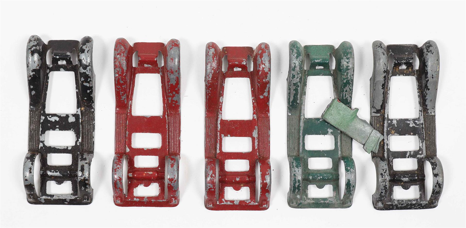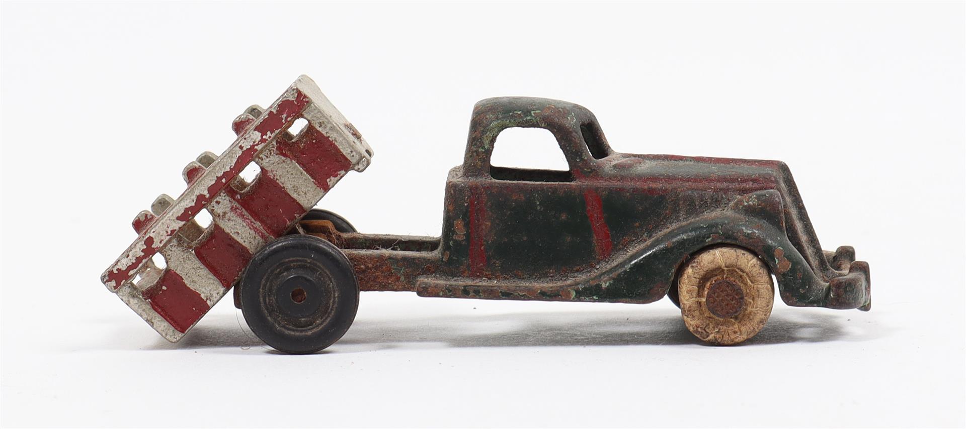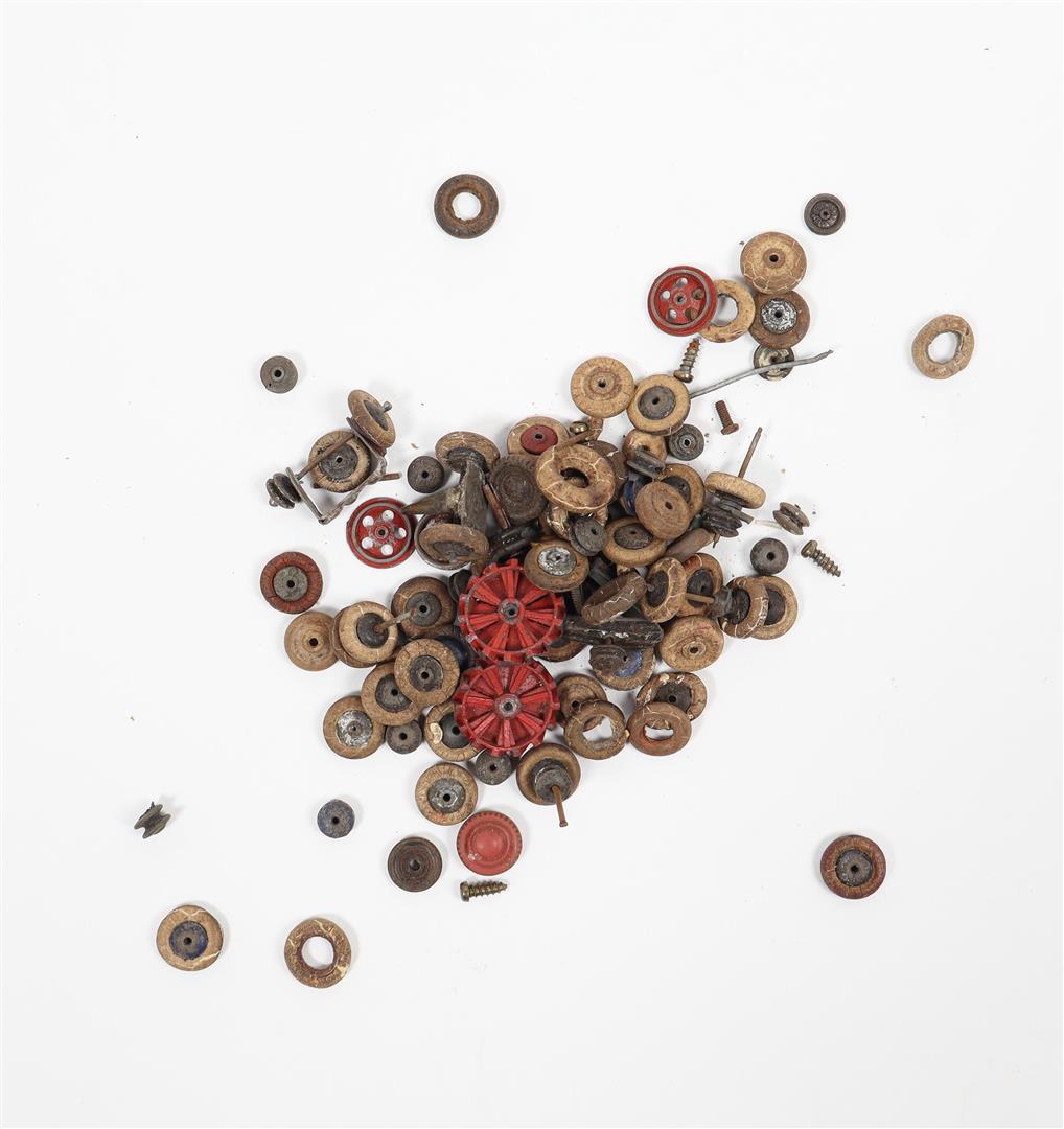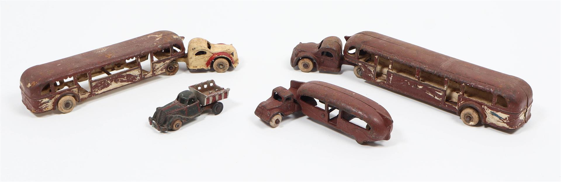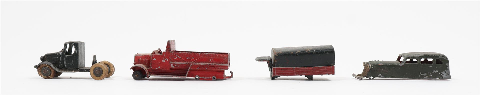 Var. manufacturers, mostly American and from the 1930s, incl. Dinkey Toys, Tootsietoy and Hubley Co. All in heavily used condition, incl. many incomplete parts but also incl. a nice "Long Distance Hauling" truck and 3 large Arcade Greyhound buses. Added to the lot are approx. 85 wheels, tyres and wheel axles from the same period.