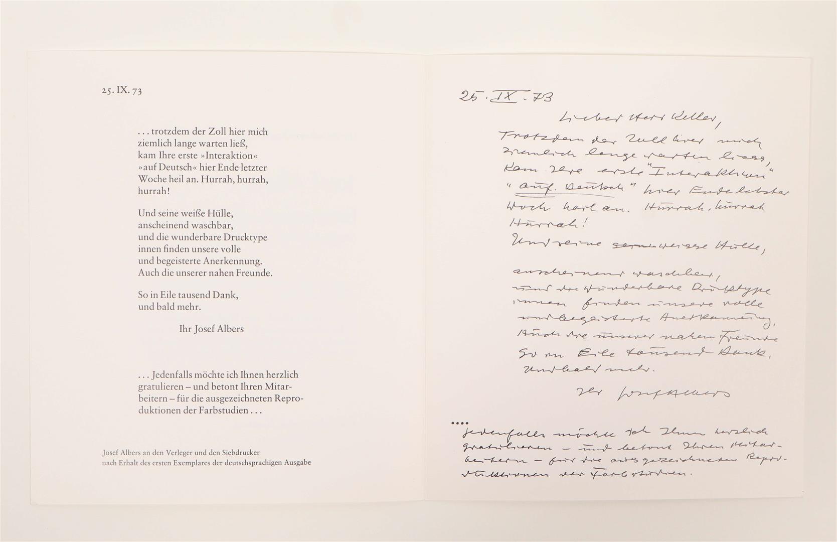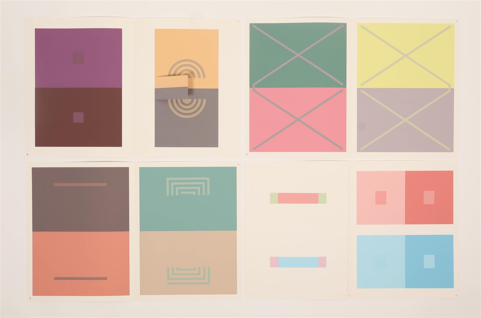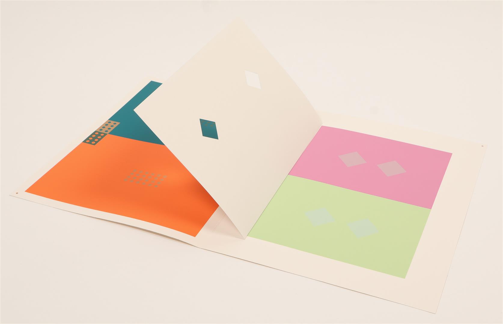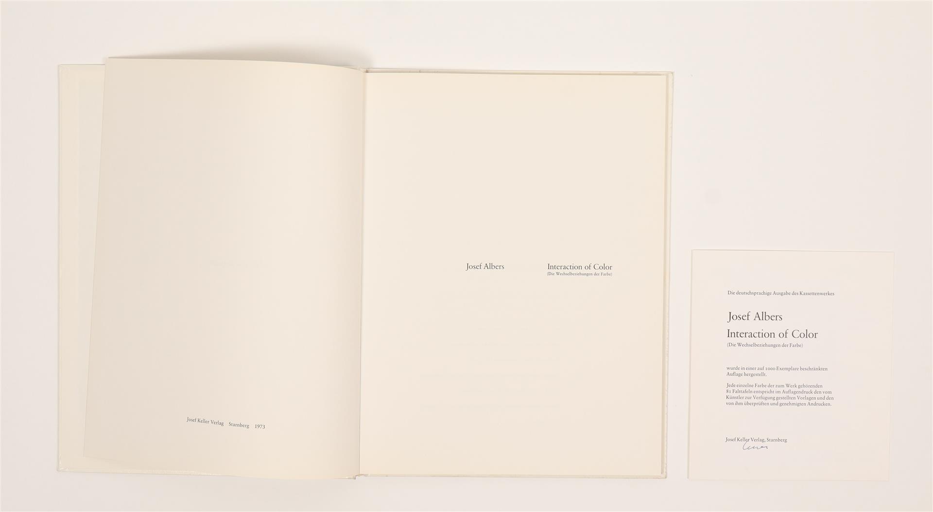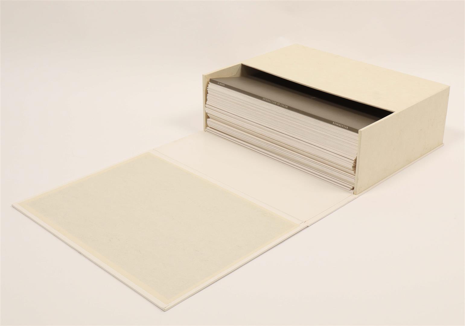 Amazing complete set of two volumes, including 80 folios of screenprints in colours on wove paper with full margins, some with cut-out overlays, the sheets loose and folded (as issued). Also contains an accompanying text book in German with title page, justification, table of contents, and commentary. The two volumes are housed in the original white portfolio box, with white ribbon. This example is from the second edition of 'Interaction of Color' published by Josef Keller in 1973, in an edition of 1000. The first edition, in a brown portfolio box, was published in 1963 by Yale University Press in New Haven and London, in 2000 copies. Light rubbing to the white portfolio box, else in excellent condition.