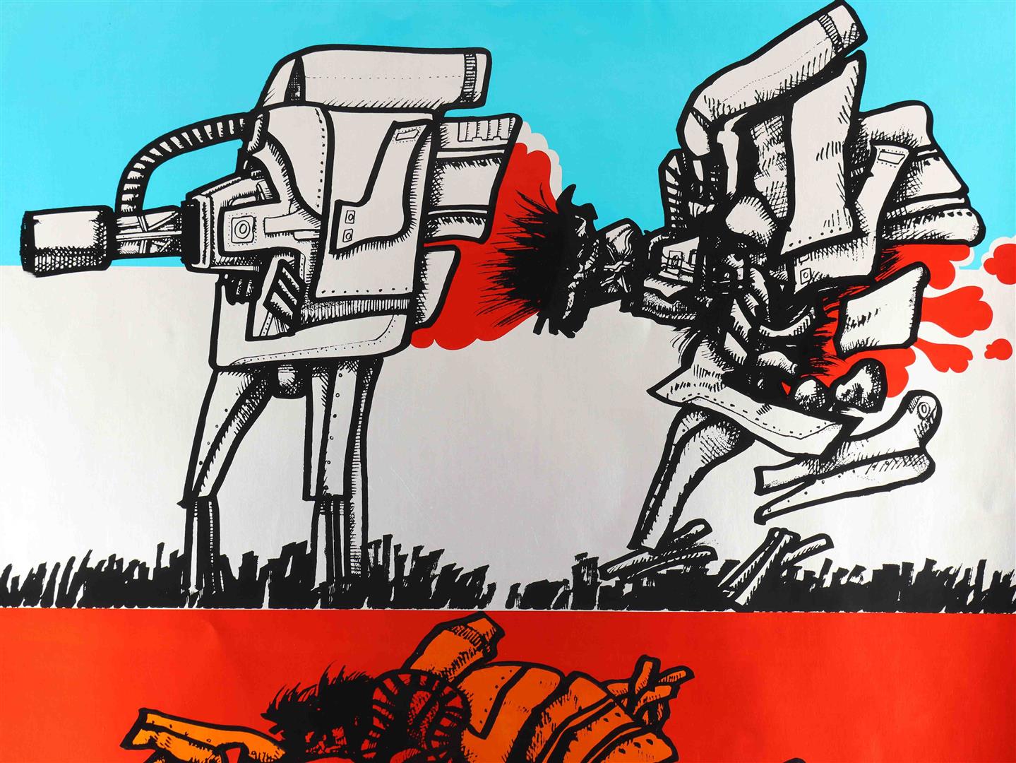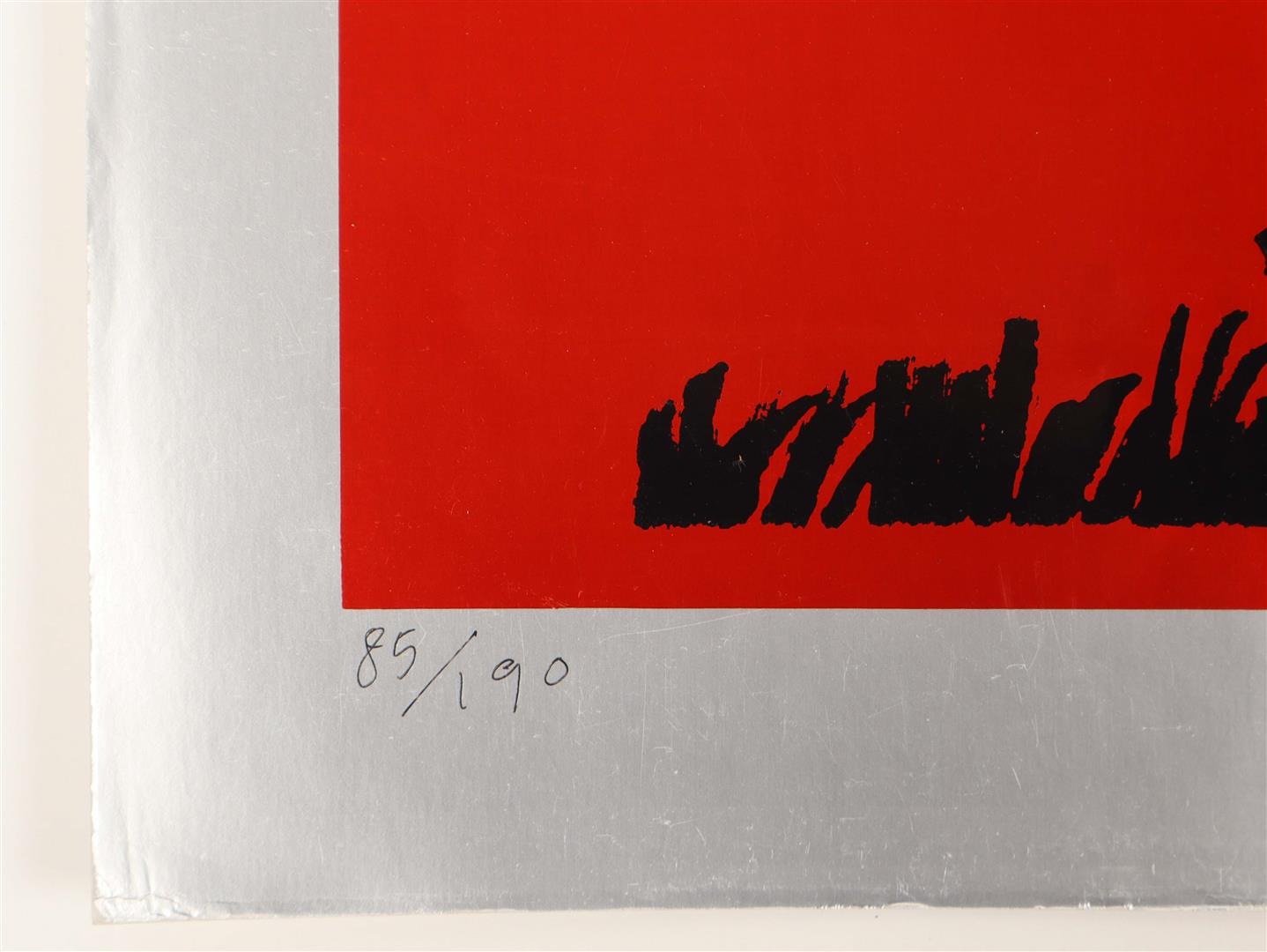 Colour silkscreen in black, red, blue and orange on thick silver-coated cardboard, 57 x 70 cm. Published in the series Prent 190, edited by Louis Gans.