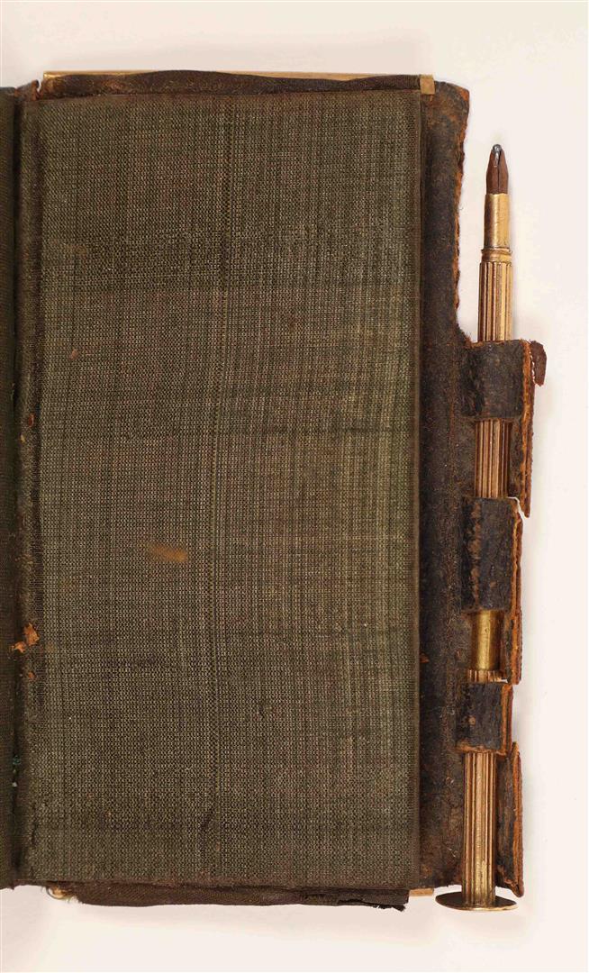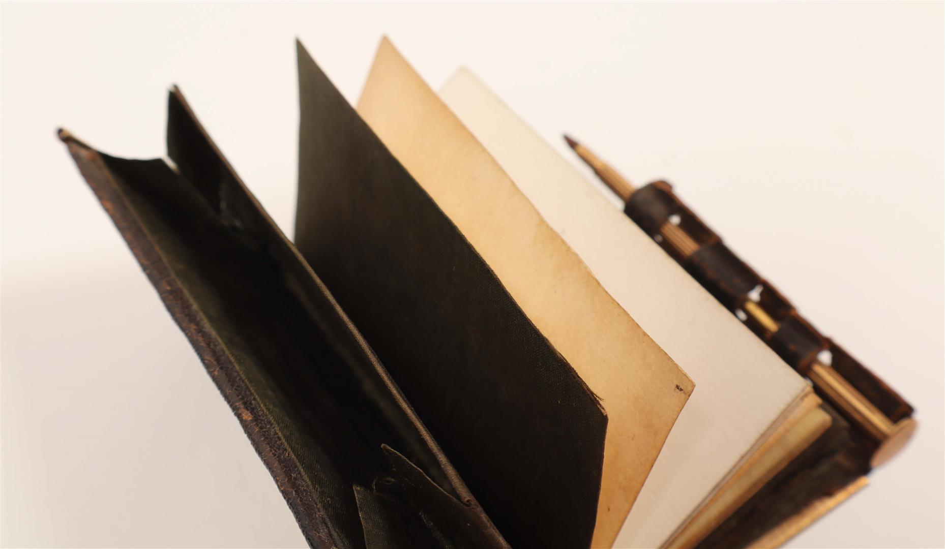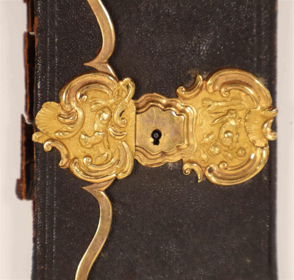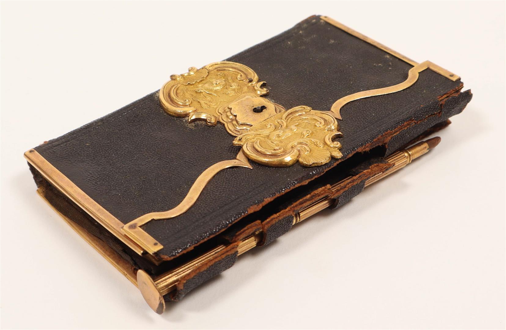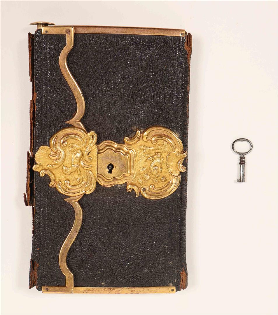 The clasp and catch in low relief dep. a hare and a dog, w. lock and (remarkably) the tiny key preserved. Brass edges of covers; orig. gilt brass pen, consisting of two interlocking parts, preserved in holder at the fore-edge; two silk inner pockets; all edges gilt. 11.2 x 6.5 cm. Upper flap together w. part of spine loose. On: Manuscript family notebook of Johan Theodor & Anna Charlotte Simmers-De la Fargue (married 30 Nov. 1760), 6 laid paper lvs, 4 white cardboard lvs and 2 bone or thick vellum lvs, 5 pages w. entries of births, baptisms, deaths and marriages dated 1760-1842.