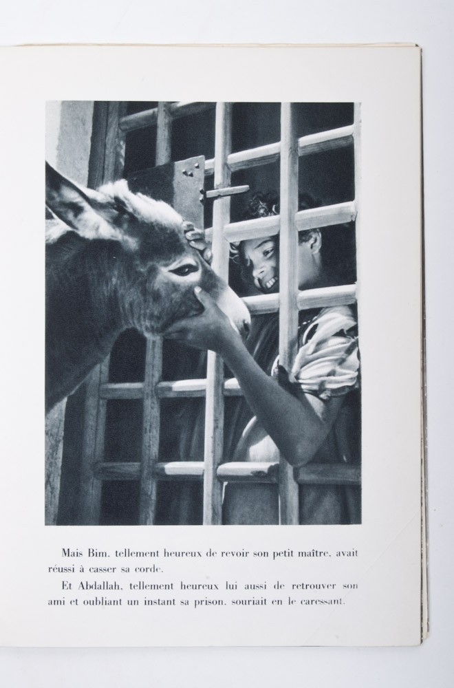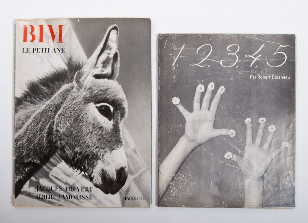 1,2,3,4,5. Robert Doisneau. Mis en page by Albert Plécy. Éditions Clairefontaine, Lausanne, 1955. Unpaged. Photographic children's book with 12 full-page photo pages. The successive pages have a increasing number of objects (2 kittens in a shoe, 7 acrobats in a human pyramid, 12 eggs in a field etc.) The leaves are loose in boards, else good. + Bim Le petit Ane. Jacques Prévert, Albert Lamorisse. Hachette, 1959. Photo adventure of a boy and his donkey. Unpag. With dust jacket (small tears in margin).