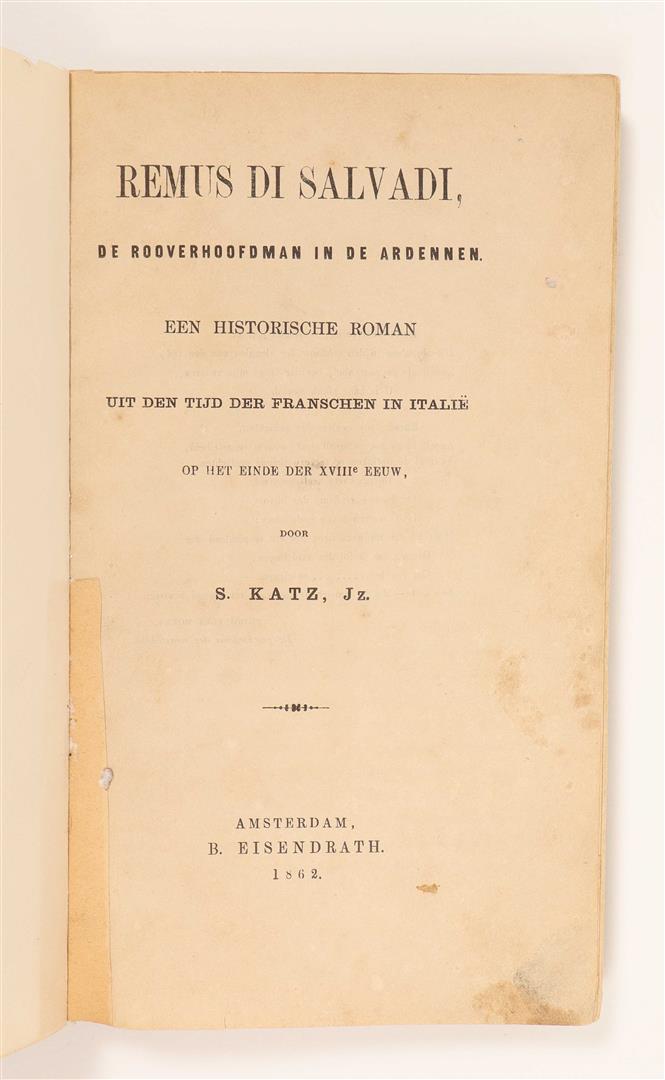 Een historische roman uit den tijd der Franschen in Italië op het einde der XVIIIe eeuw. Amst., B. Eisendrath, 1862. (6),250 p. Bound in simple later hcl. Occas. (large) closed tears, closed hole on pages 161-2 w. loss of some text, foxed/ stained throughout. From the Library of Michiel Buisman, w. his signature and date of purchase 19/11 '38 on first free endpaper. His library was sold at auction in 1972. Extremely rare debut, apparently only 1 copy in Dutch libraries (Amst.).