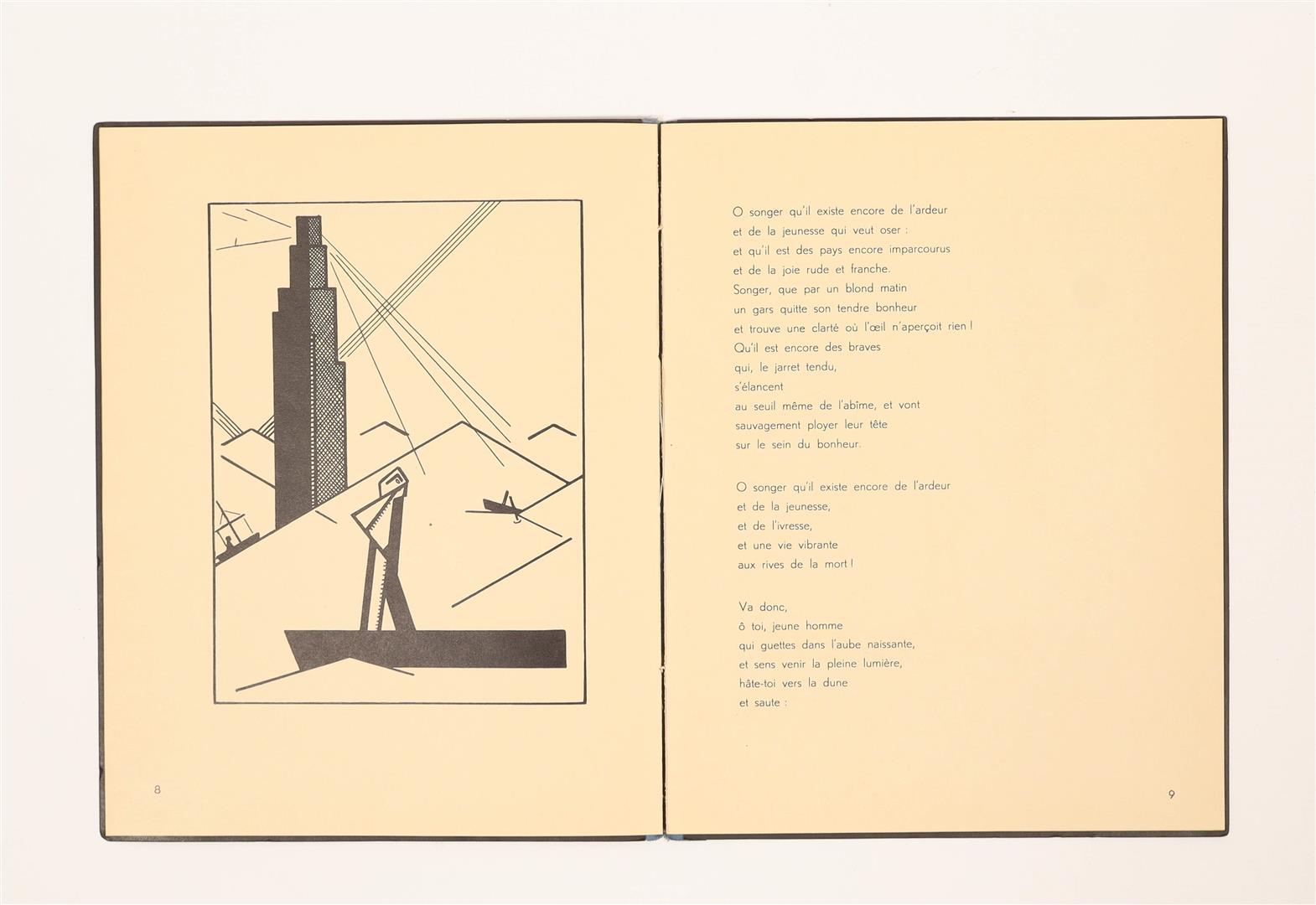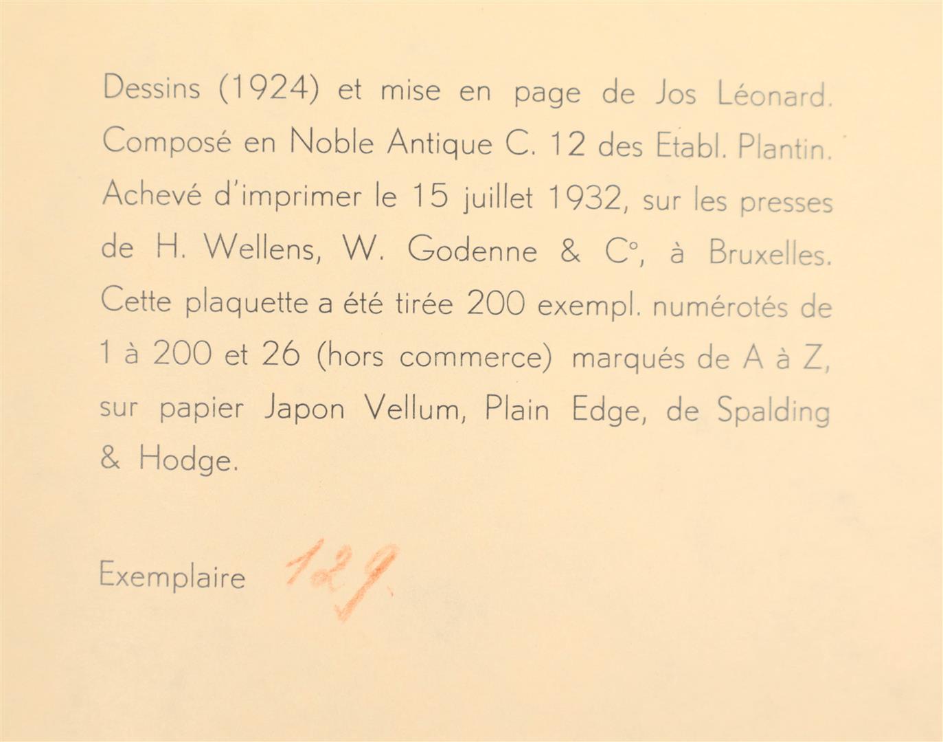 Traduit du Flamand par Jane Molloy. Printed in Brussels by H. Wellens, W. Godenne & Co. for De Sikkel in Antwerp, 1932, in 226 numb. copies on Japon Vellum (no. 129 of 200 copies), 23 p., designed and ill. with 4 full-p. plates. Orig. clothbacked limp boards by Jos Léonhard (1892-1957), 4to. Good copy w. minimal imperfections.
