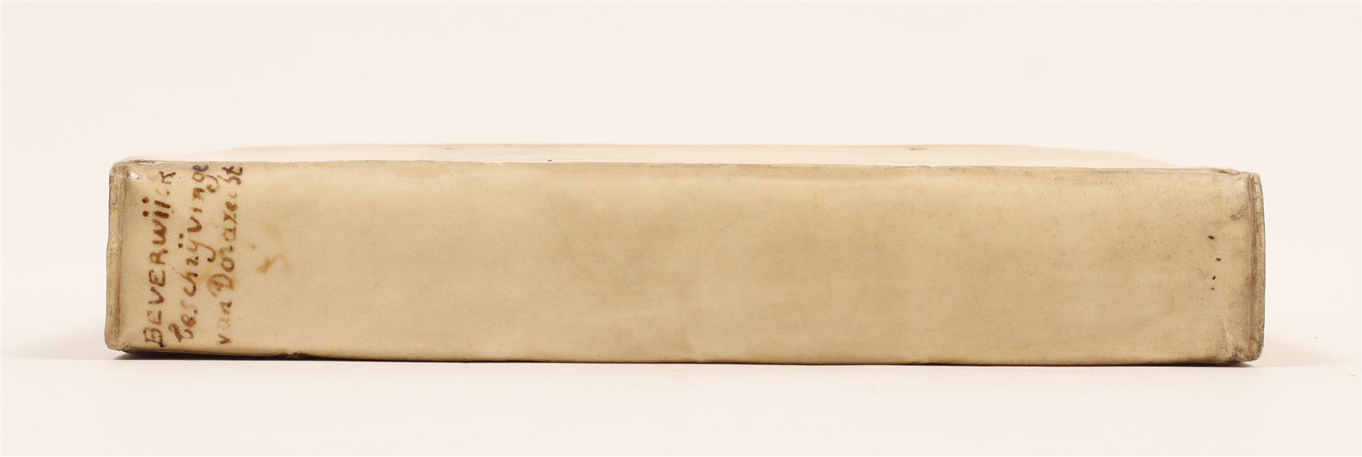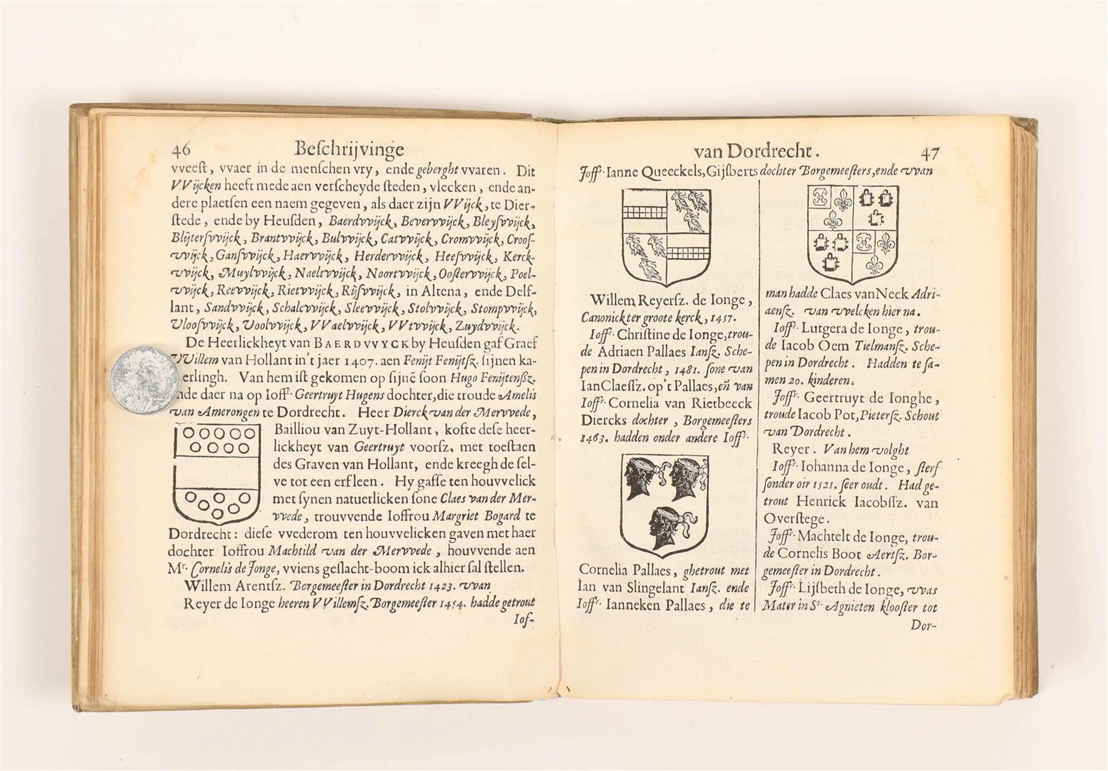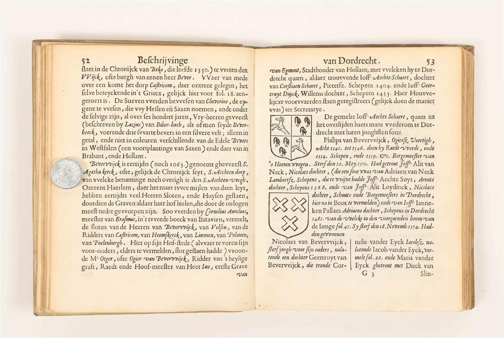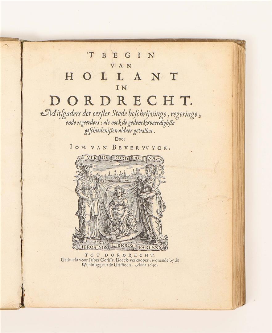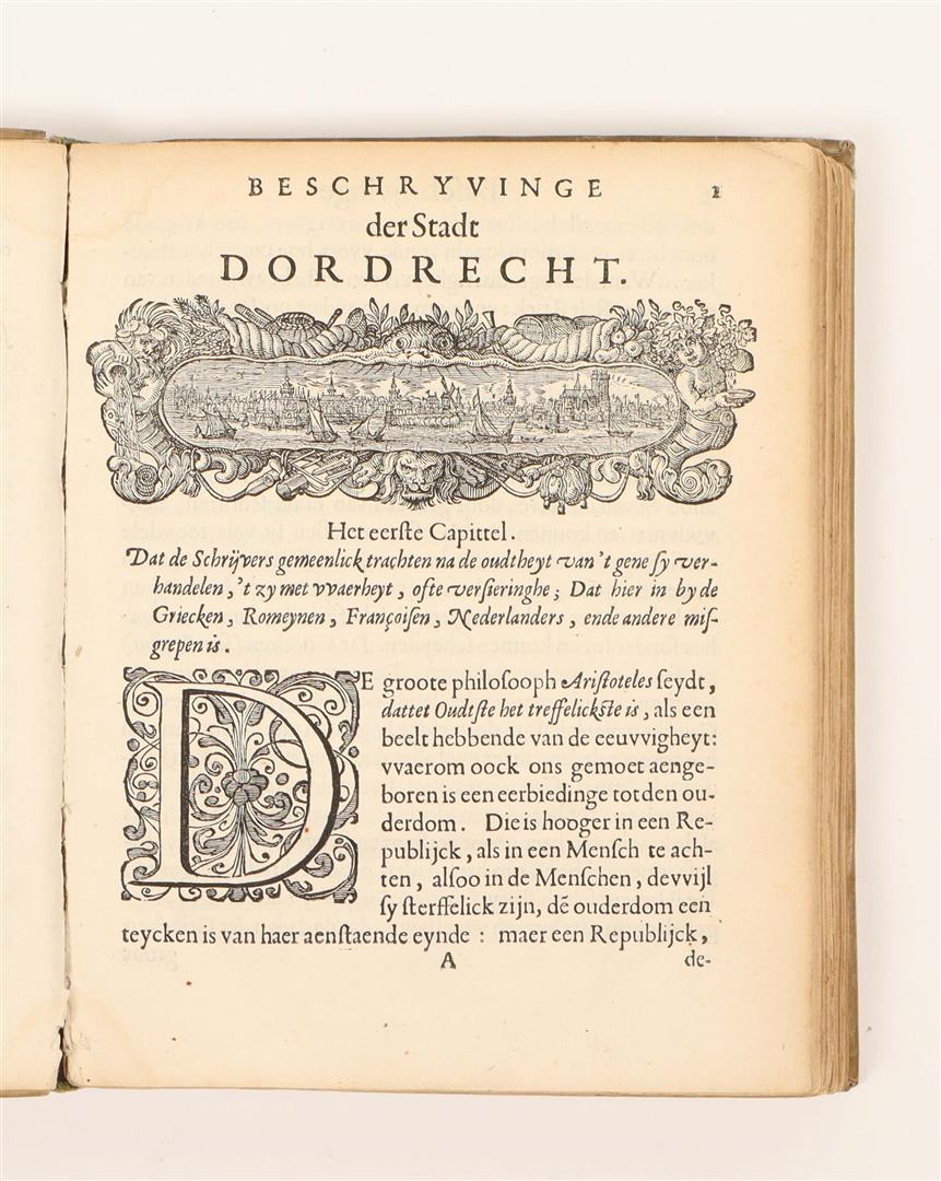 Mitsgaders der eerster stede beschrijvinge, regeringe ende regeerders, als oock de gedenckwaerdighste geschiedenissen. Dordrecht, J. Gorisz., 1640. (8),360 p., w. woodcut printer's mark on title, woodcut headpiece w. a view of Dordrecht and 36 (mostly heraldic) woodcuts in text. Contemp. vellum w. remnants of ties, 4to.