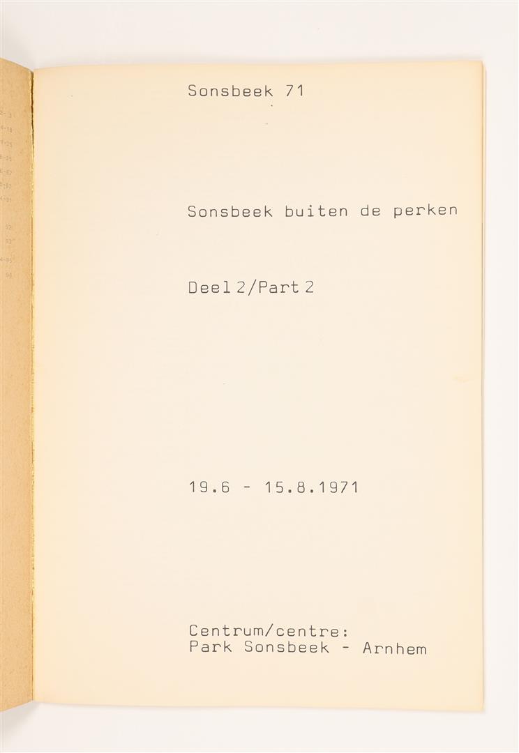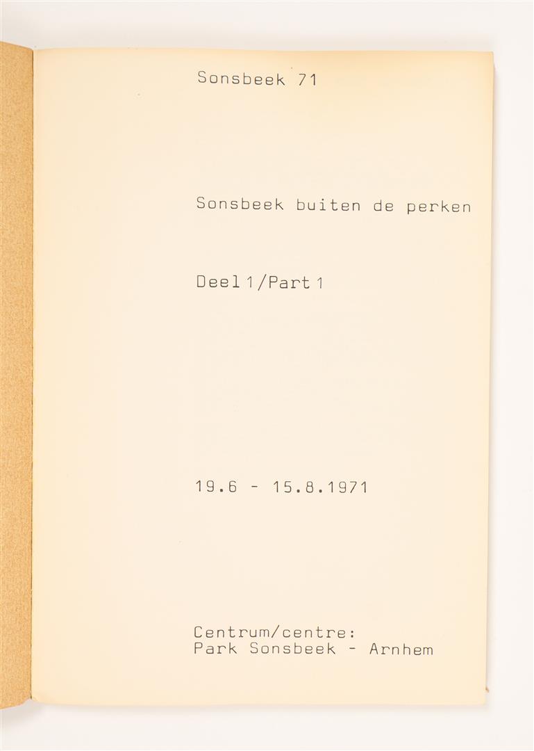 Arnhem, Stichting Sonsbeek, 1971. (1-2) Catalogues Part 1 & 2 of the famous international exhibition, edited by Wim Beeren, Geert van Beijeren and Coosje Kapteyn, designed by Wim Crouwel. Softcover, 29.5 x 21 cm, 232 / 96 pp., text in Dutch and English. Contributions by Carl André, Vito Acconci, Donald Judd, Sol Lewitt, Bruce Nauman, Nam June Paik, Robert Smithson and many others. Fine copies.
