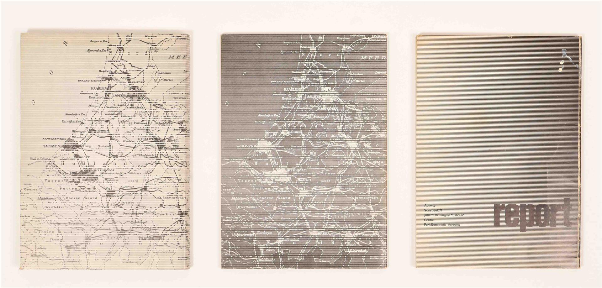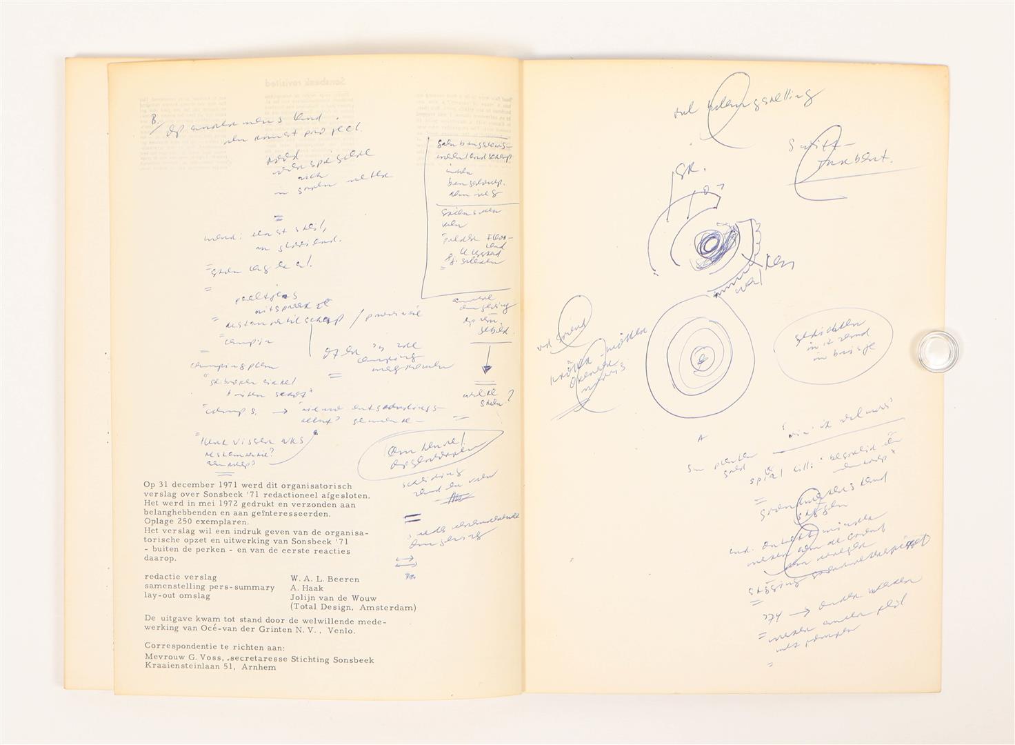 (3) Verslag/ Report Sonsbeek 71. Softcover, 29.5 x 21 cm, approx. 160 pp. Edited by Beeren, featuring a review of organizational issues and press reactions, published in 1972 in an edition of 250, sent to stakeholders and press, text in Dutch. Rubbing to spine, with scribbled notes about Smithson's Broken Circle in Emmen on the opening and closing pages. (total 3)