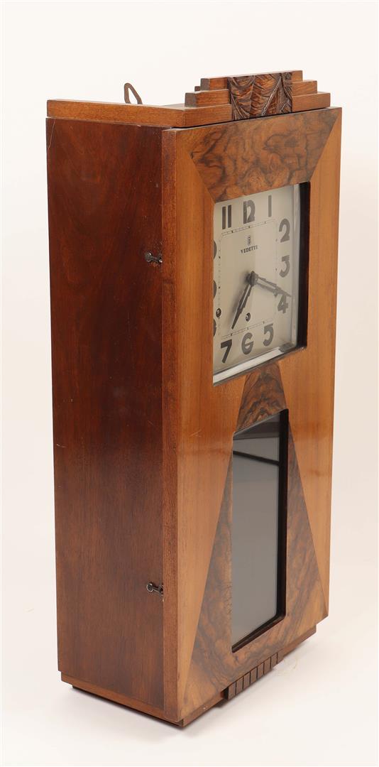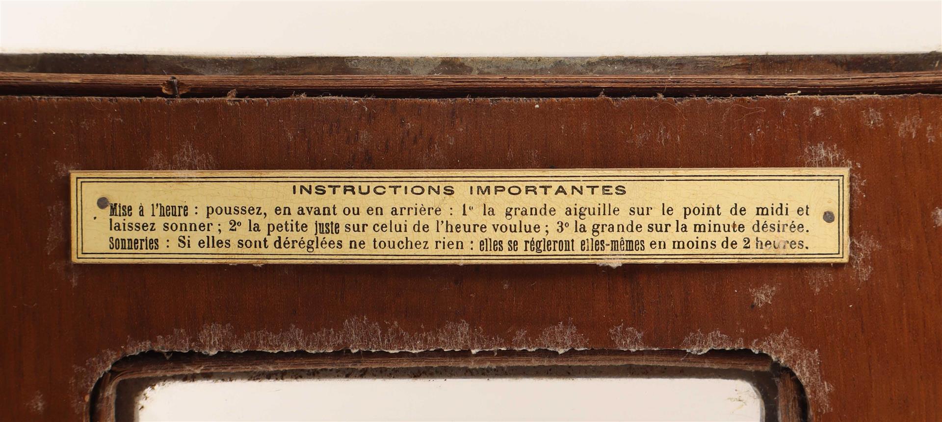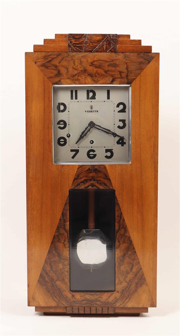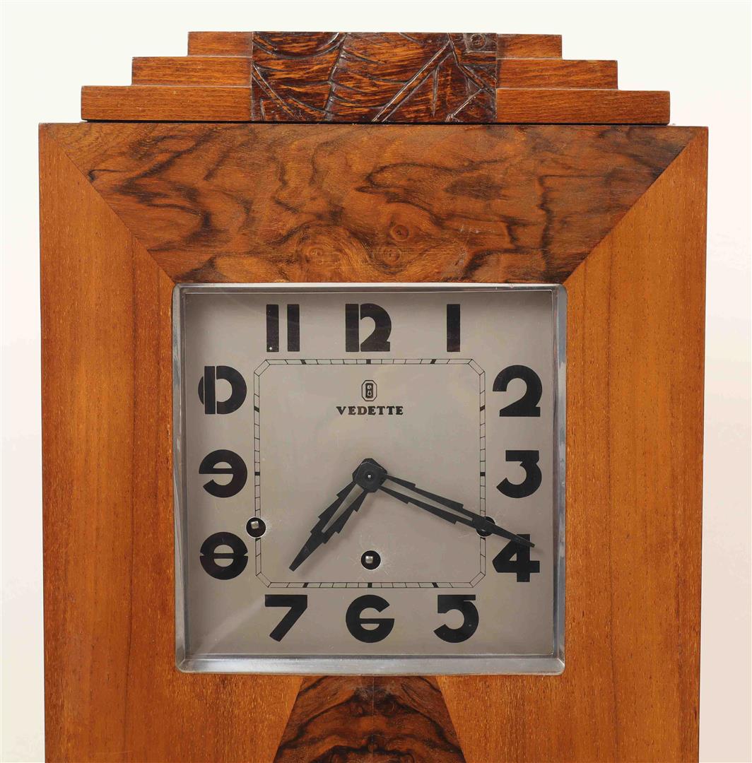 71 x 33 x 18.5 cm (h. x w. x d.). Mahogany case w. inlaid portions of palissander veneer and ornament in relief at the top, the Vedette timepiece itself is set behind looking glass, with 3 winding-holes (key preserved) and multiple bells, France, Art Deco, ca. 1930. In good working order.
