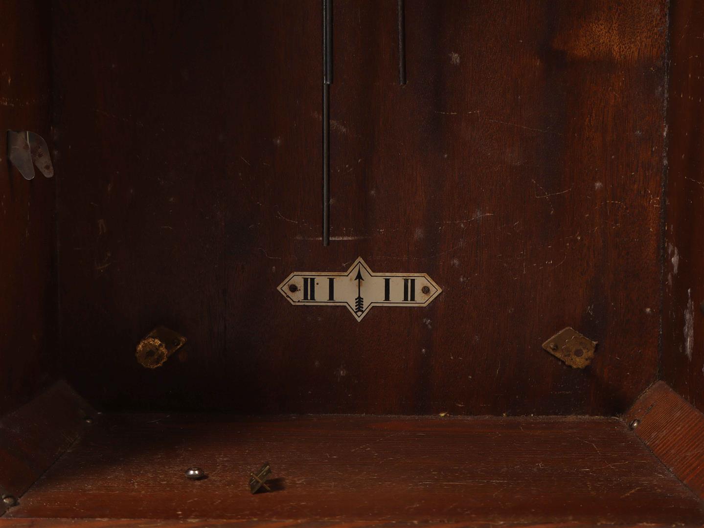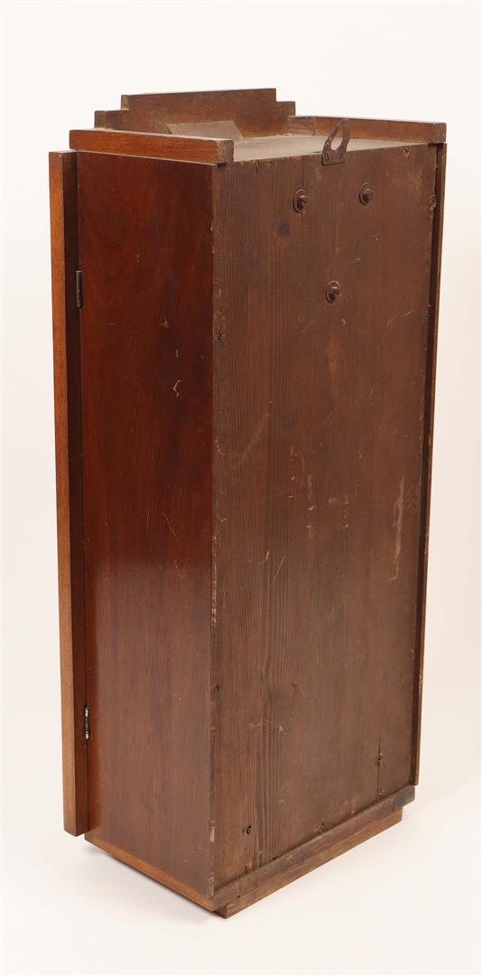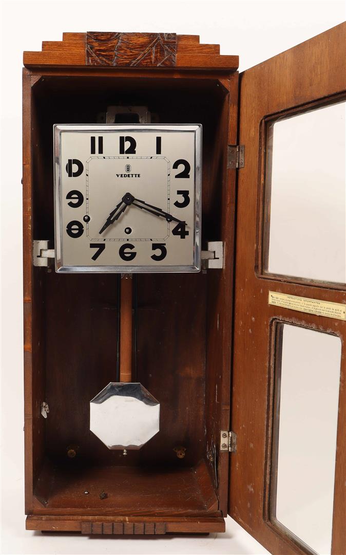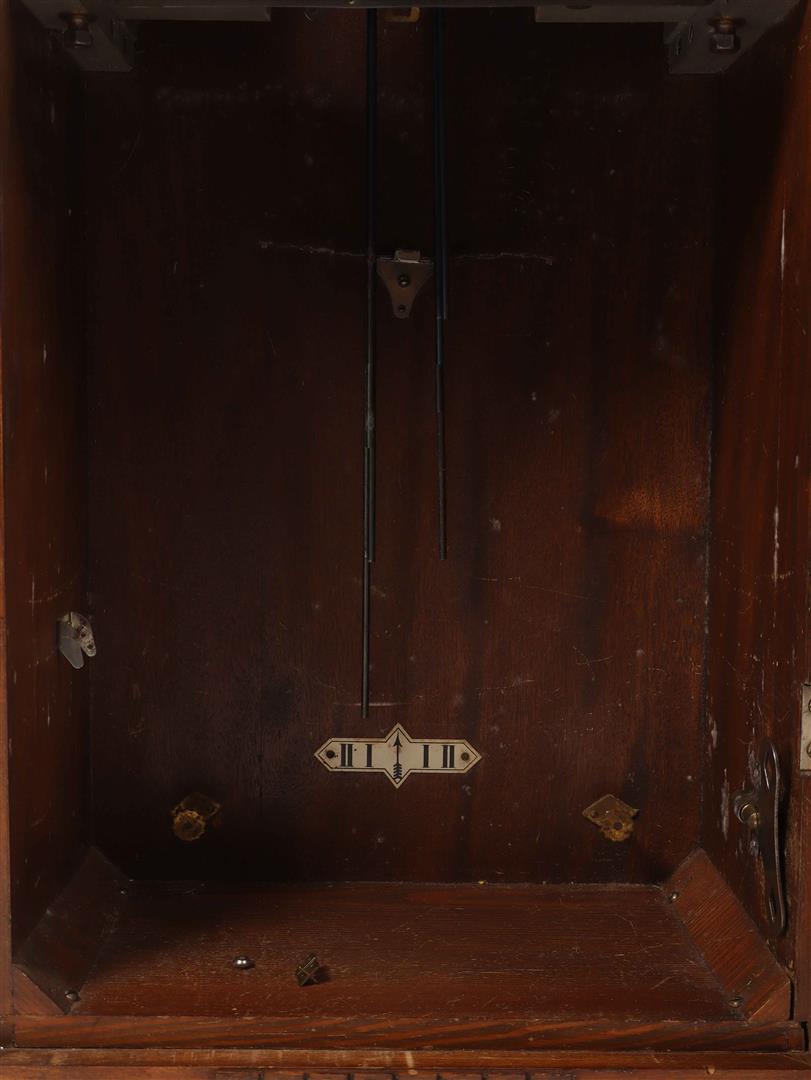 71 x 33 x 18.5 cm (h. x w. x d.). Mahogany case w. inlaid portions of palissander veneer and ornament in relief at the top, the Vedette timepiece itself is set behind looking glass, with 3 winding-holes (key preserved) and multiple bells, France, Art Deco, ca. 1930. In good working order.