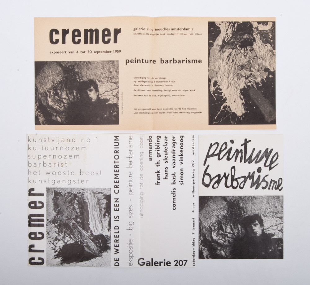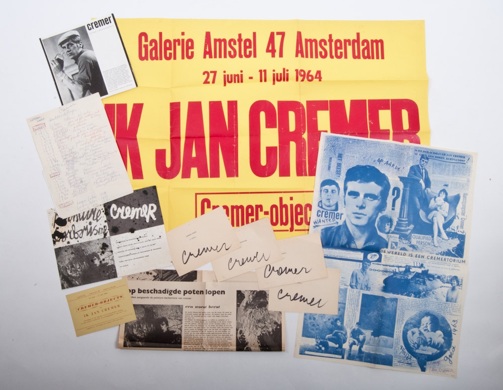 Mostly 1959-1964. A small selection: Poster "Cremer peinture barbarisme" (1960, Sturegalleriet, Stockholm); "Op beschadigde poten lopen. Manifest aangaande de peinture barbarisme van Cremer" (1959); "Peinture barbarisme" (1959, vernissage invitation); poster "De wereld is een Cremertorium" (1961); birth card Clifford Caleb Cremer (1965); poster "Ik Jan Cremer. Cremer-objects" (1964, Galerie Amstel 47 Amsterdam) and several handwrittenen lists with phone numbers and exhibitions.