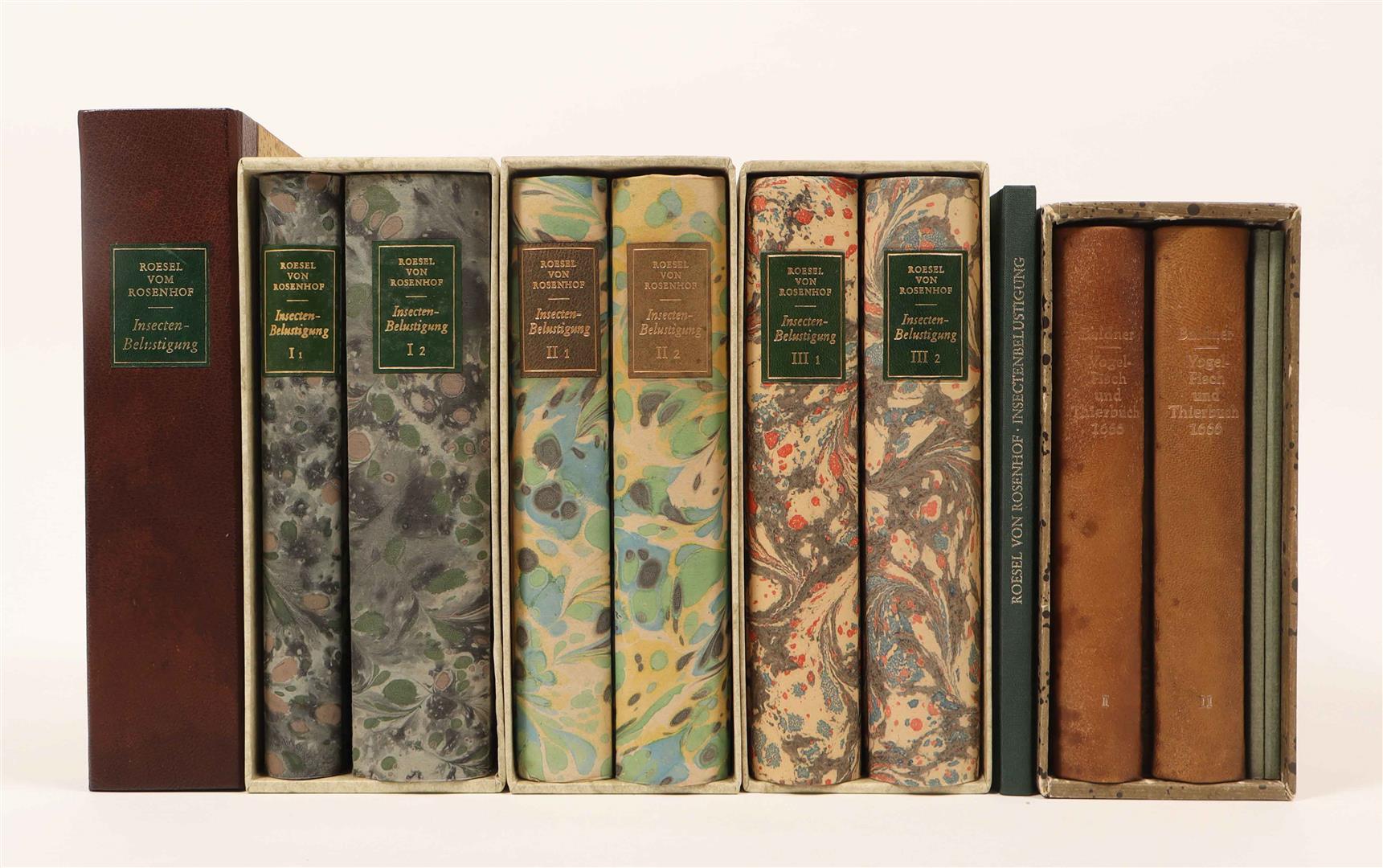 Stuttgart, Müller & Schindler, 1985. Facsimile reprint of the edition publ. 1746-1761 w. beautiful col. reproductions of the plates. 4 vols. in 7 books + 1 introductory/ index vol. Bound in unif. marbled boards w. mor. letterpiece, vols. 1-3 in slipcase, vol. 4 in leather-backed box, introductory/ index vol. in green cloth. Good and complete set. Added: Baldner, L. Vogel - Fisch und Thierbuch. Facsimile ed. publ. by Müller & Schindler, Stuttgart, 1974. 4 vols. in slipcase.