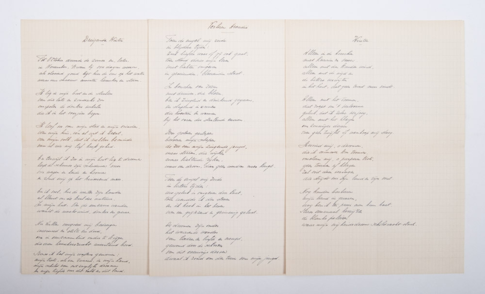 Consisting of 3 handwritten letters (to "Dierbare vriendin", "Lieve Doris" and "Mijn beste Doris"), 3 poems ("Verloren Arcadië", "Winter" and Dreigende Winter") and a menu (signed by the group). - And 2 written cards in another handwriting.
