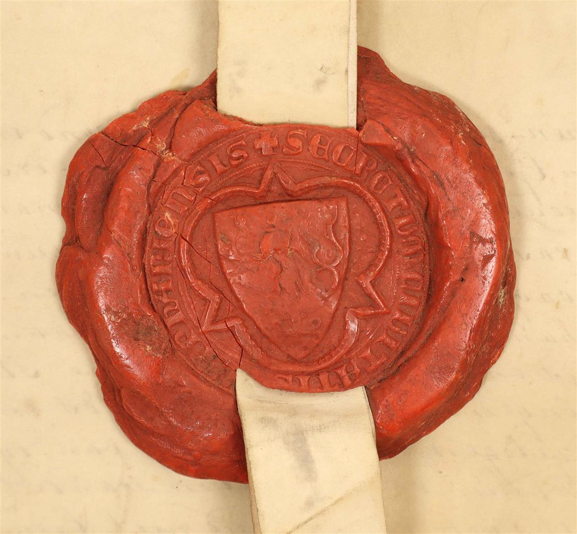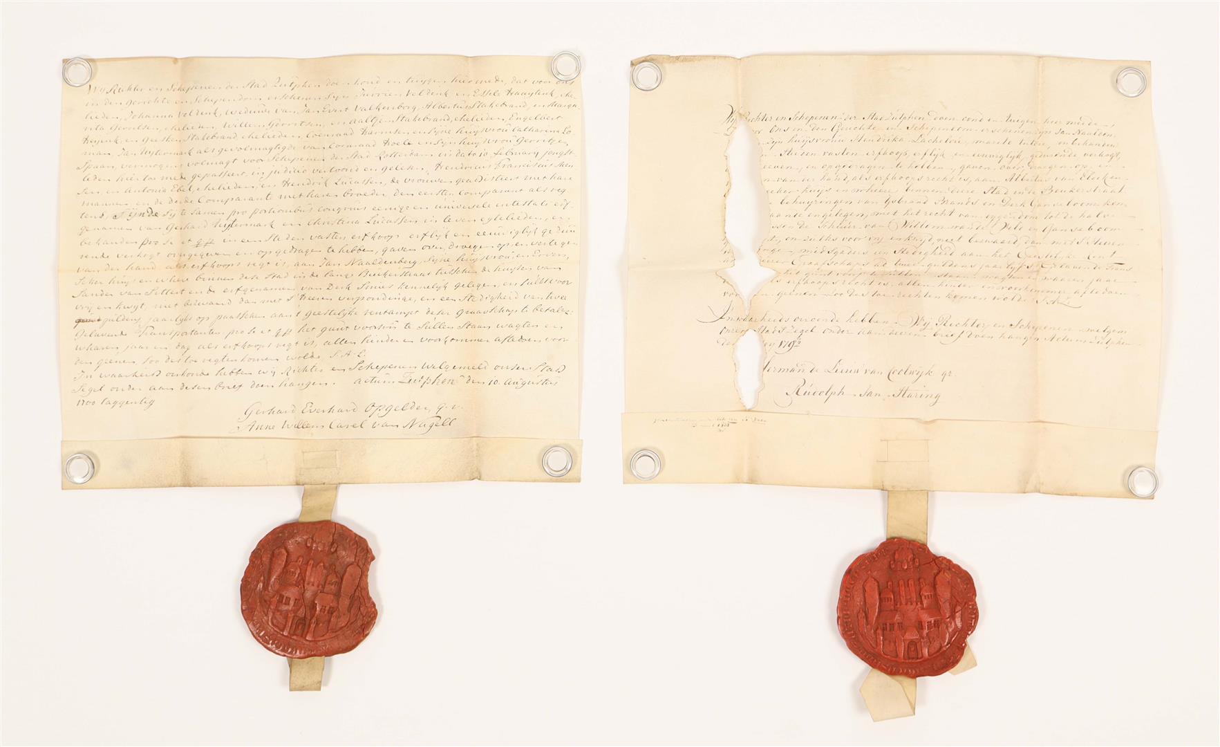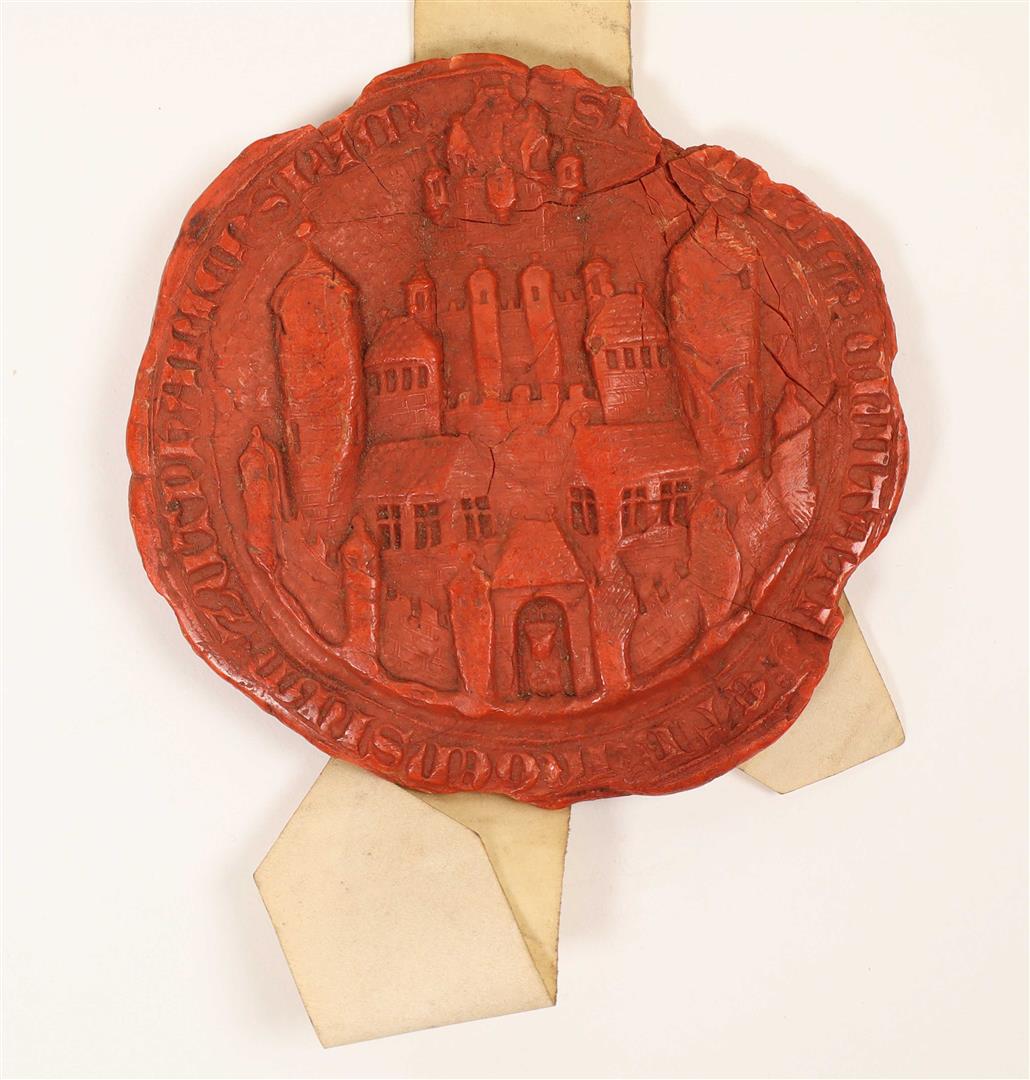 Manuscr. vellum. Five with w. large (dam.) seals: two in red of the city in Zutphen, and one in black of the city of Groningen. The two Zutphen documents registering the sale of shipped goods, one of them decommissioned (part torn off, some loss of text). Usual signs of wear.