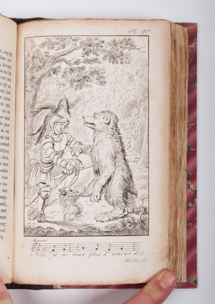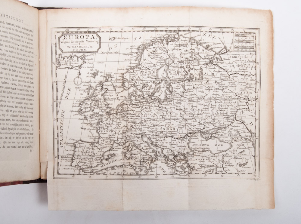 4 parts. 8vo., half-leather with marbled cartonnized sides. Incl. portrait of the author, 4 ill. frontispieces and all prints and maps, incl. the map of Europe in the shape of a woman (this map is usually missing!). Full list of subscribers in the back of part 4.